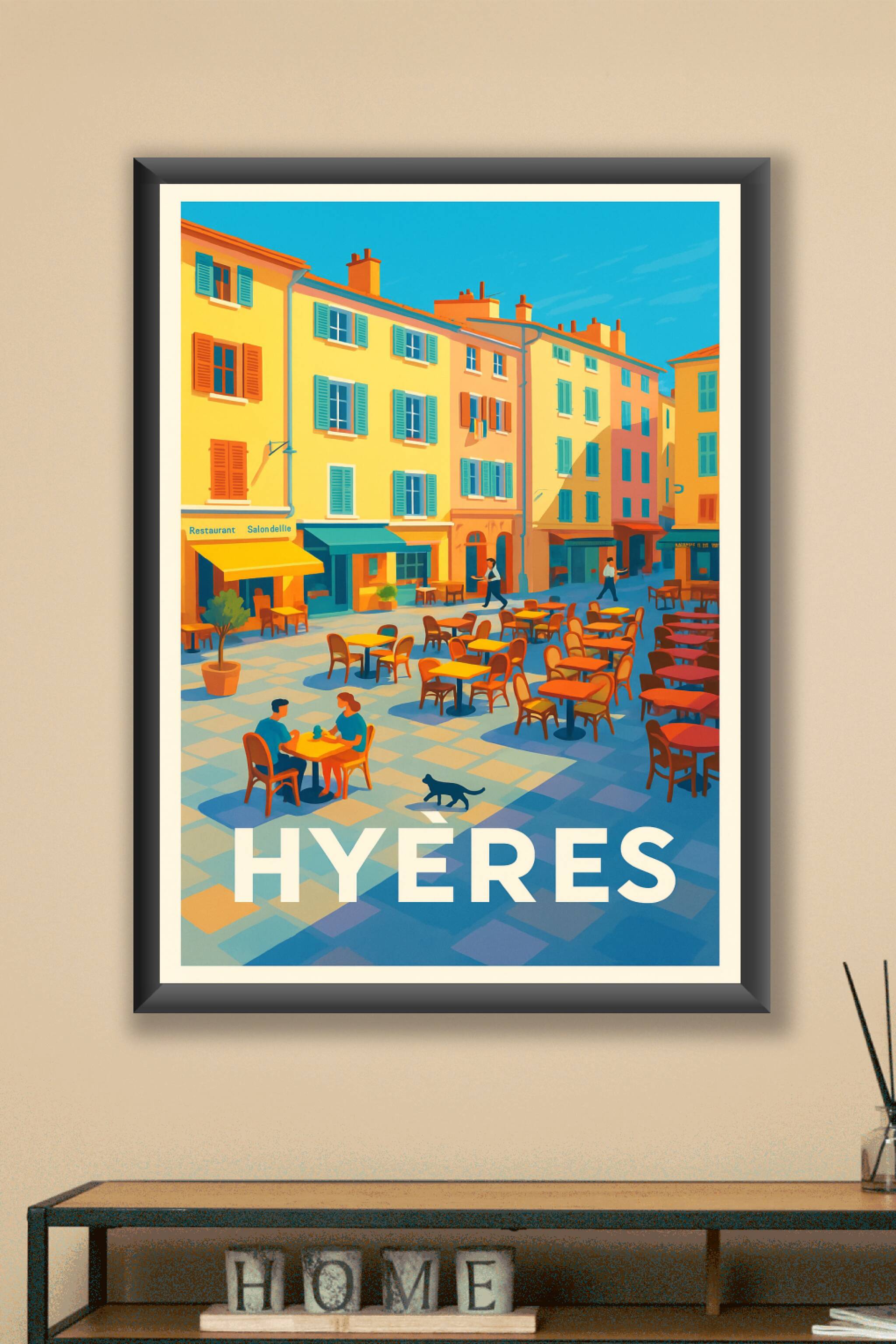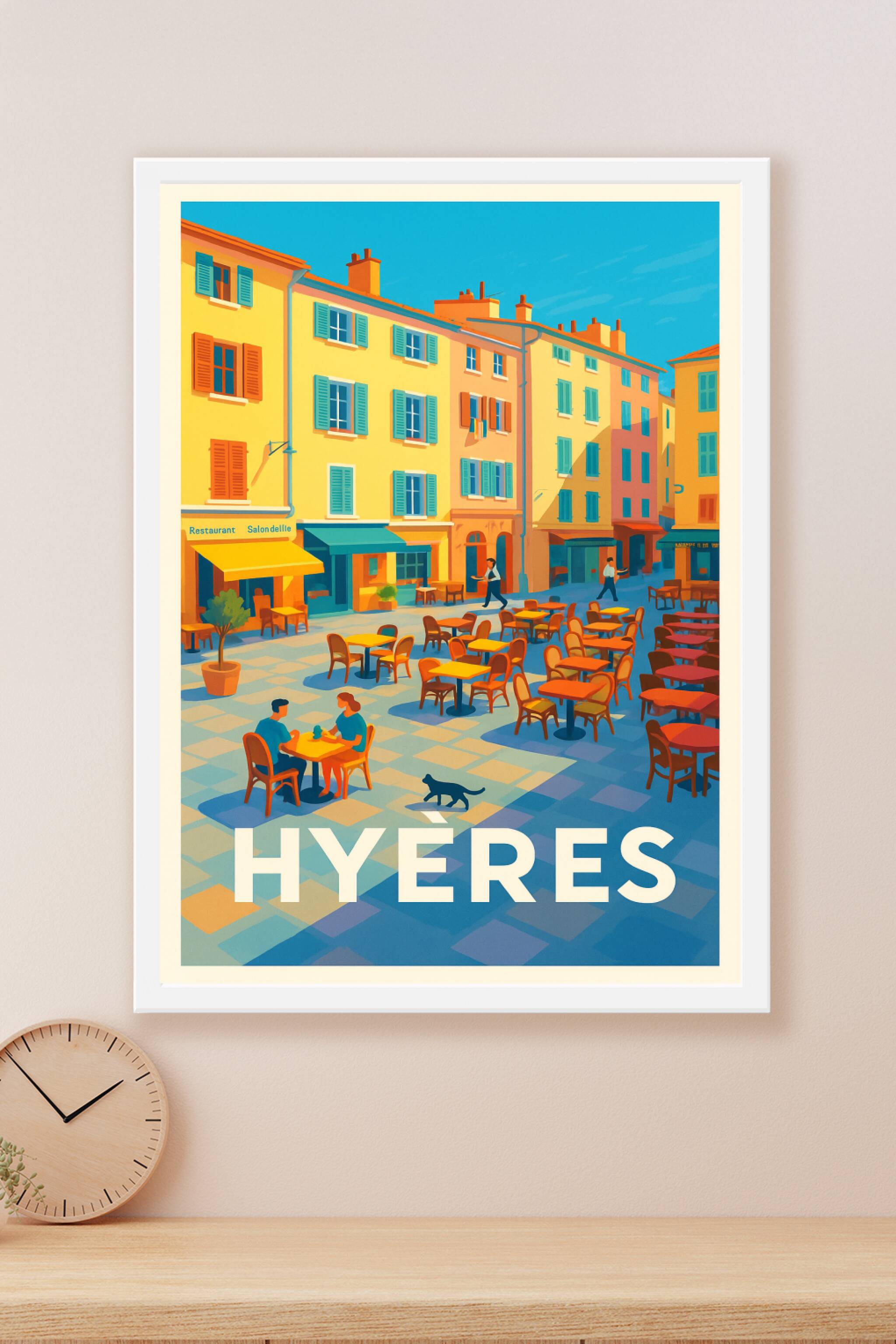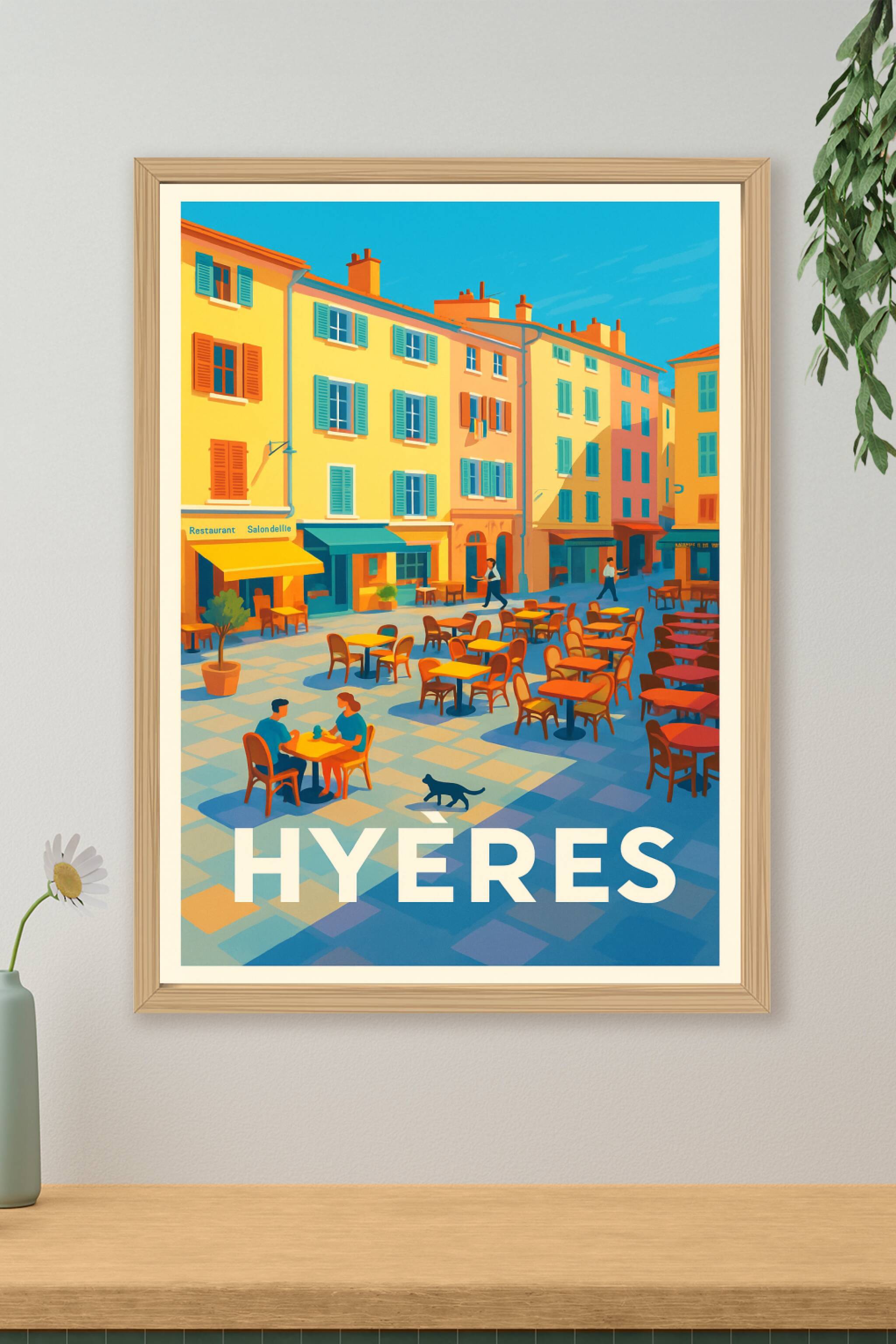 Laissez-vous séduire par cette affiche illustrée de Hyères, capturant l’ambiance paisible d’une place ensoleillée où terrasses colorées et façades ...