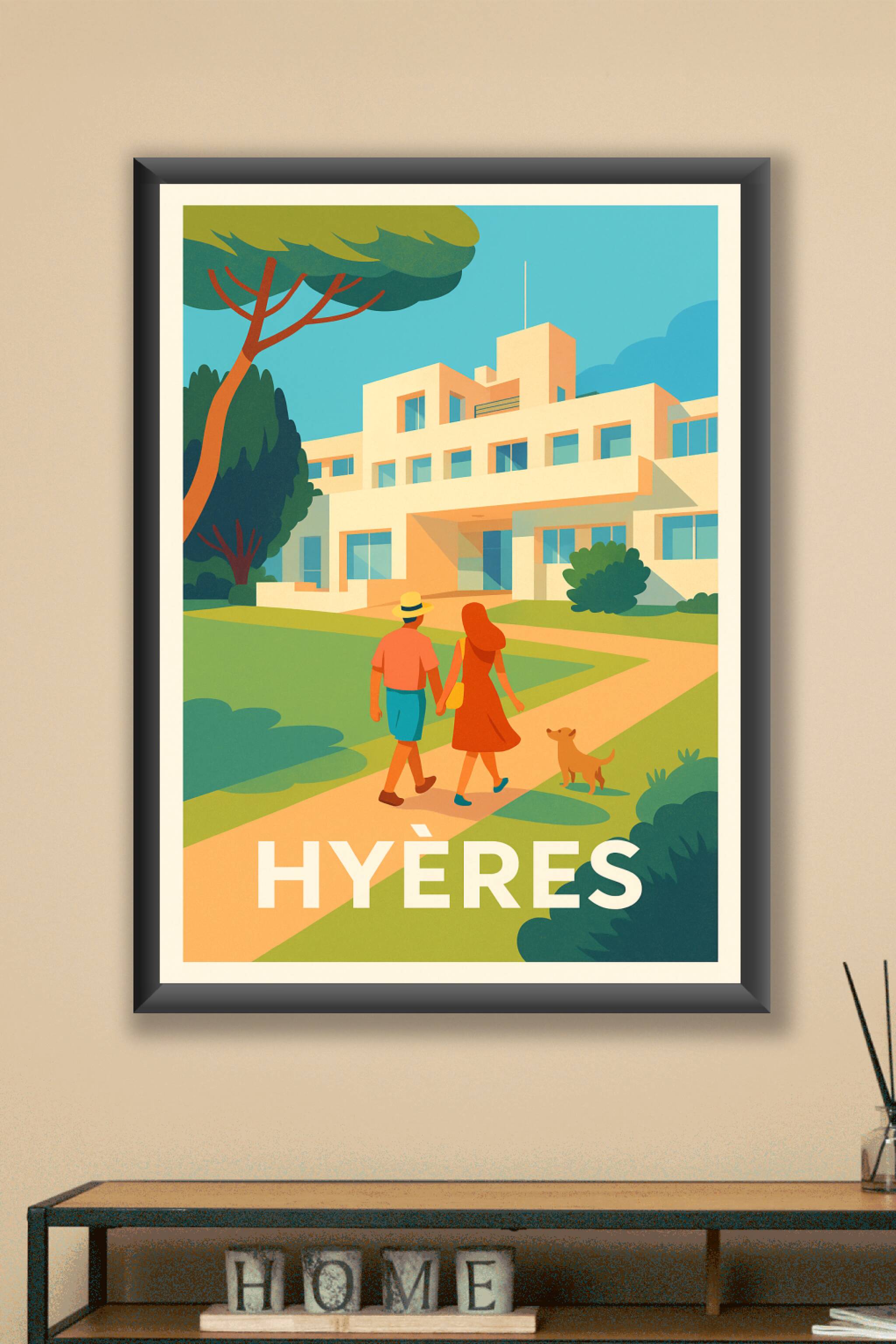 Découvrez le charme rétro-moderne de la ville d'Hyères avec cette affiche illustrée représentant la célèbre Villa Noailles, joyau de l’architecture...
