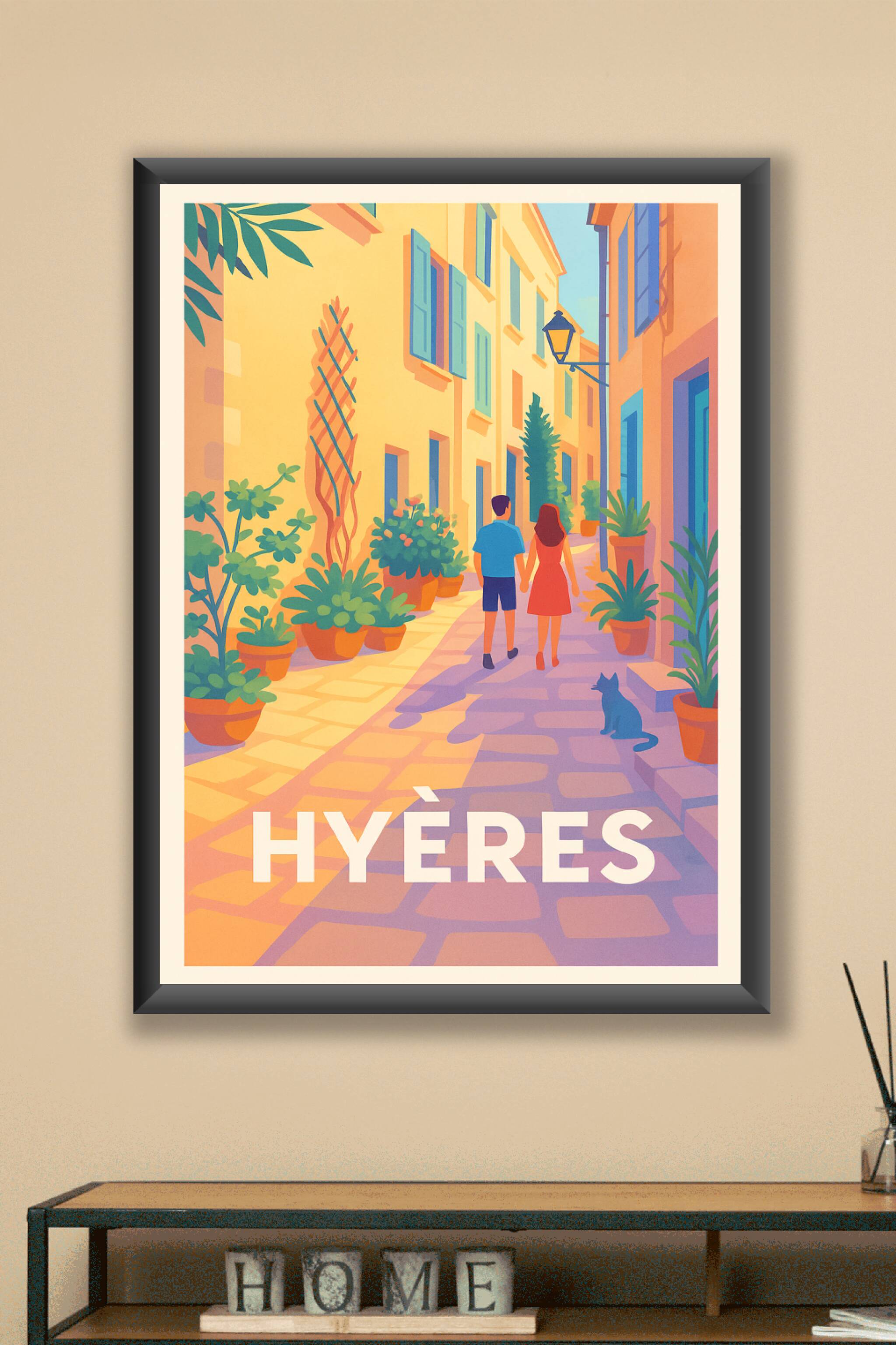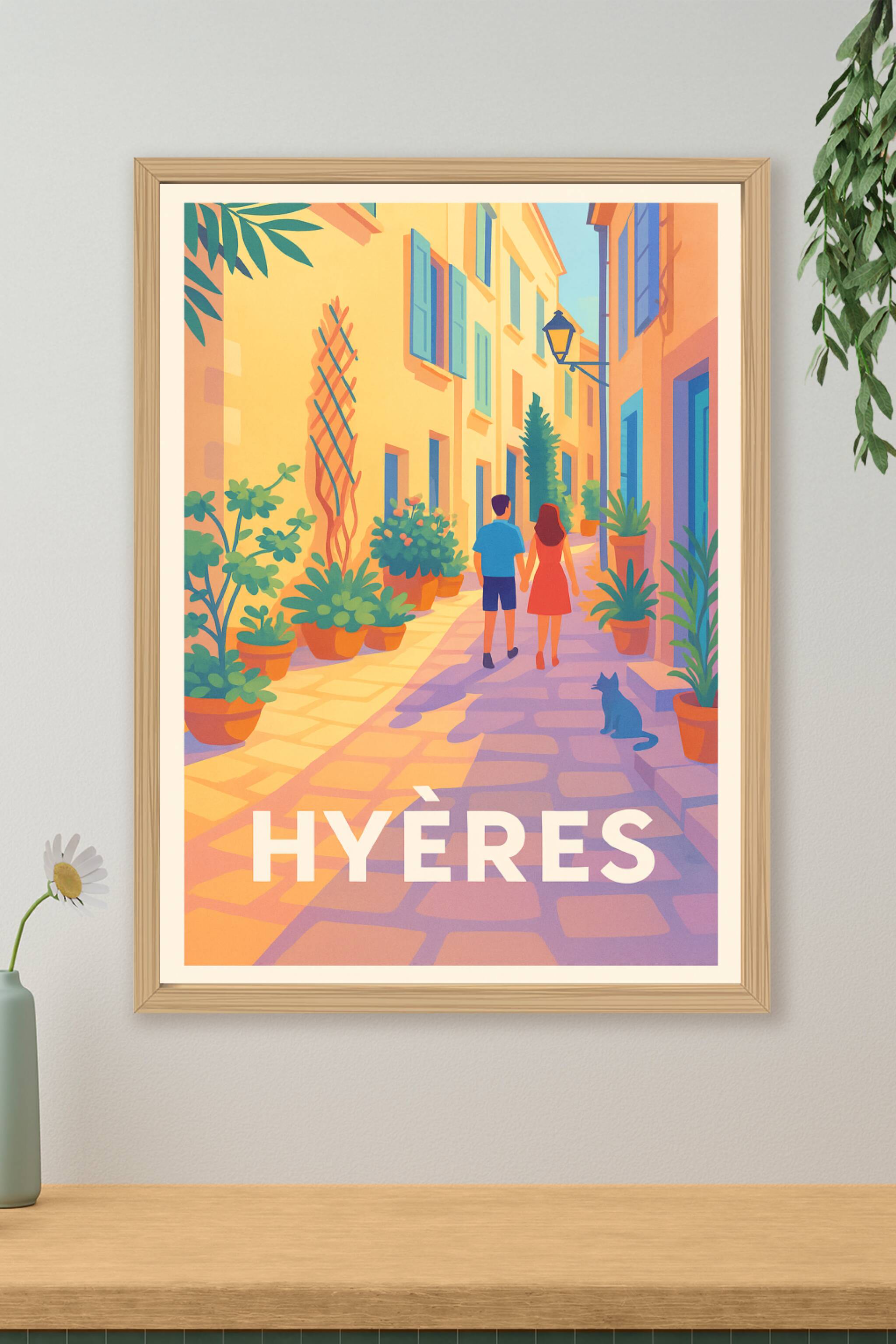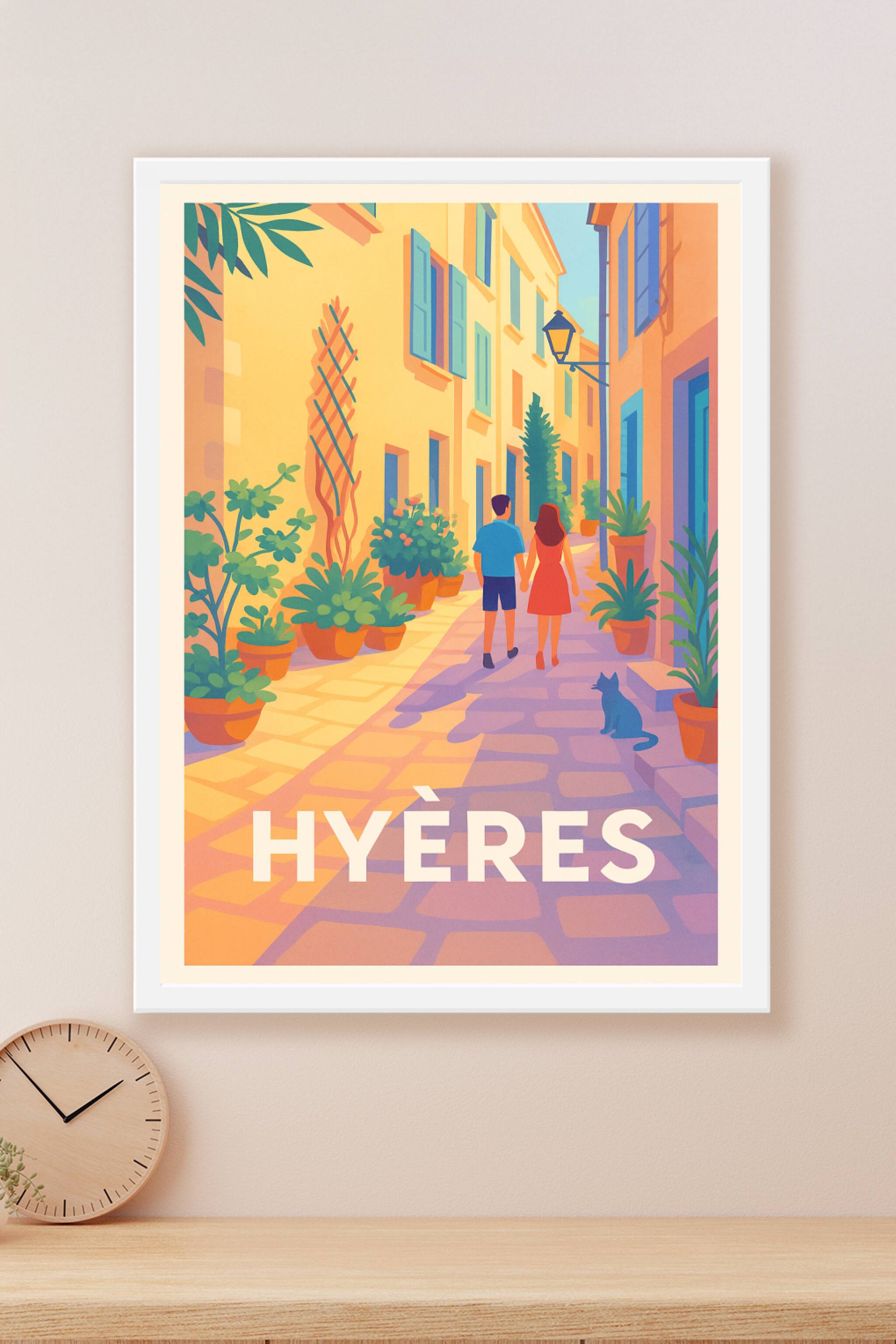 Découvrez le charme lumineux de la Côte d’Azur avec cette affiche d’Hyères, illustrant une douce balade dans les ruelles pavées typiques de la vill...