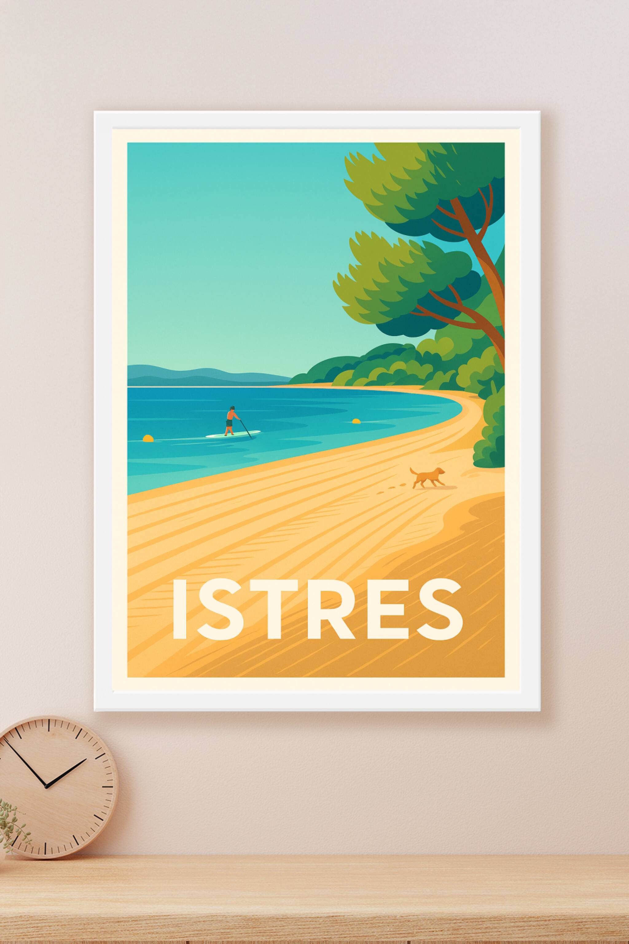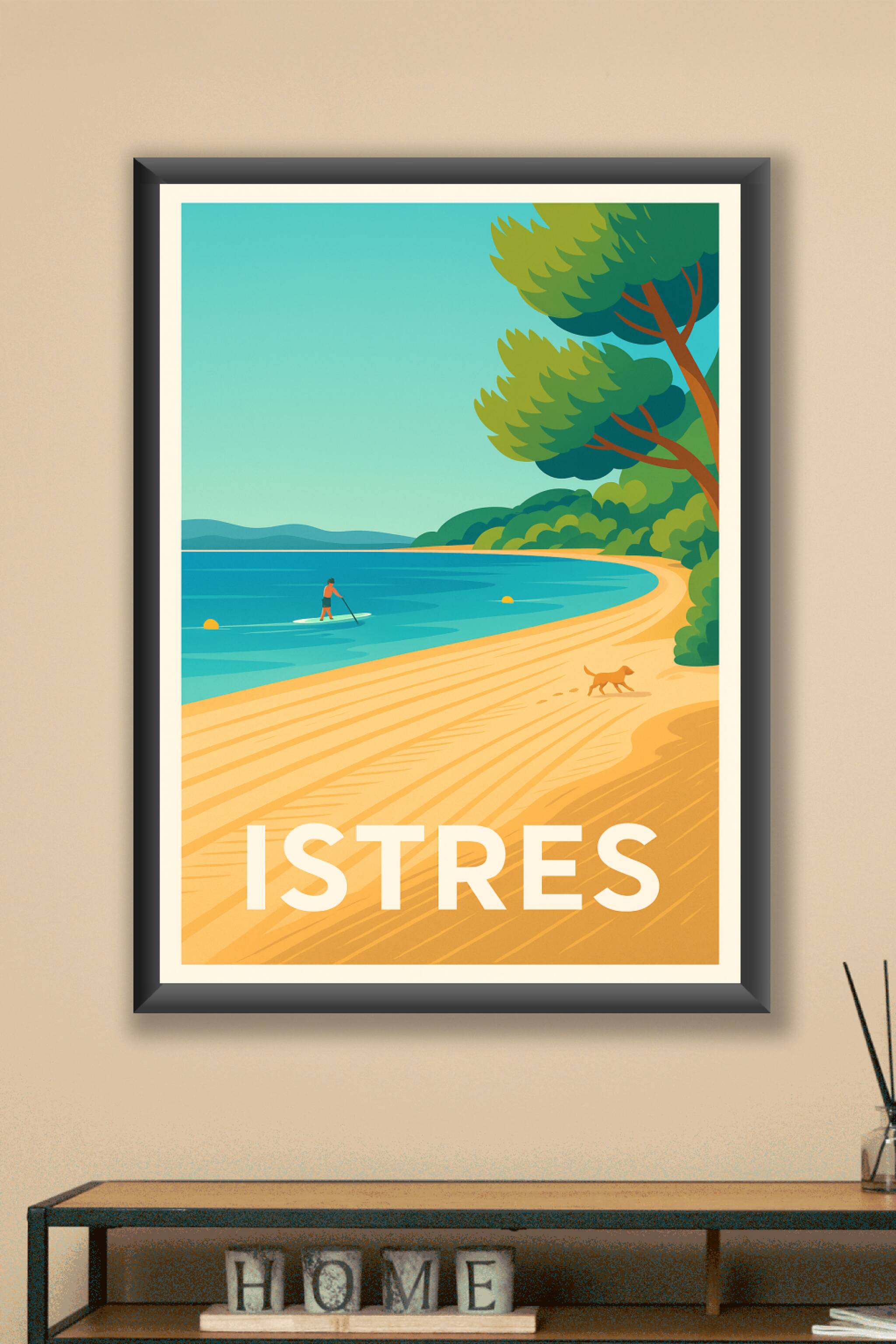 Découvrez la douceur de vivre d'Istres avec cette affiche au style épuré et lumineux, mettant en scène une plage paisible bordée d'une eau turquois...