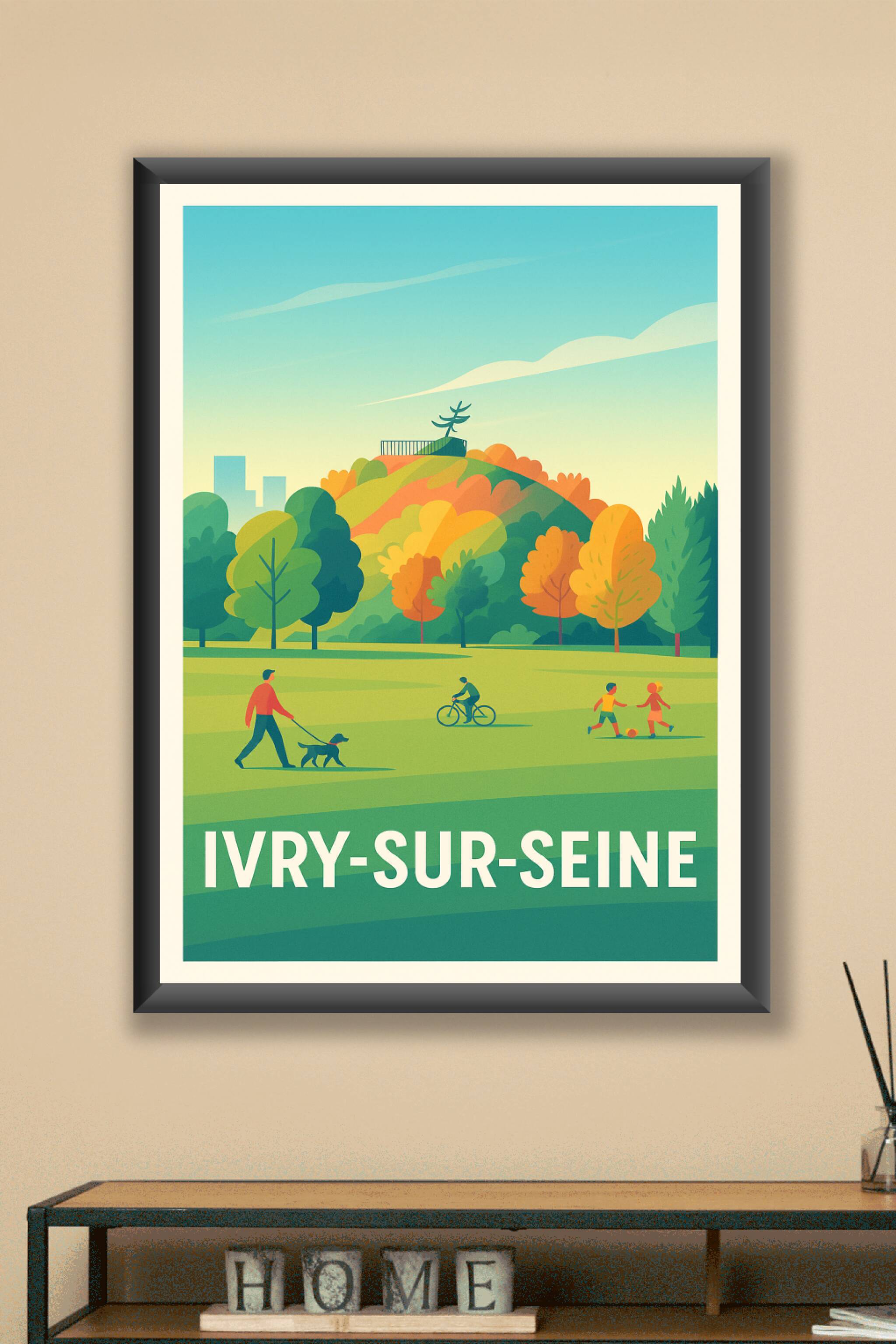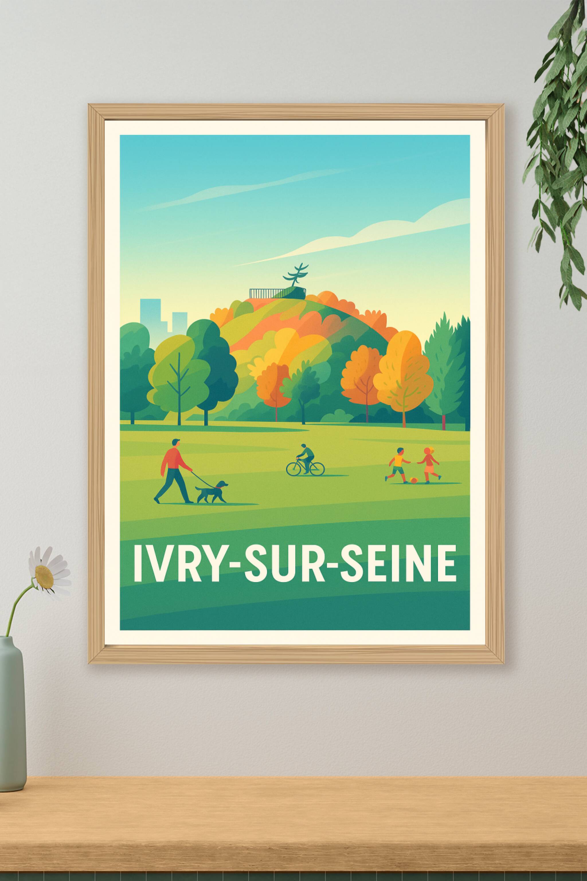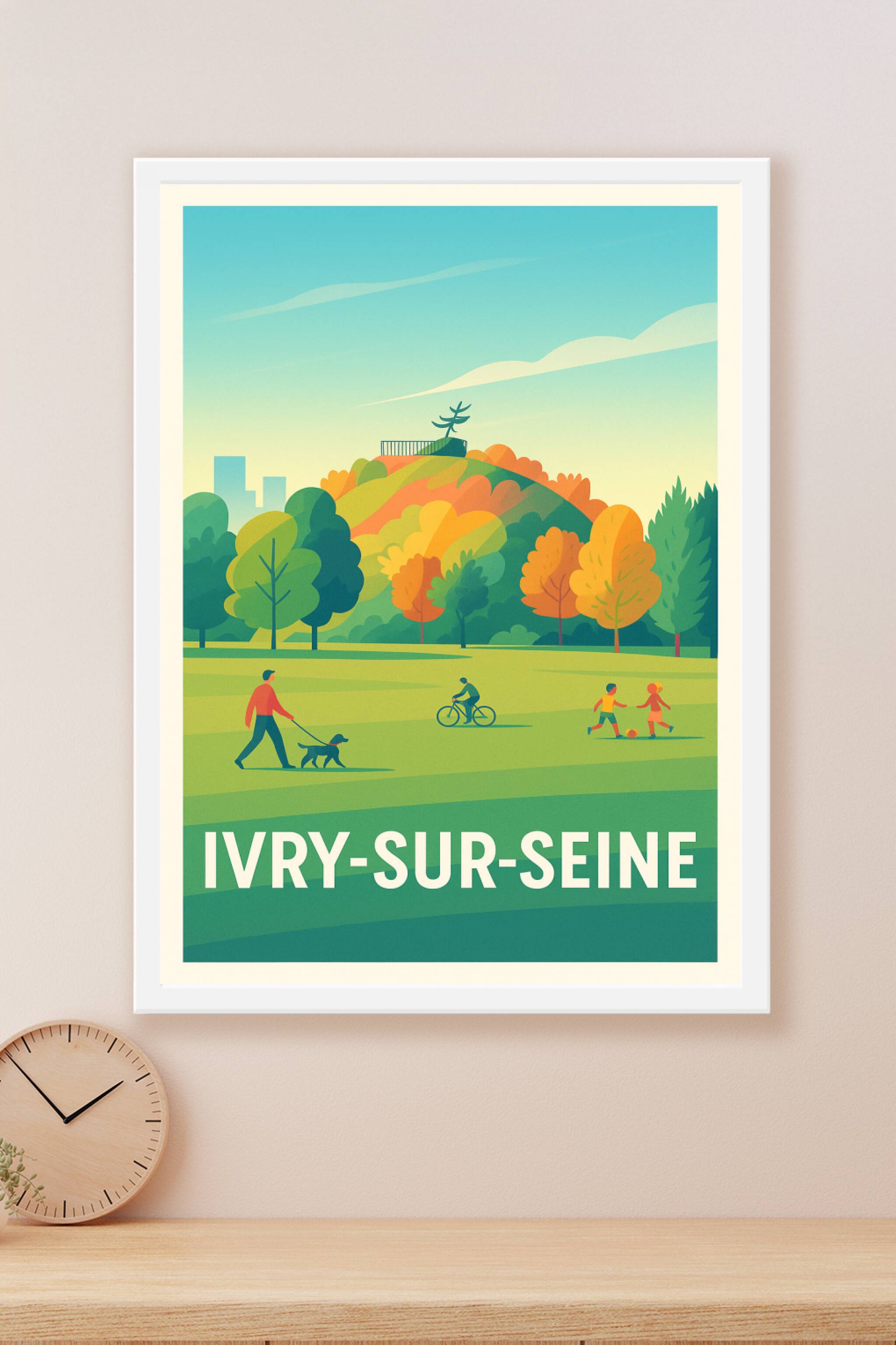 Apportez une bouffée d'air frais à votre intérieur avec cette affiche illustrée d'Ivry-sur-Seine, mettant en scène un parc paisible aux couleurs au...