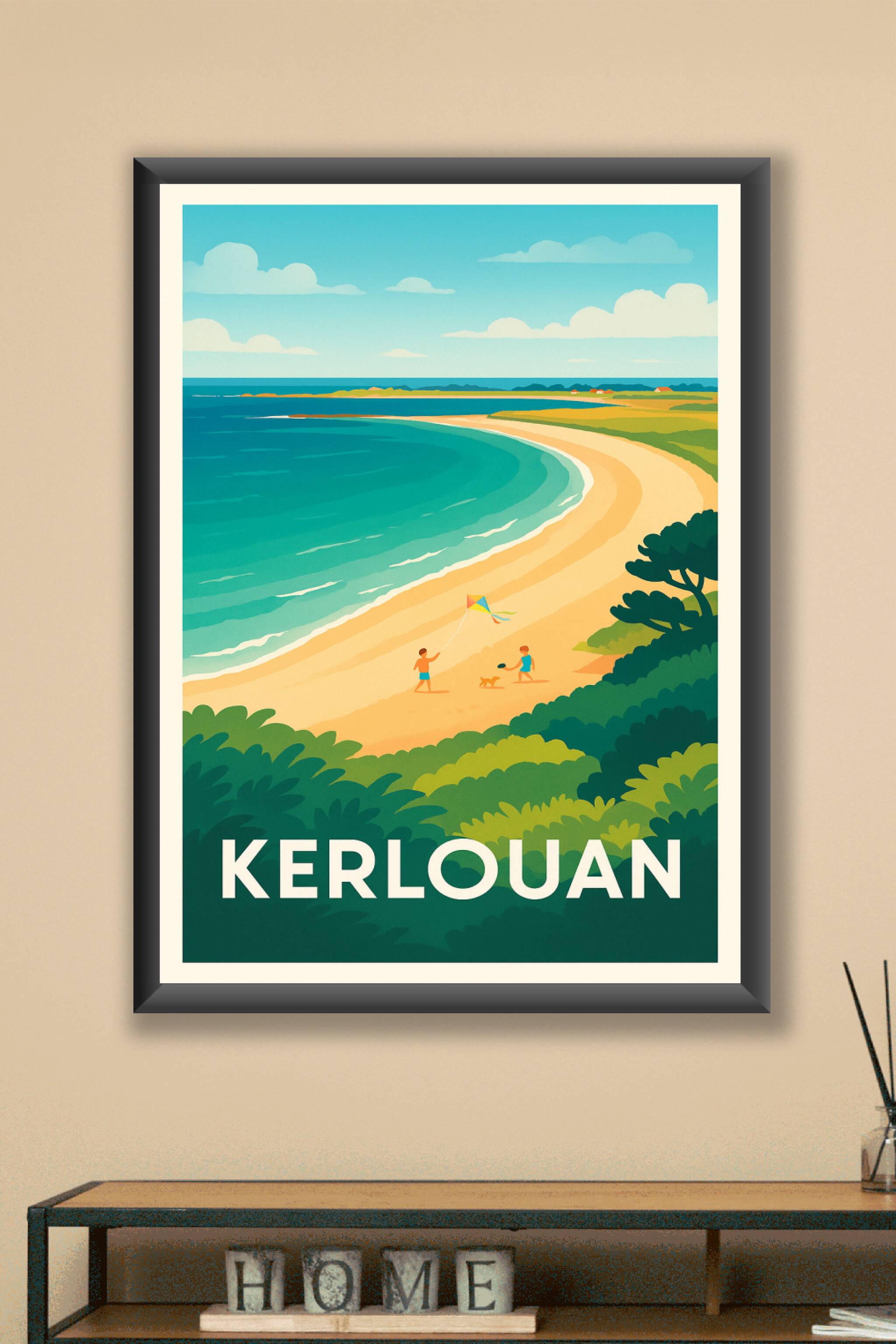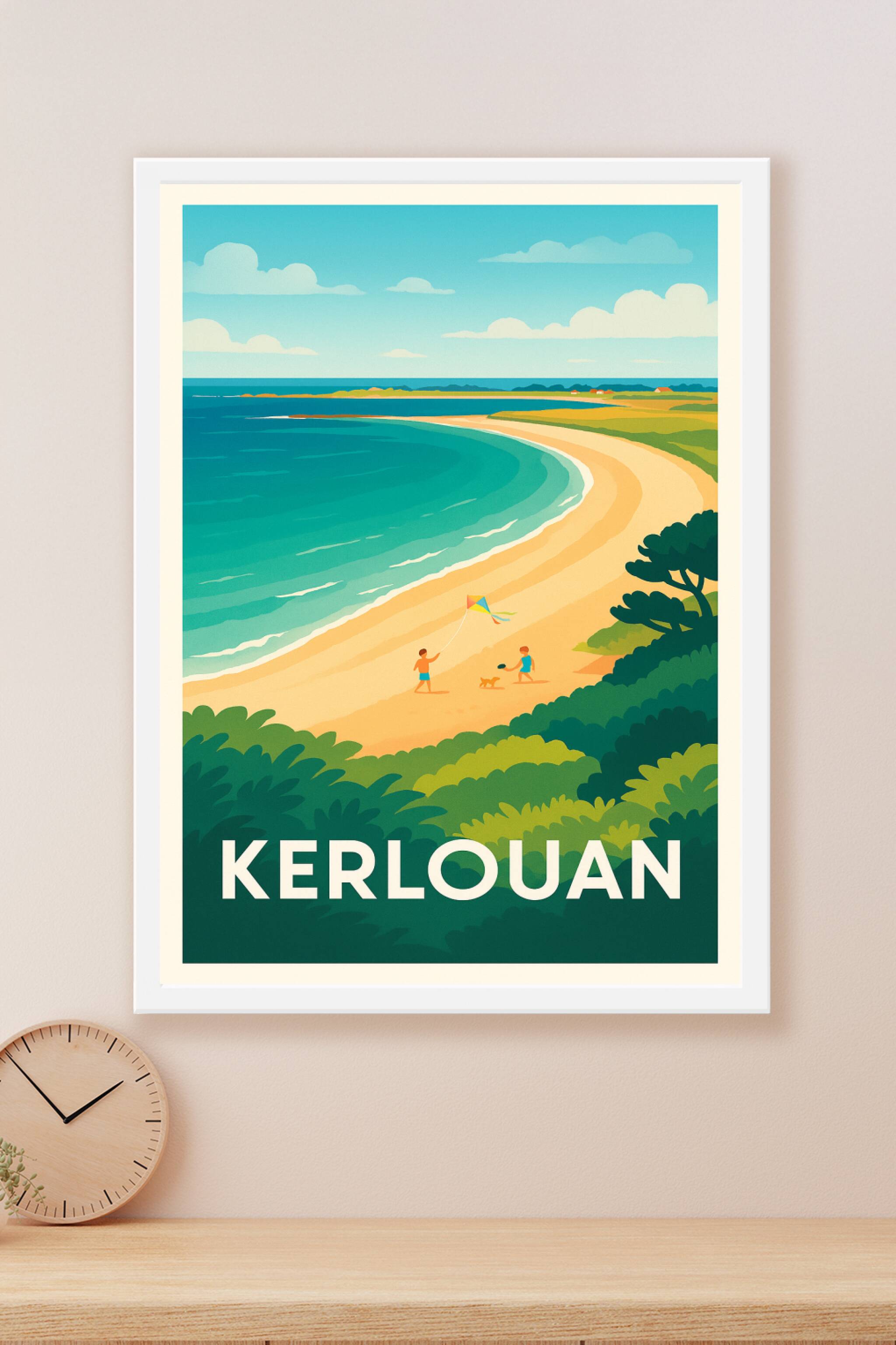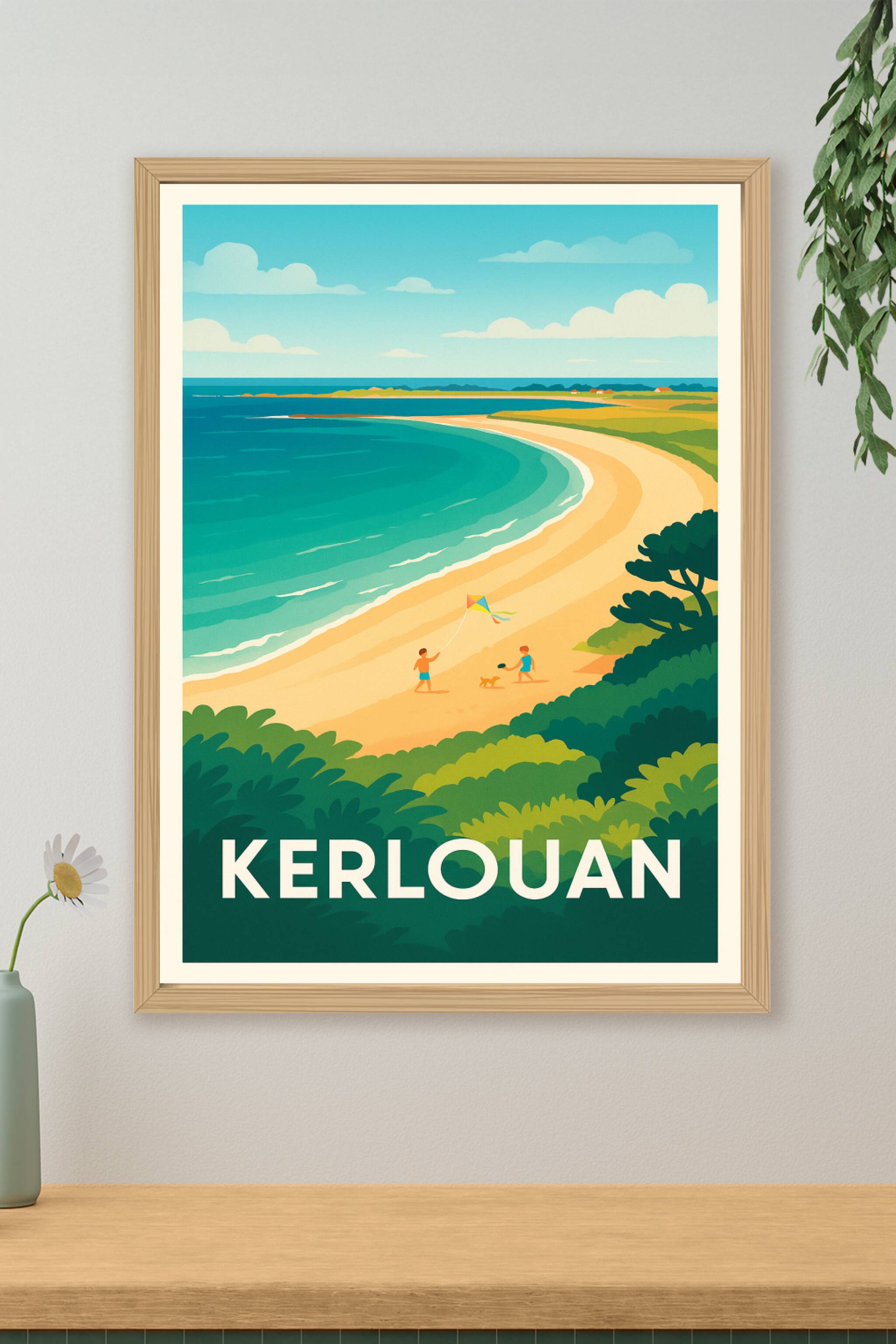 Redécouvrez le charme sauvage des plages bretonnes avec cette affiche illustrée de Kerlouan. Une scène estivale paisible où les dunes dorées rencon...