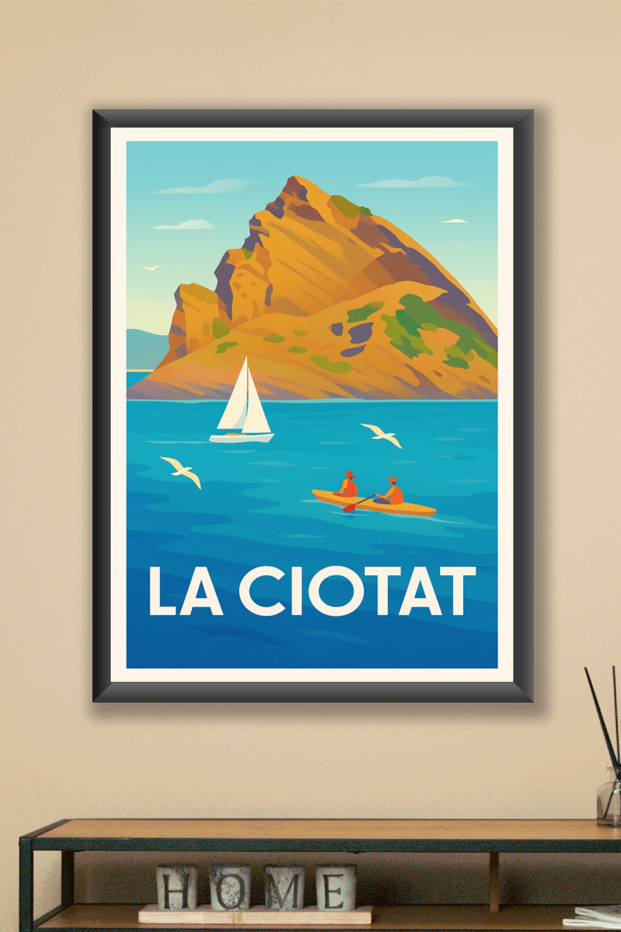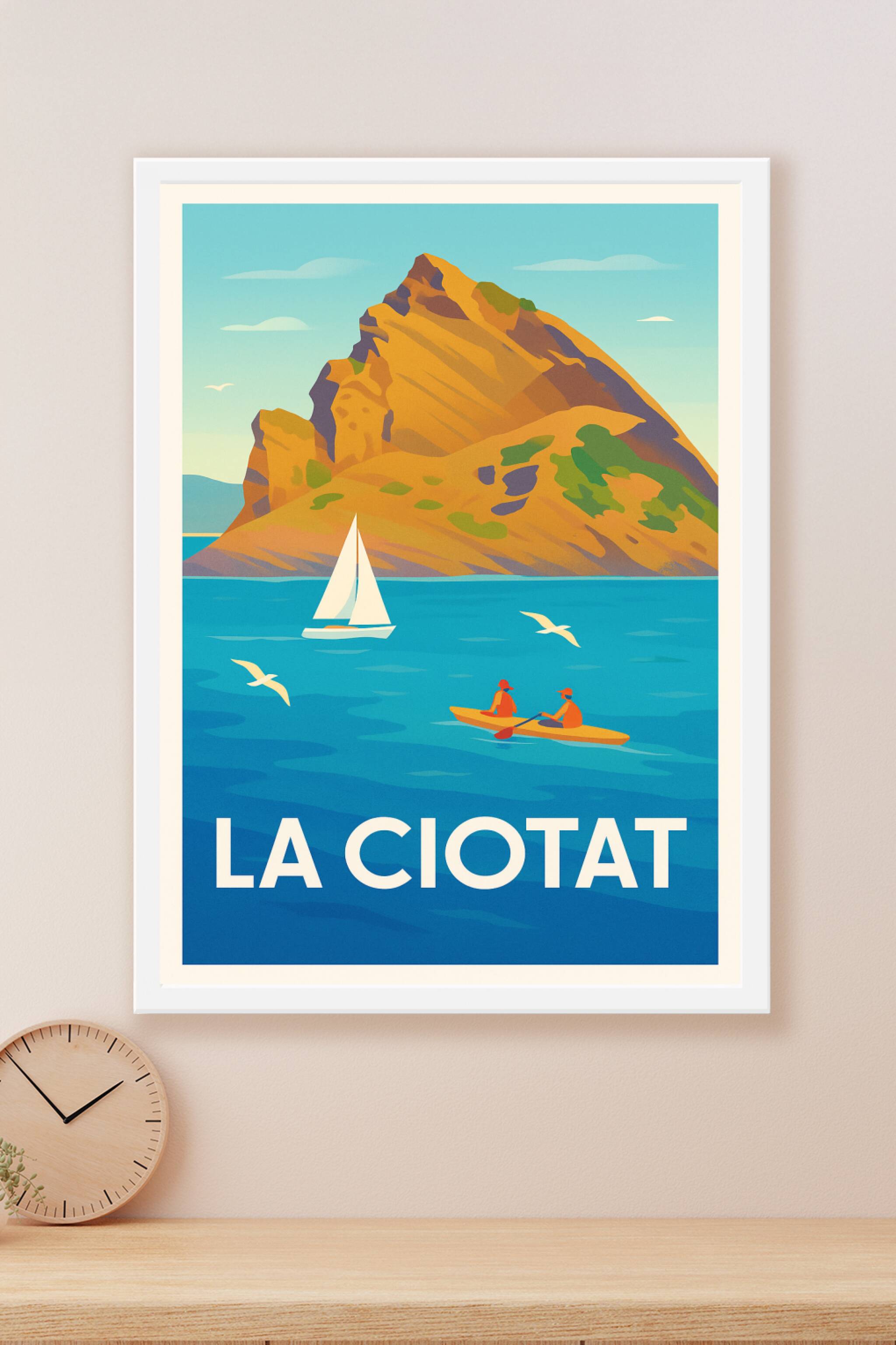 Apportez une touche de quiétude méditerranéenne à votre intérieur avec cette affiche vintage mettant en scène les eaux bleues de La Ciotat, un voilier et des kayakistes face au célèbre massif rocheux. Ce poster illustré, aux couleurs chaudes et apaisantes, capture l'essence des escapades nautiques et des paysages marins si emblématiques de cette charmante ville.Ce poster est imprimé en tirage "Fine Art" sur papier 305g coton, garantissant une qualité d'impression exceptionnelle et une résistance durable. Disponible en plusieurs tailles, du A1 au A4, avec ou sans cadre, cette affiche s'adapte à tous les styles de décoration. Sublimez votre maison ou offrez ce souvenir raffiné à un passionné de la Côte d'Azur grâce à cette création artisanale 100% française.