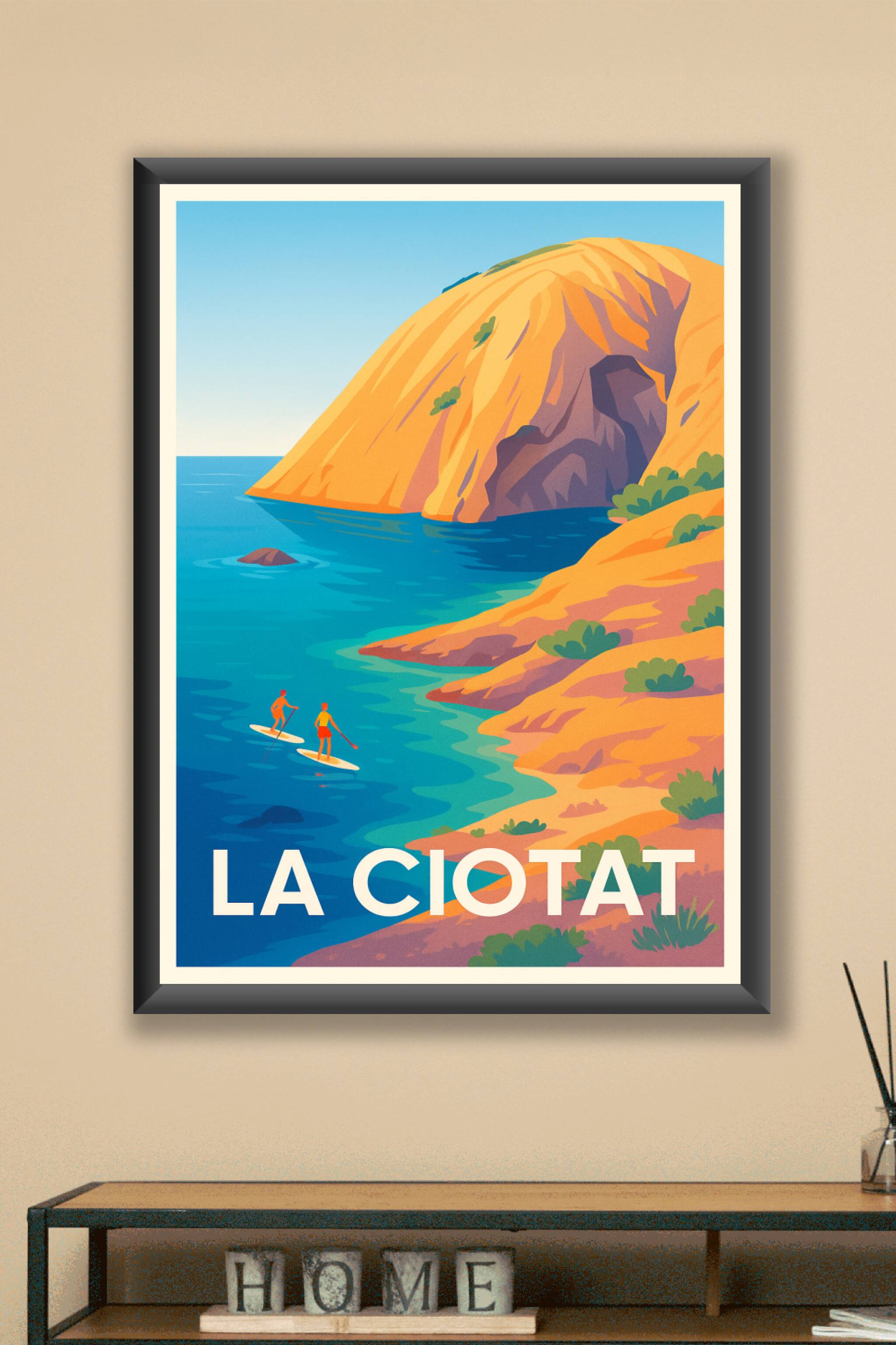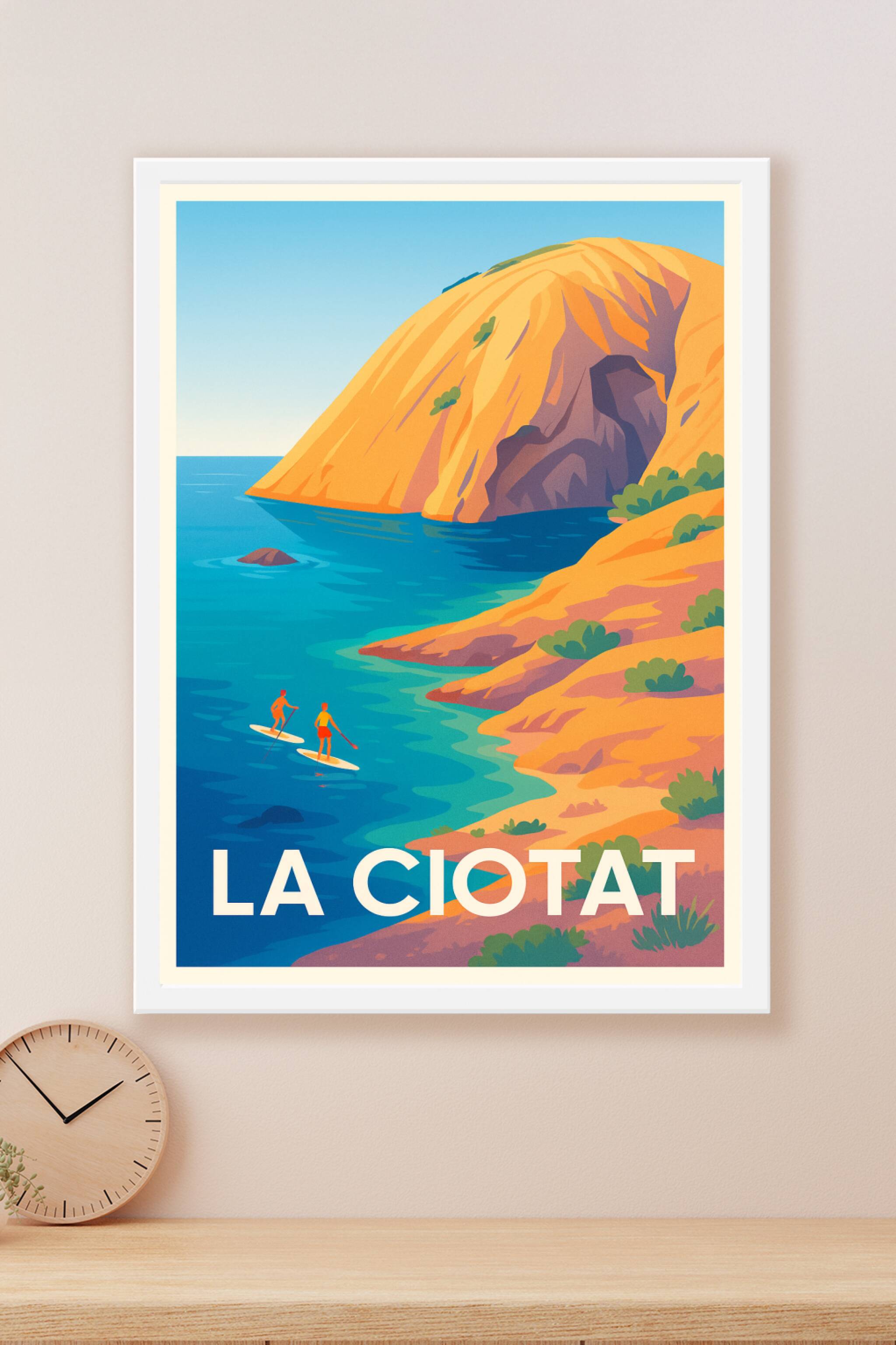Découvrez la beauté sauvage et apaisante de La Ciotat avec cette affiche illustrée illustrant ses falaises dorées et ses eaux turquoise où deux pad...