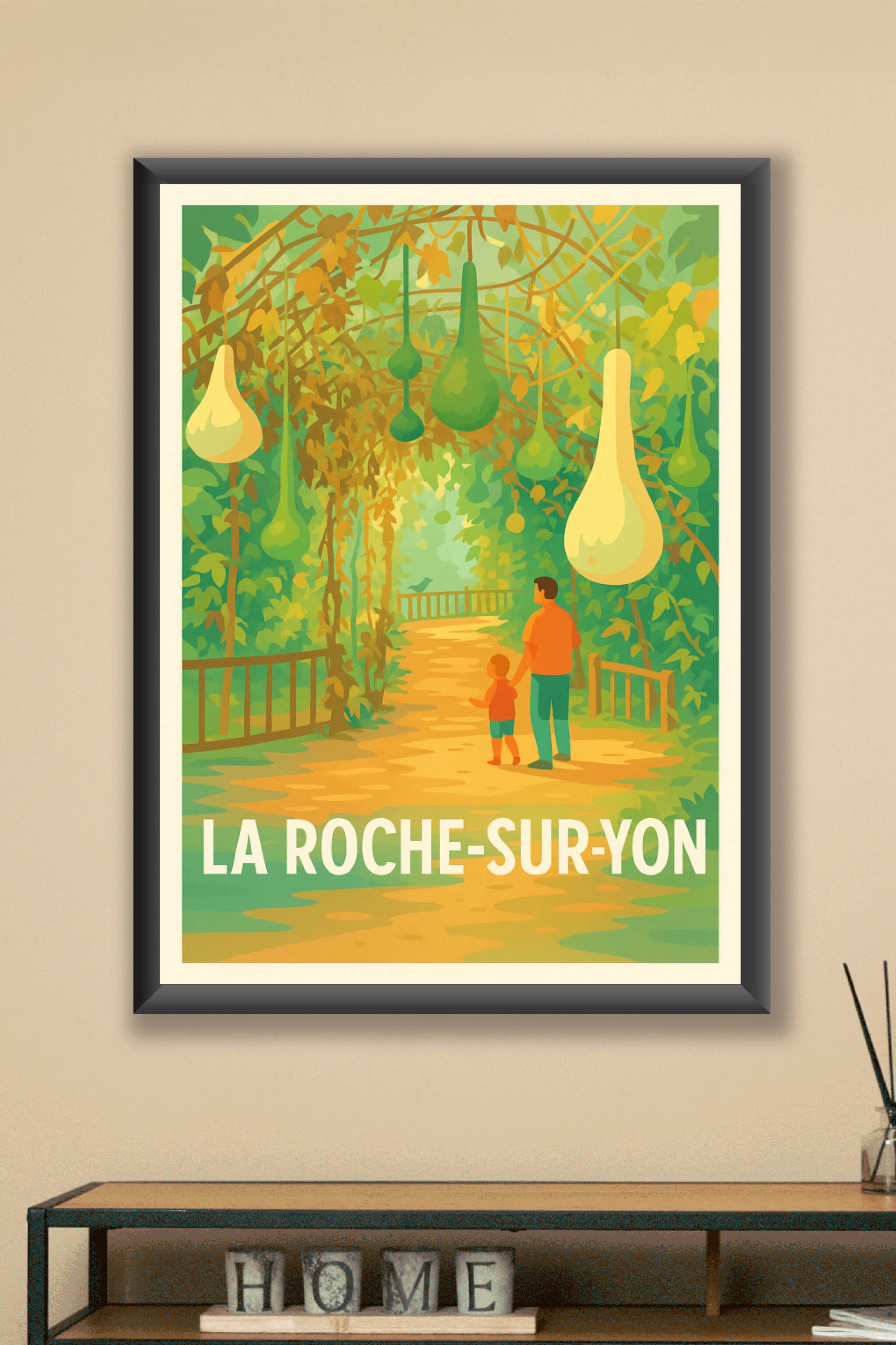 Découvrez la douceur et la sérénité de La Roche-sur-Yon avec cette affiche illustrée qui capture une promenade empreinte de calme, bercée par une végétation luxuriante et ses étranges fruits suspendus. Ce poster, au style chaleureux et coloré, évoque un instant de complicité entre un parent et son enfant au cœur d'un décor naturel, parfait pour apporter une touche de poésie à votre intérieur. Imprimé en tirage "Fine Art" sur papier 305g coton, cette affiche vous garantit une qualité d'impression exceptionnelle, aux couleurs vives et durables. Disponible en formats A1 à A4, avec ou sans cadre, ce poster s'adapte à toutes vos envies décoratives et devient une idée cadeau idéale pour les amoureux de La Roche-sur-Yon et de ses paysages uniques.