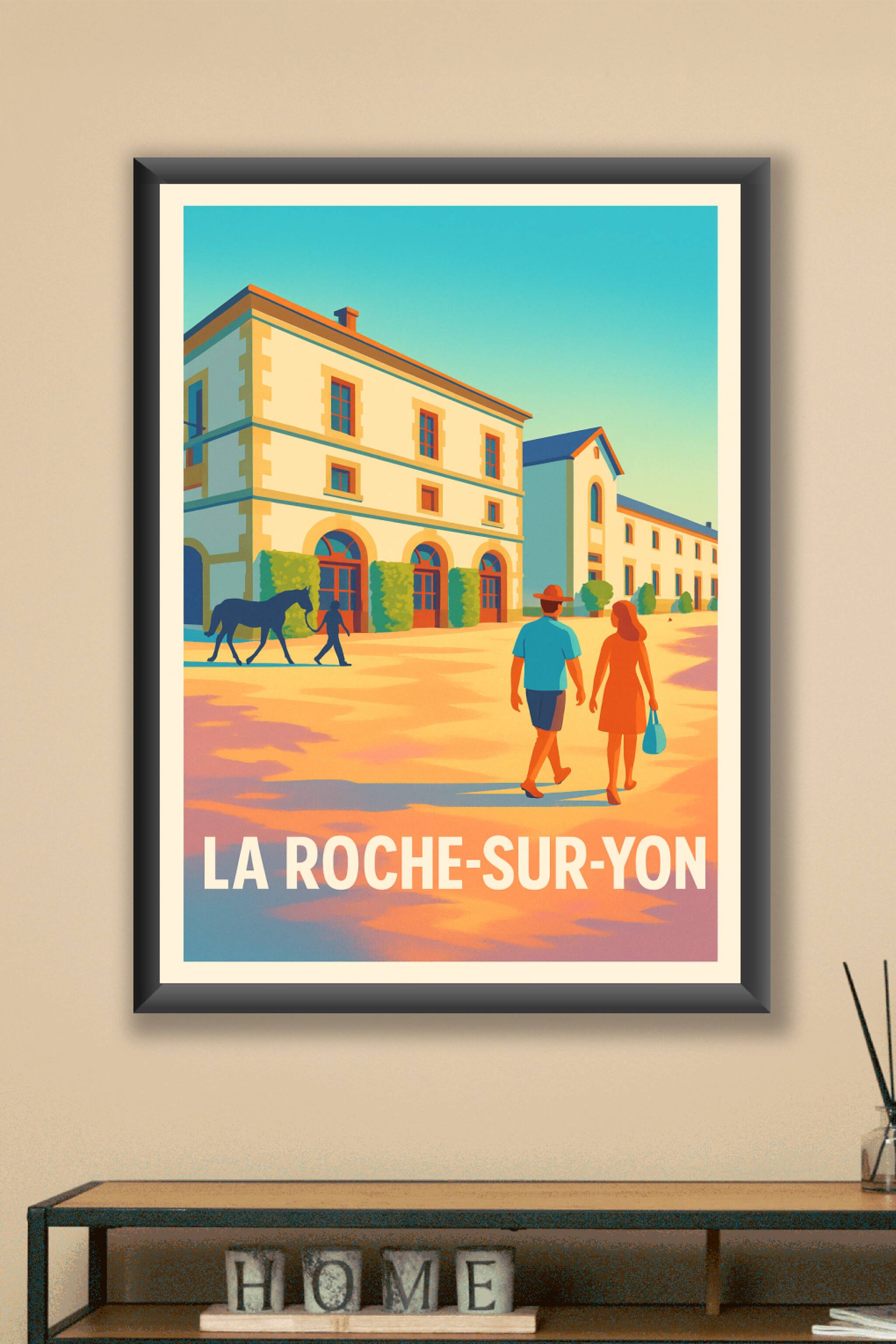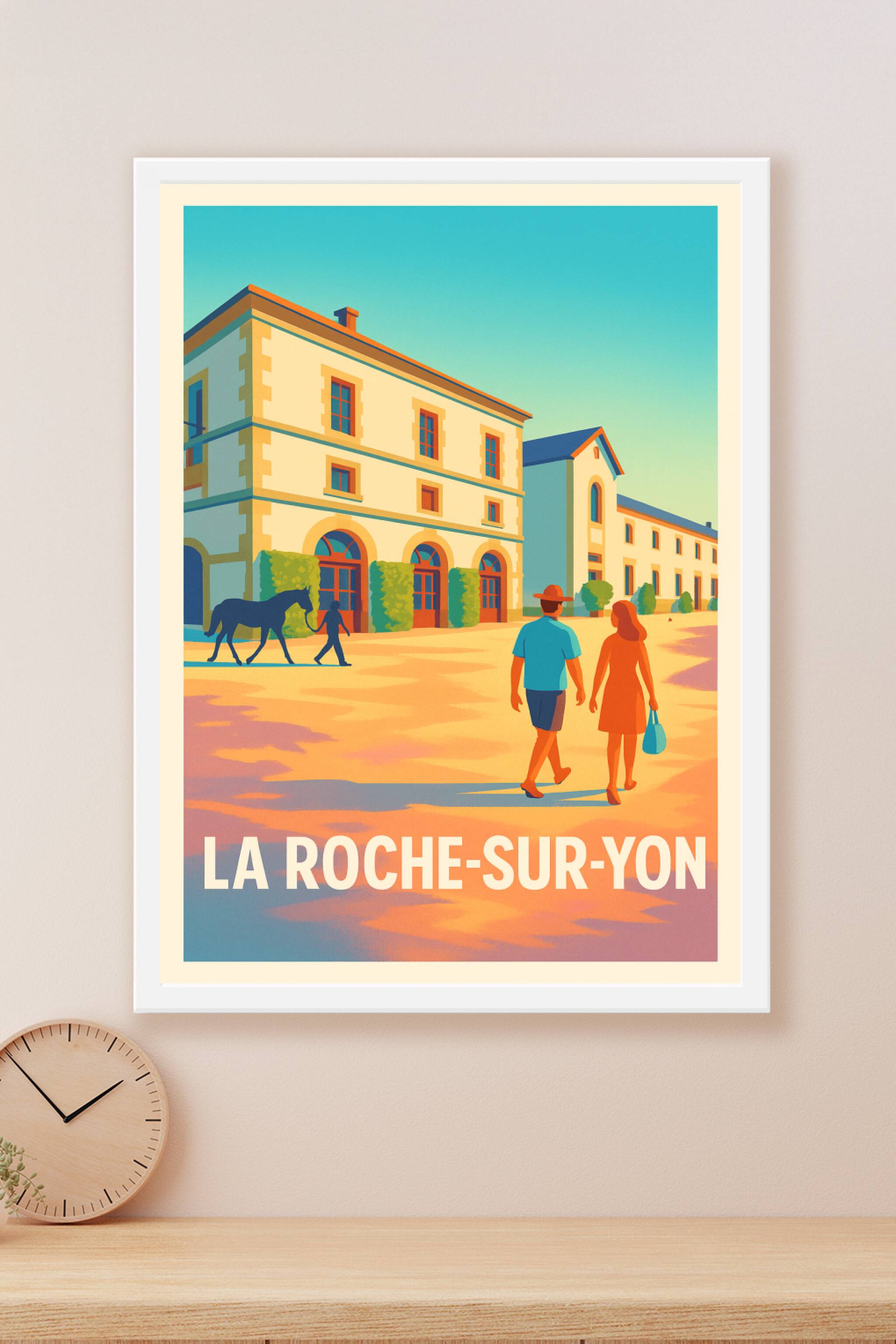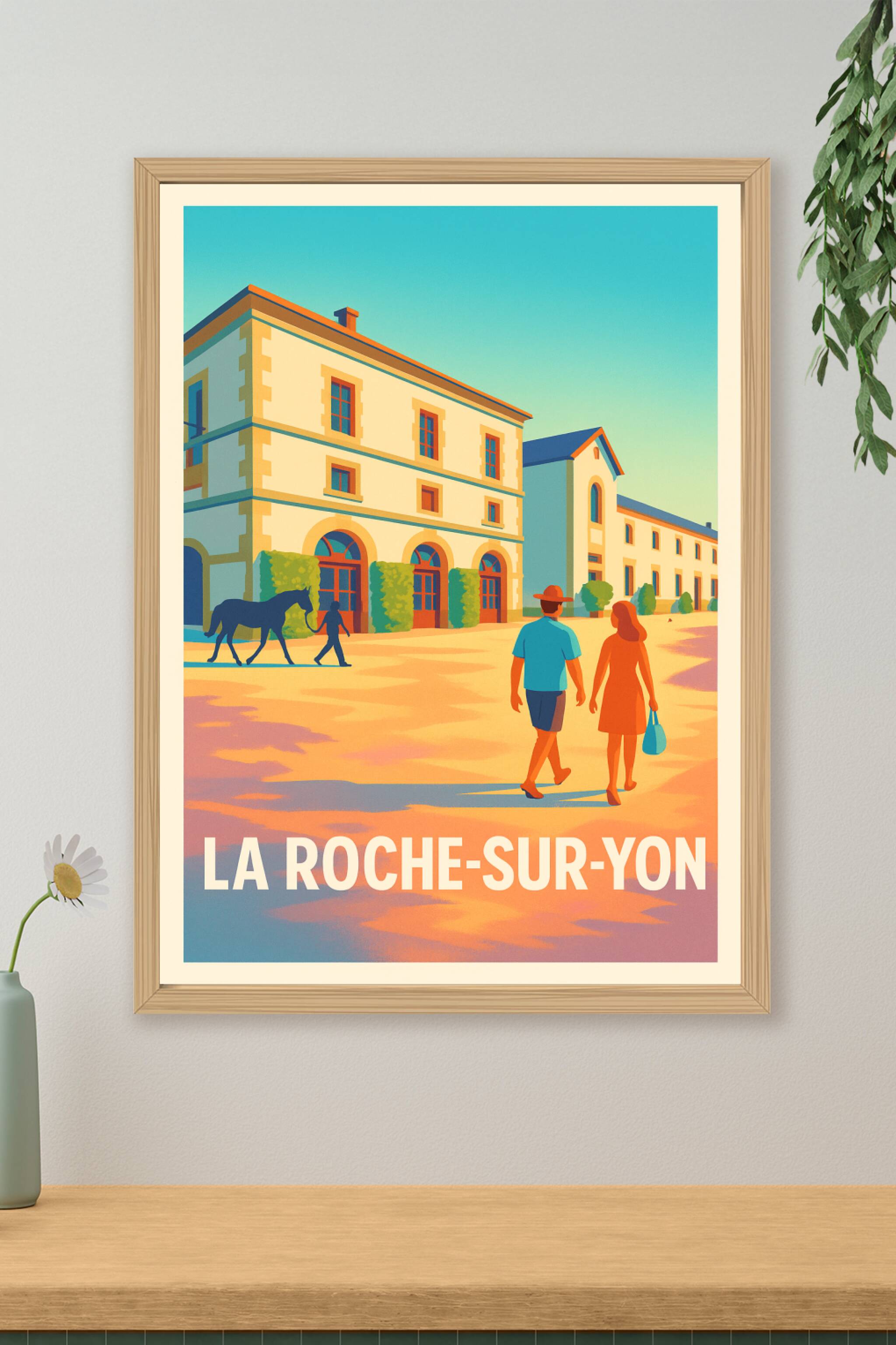 Découvrez cette affiche vintage illustrant une scène paisible et lumineuse à La Roche-sur-Yon, avec ses bâtiments élégants et ses personnages se pr...