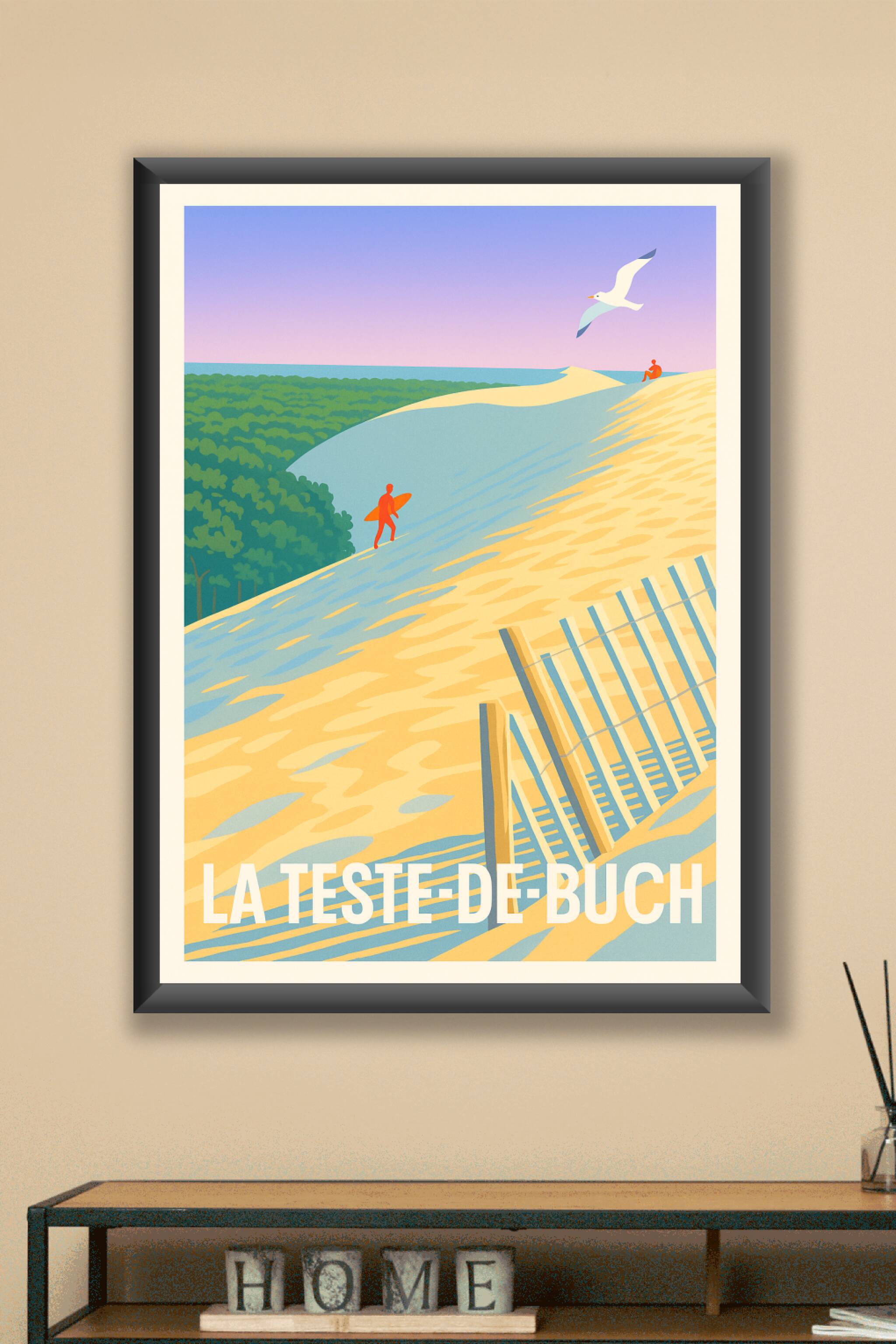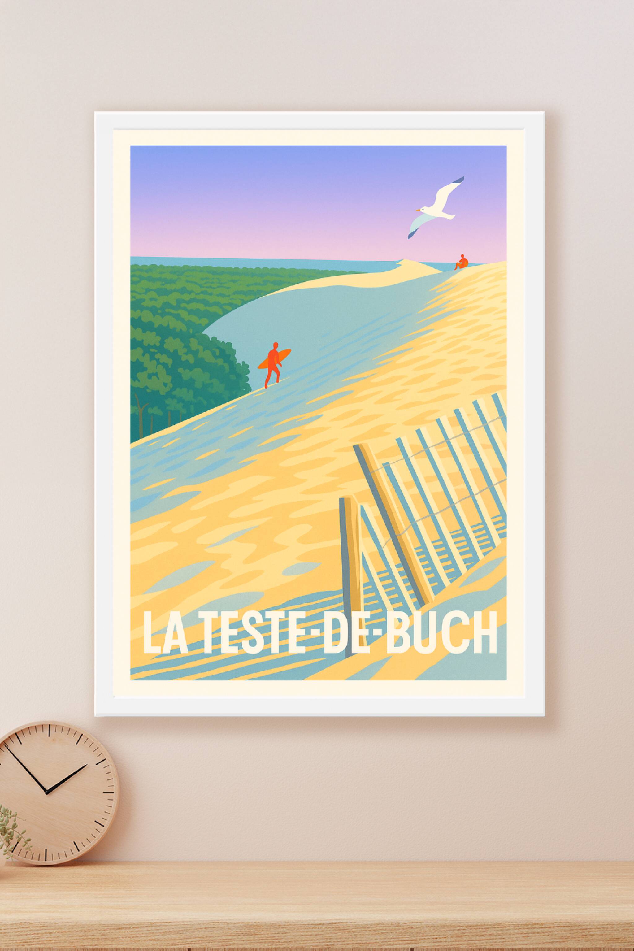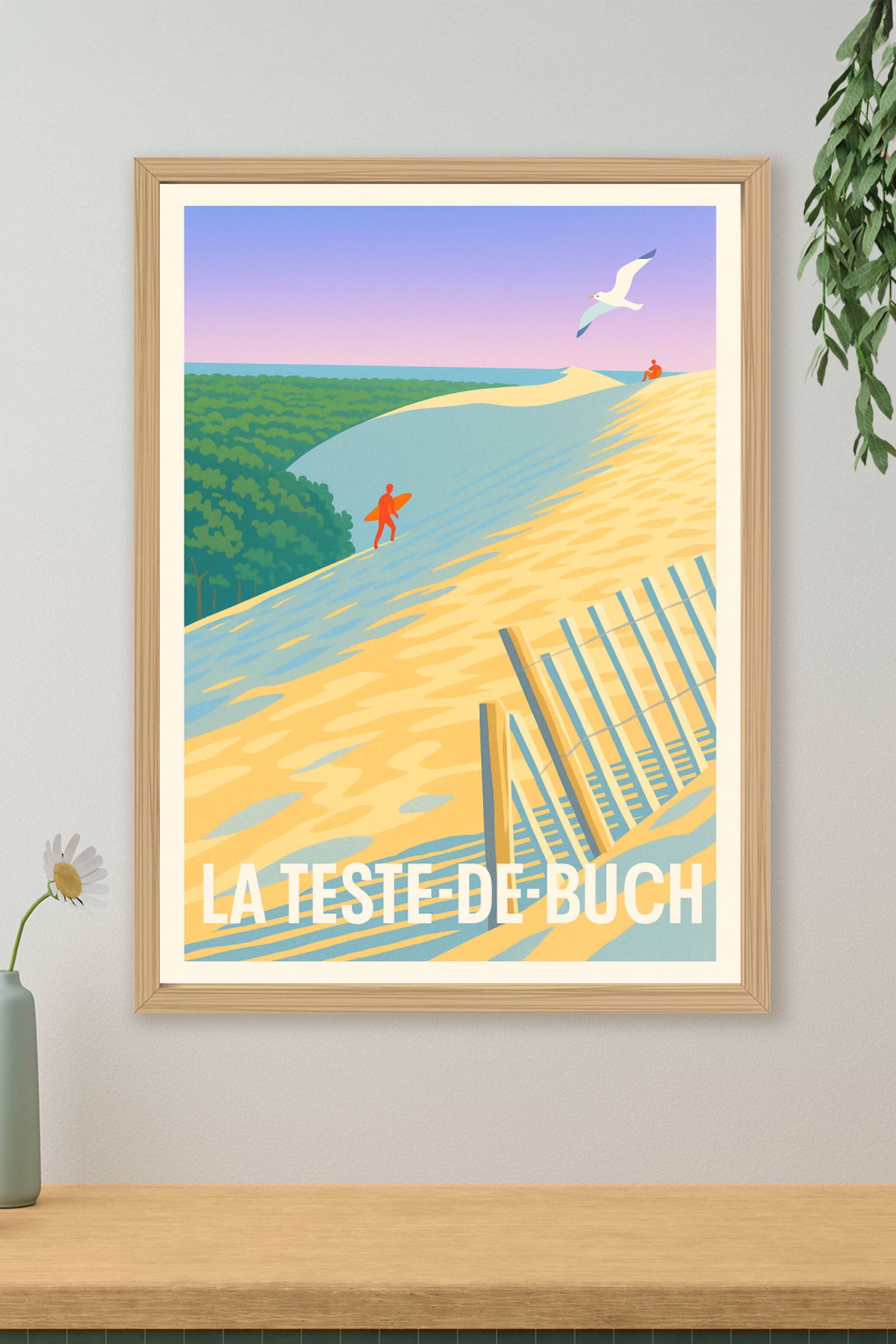 Découvrez la beauté naturelle de La Teste-de-Buch avec cette affiche illustrée mettant en scène ses célèbres dunes baignées d'une lumière douce et ...