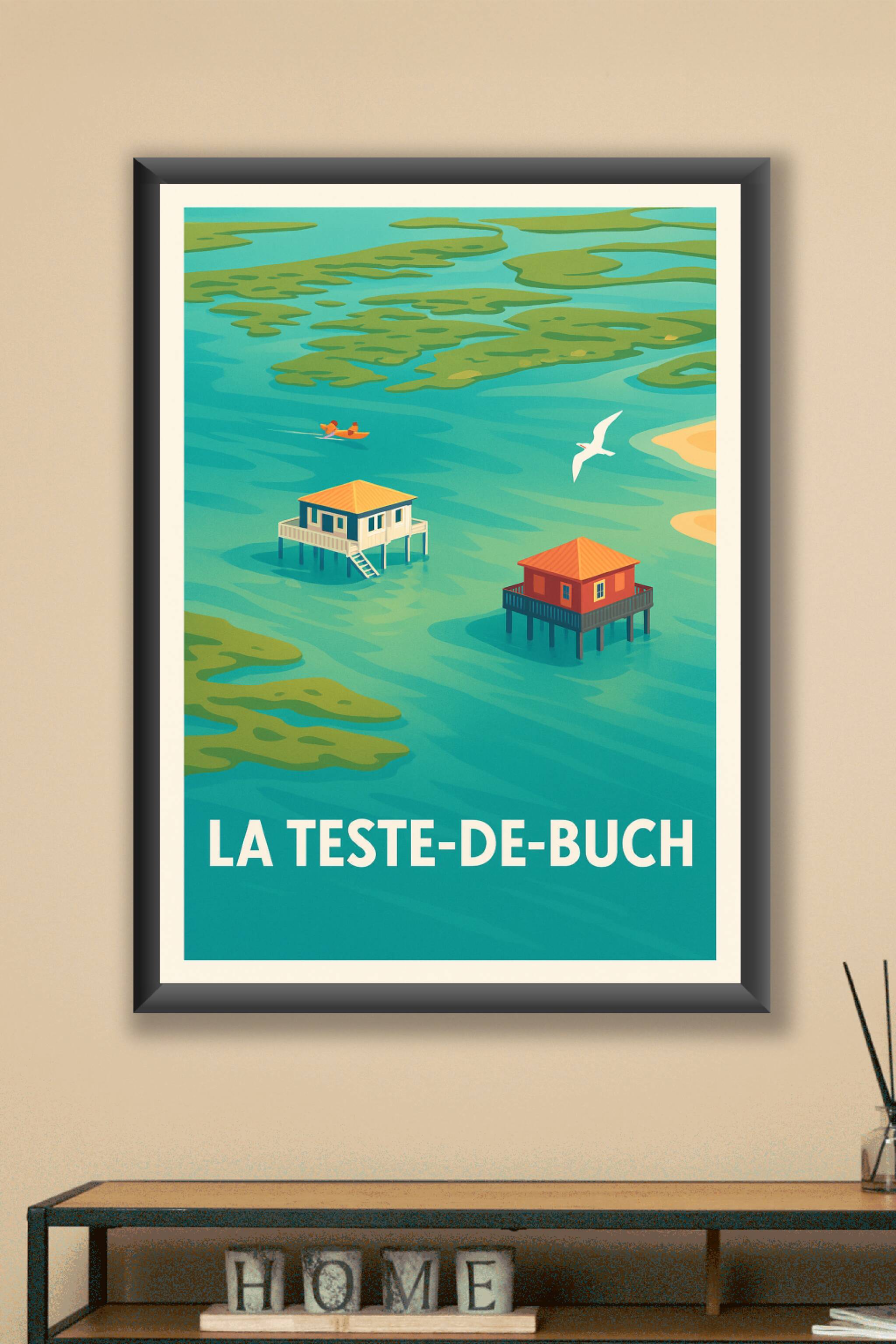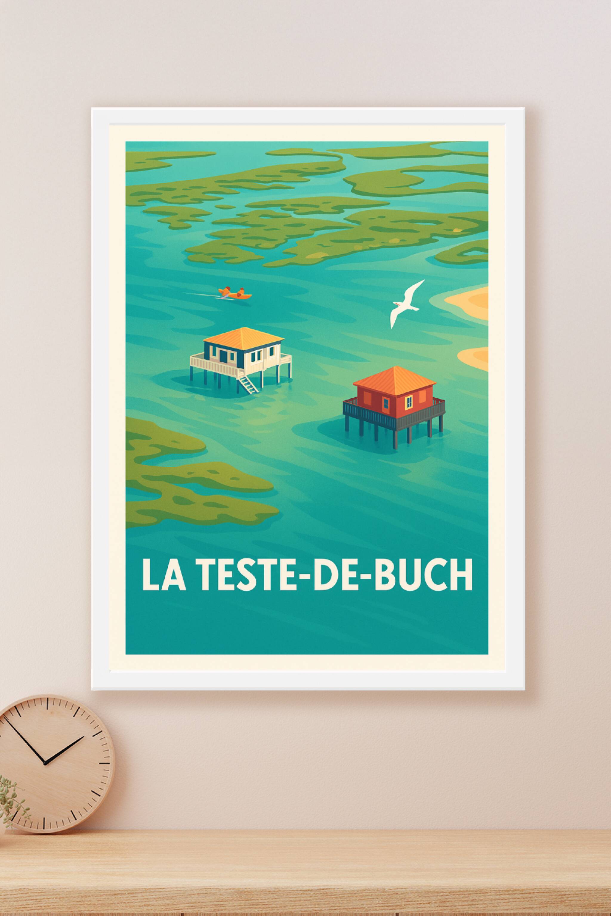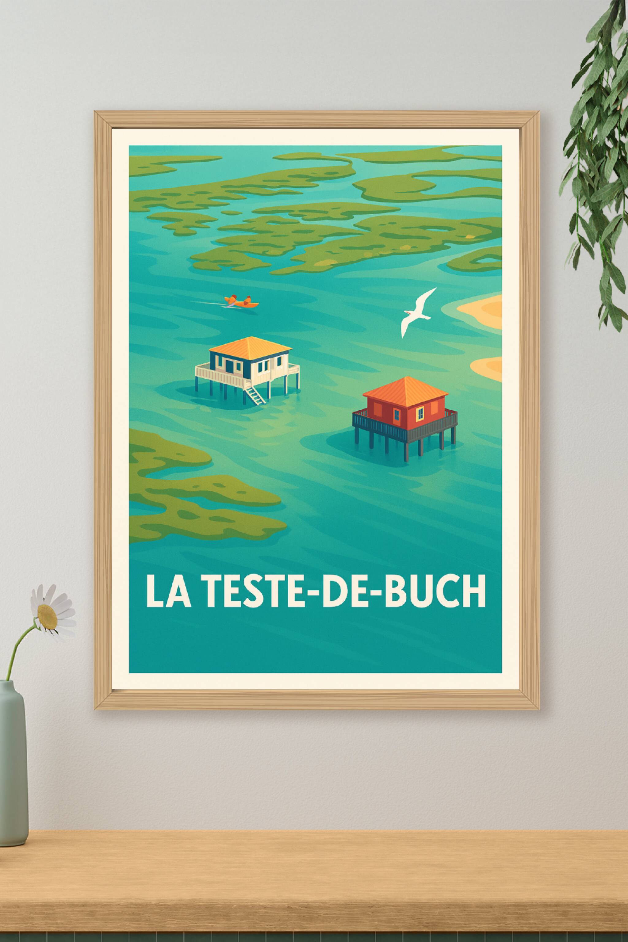 Succombez au charme apaisant de La Teste-de-Buch avec cette affiche illustrée mettant en scène ses cabanes sur pilotis emblématiques au milieu du B...