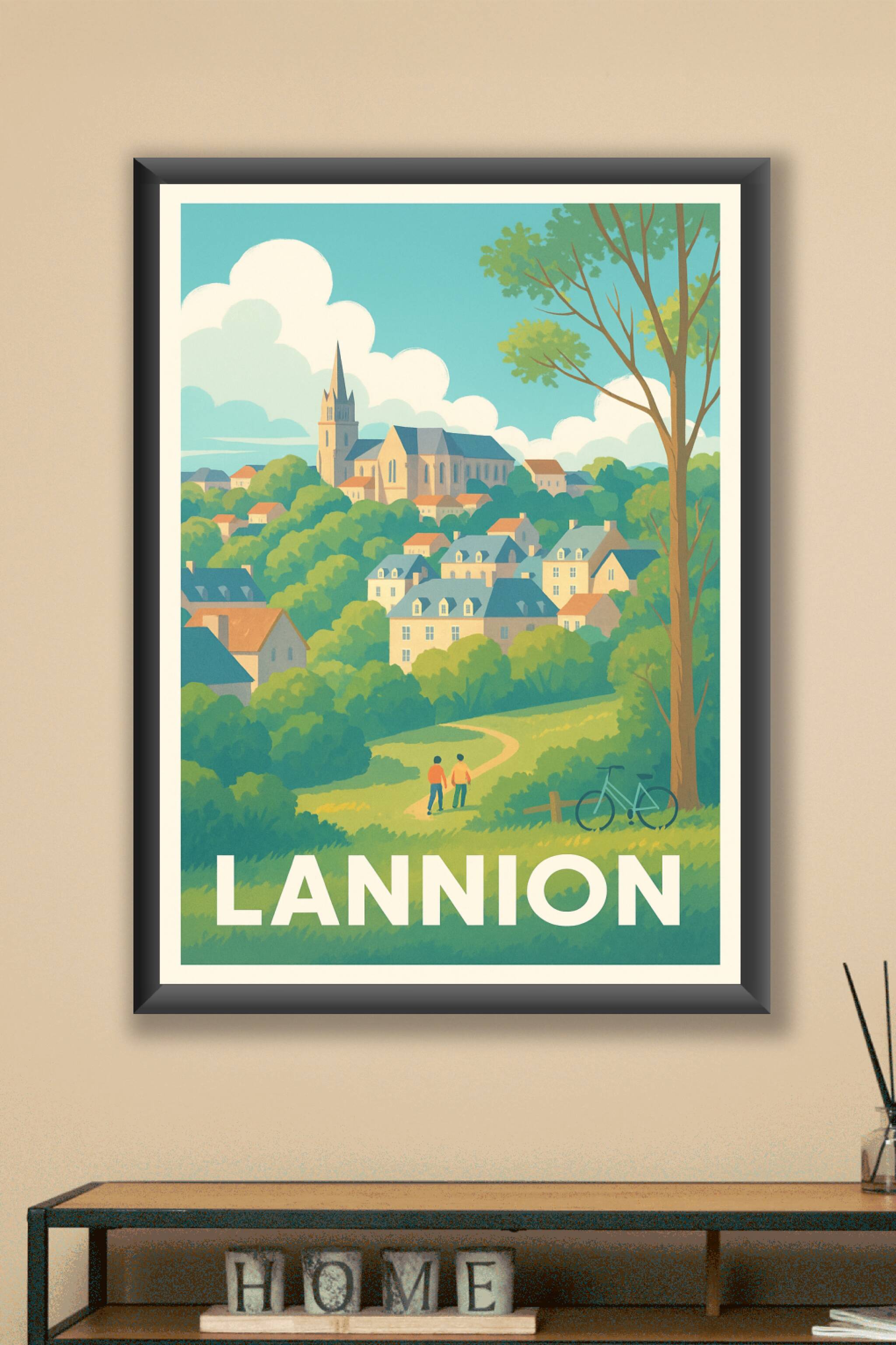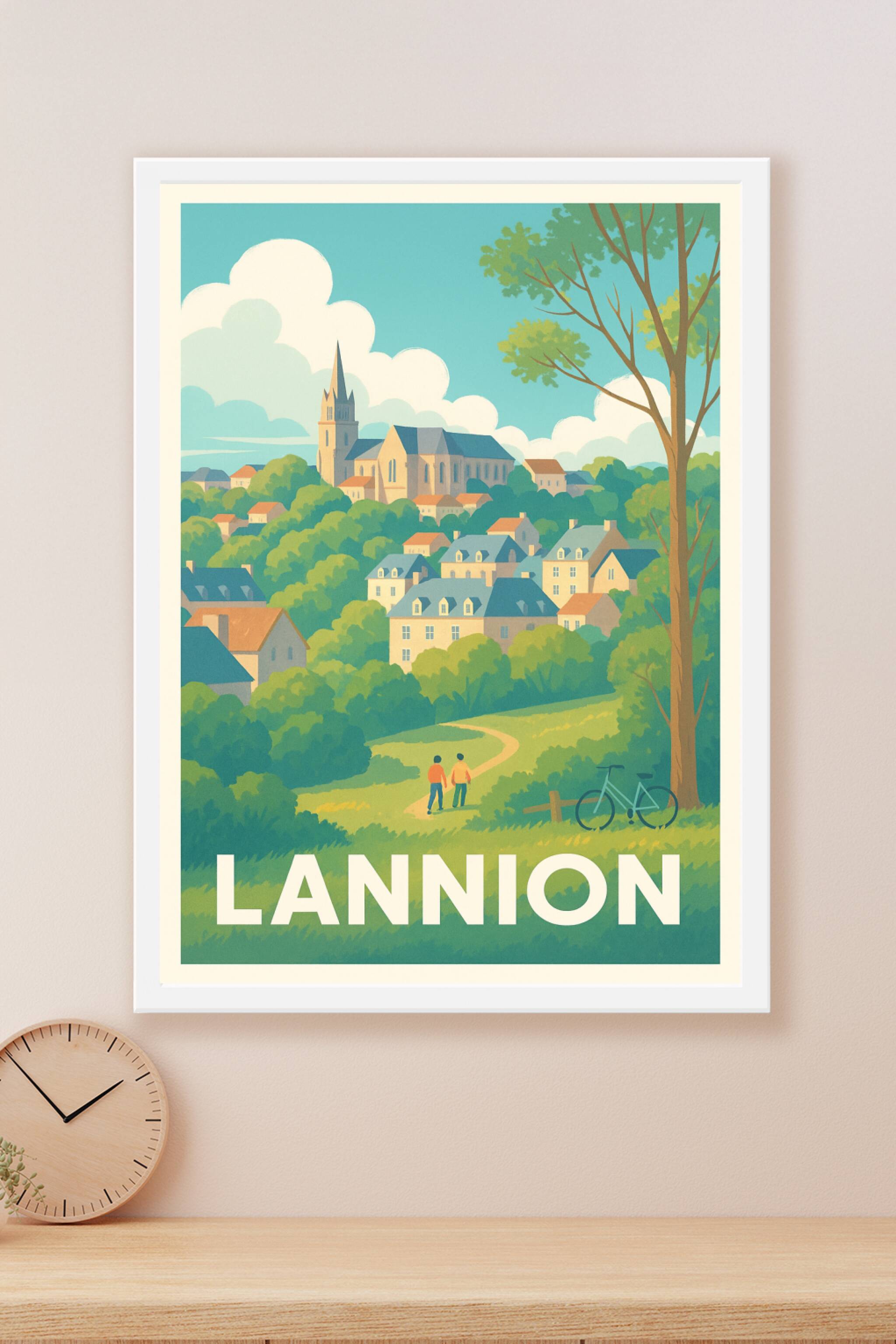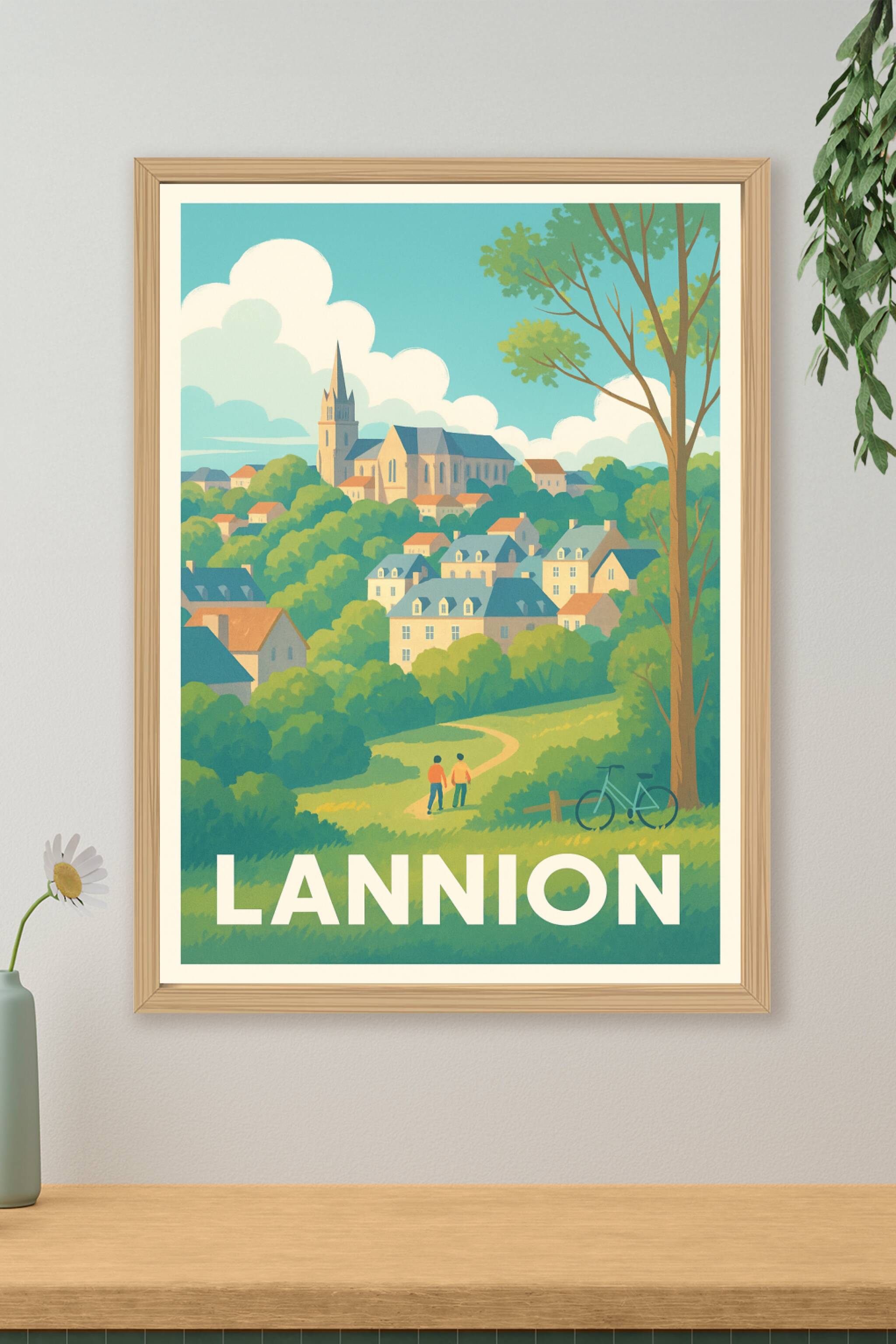 Découvrez l'atmosphère paisible de Lannion avec cette affiche illustrée qui capture le charme authentique de cette ville bretonne, ses maisons pitt...