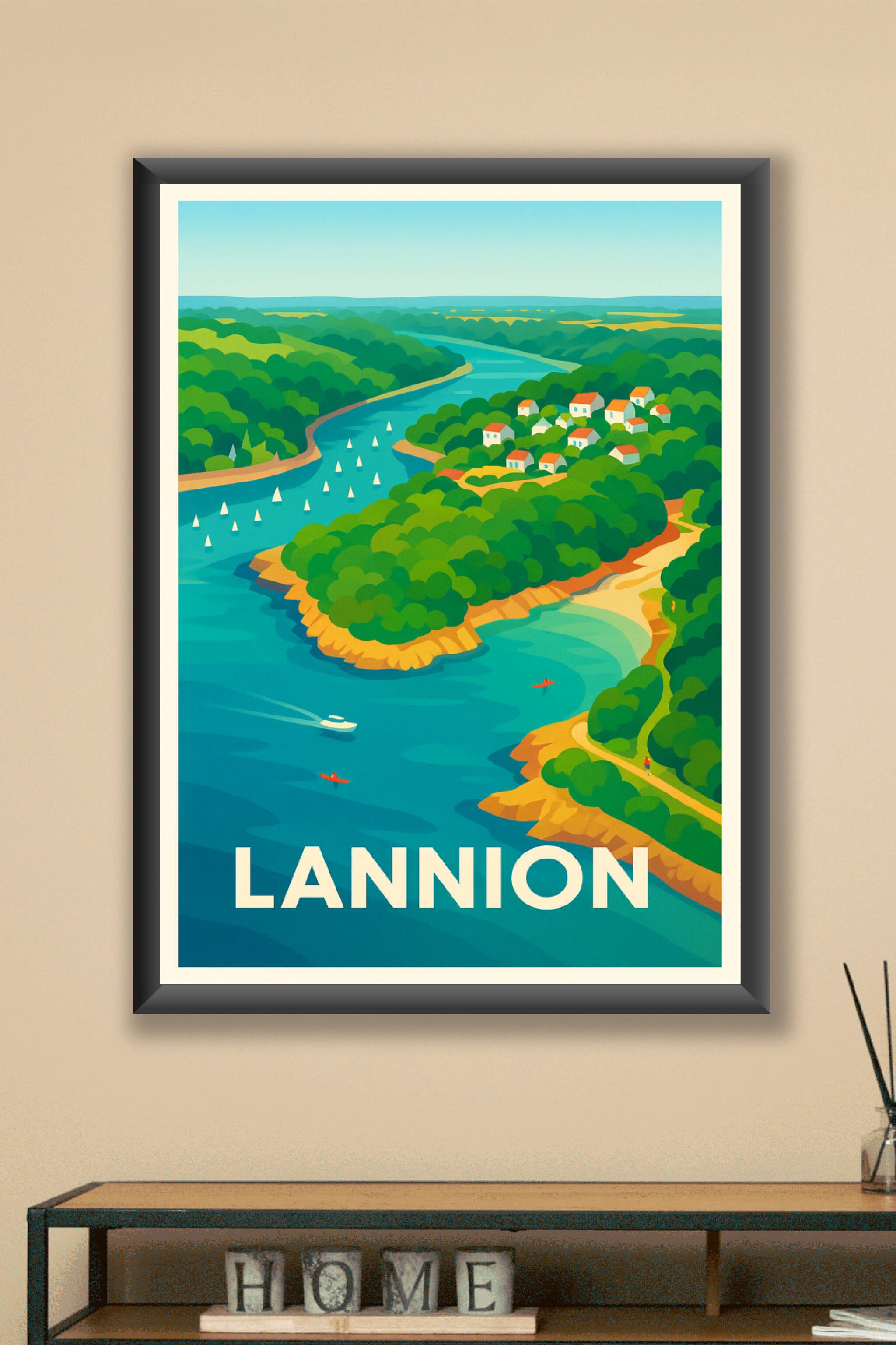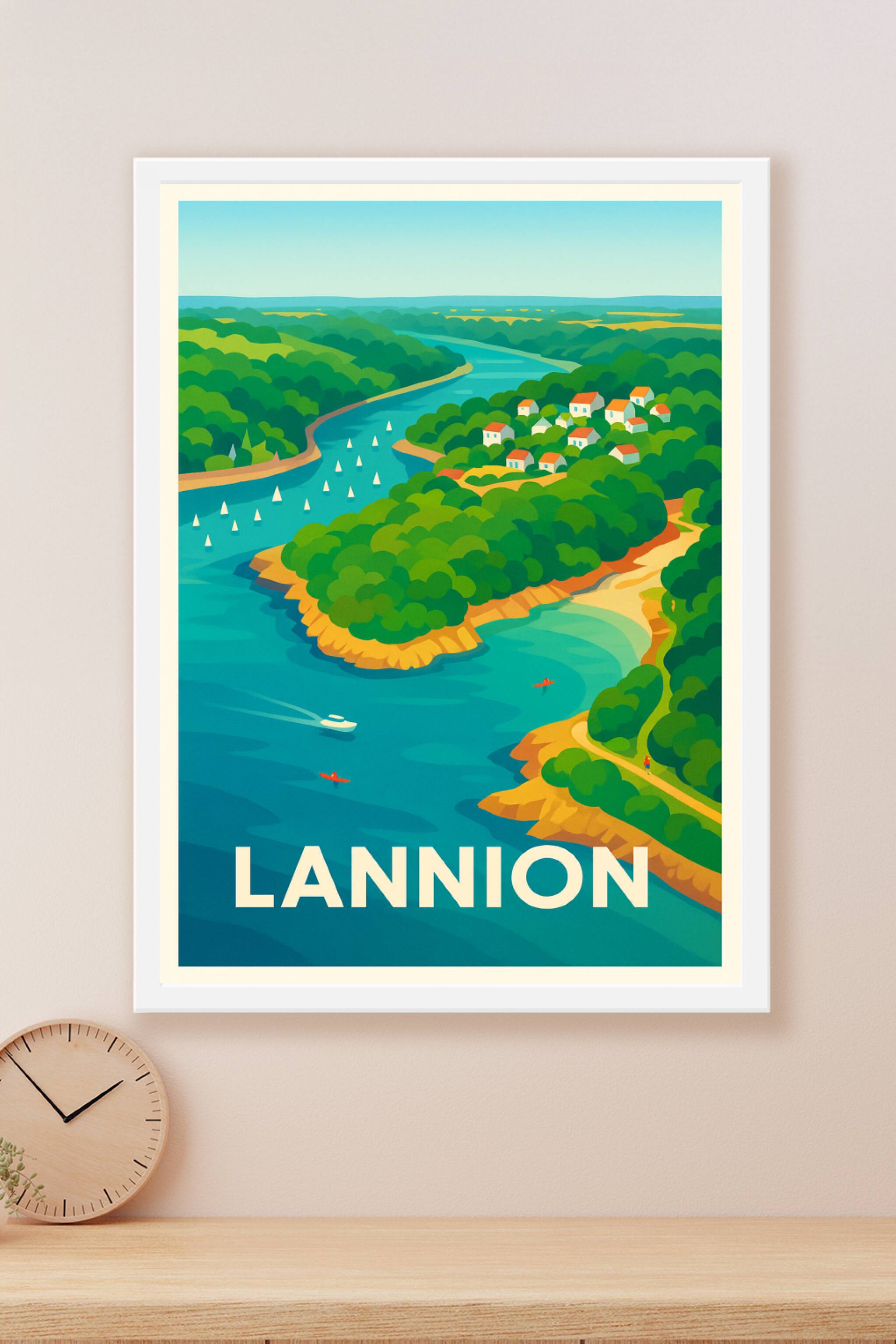 Découvrez l'écrin naturel de Lannion à travers cette affiche au graphisme épuré et lumineux, qui met en valeur la beauté des rives verdoyantes et d...