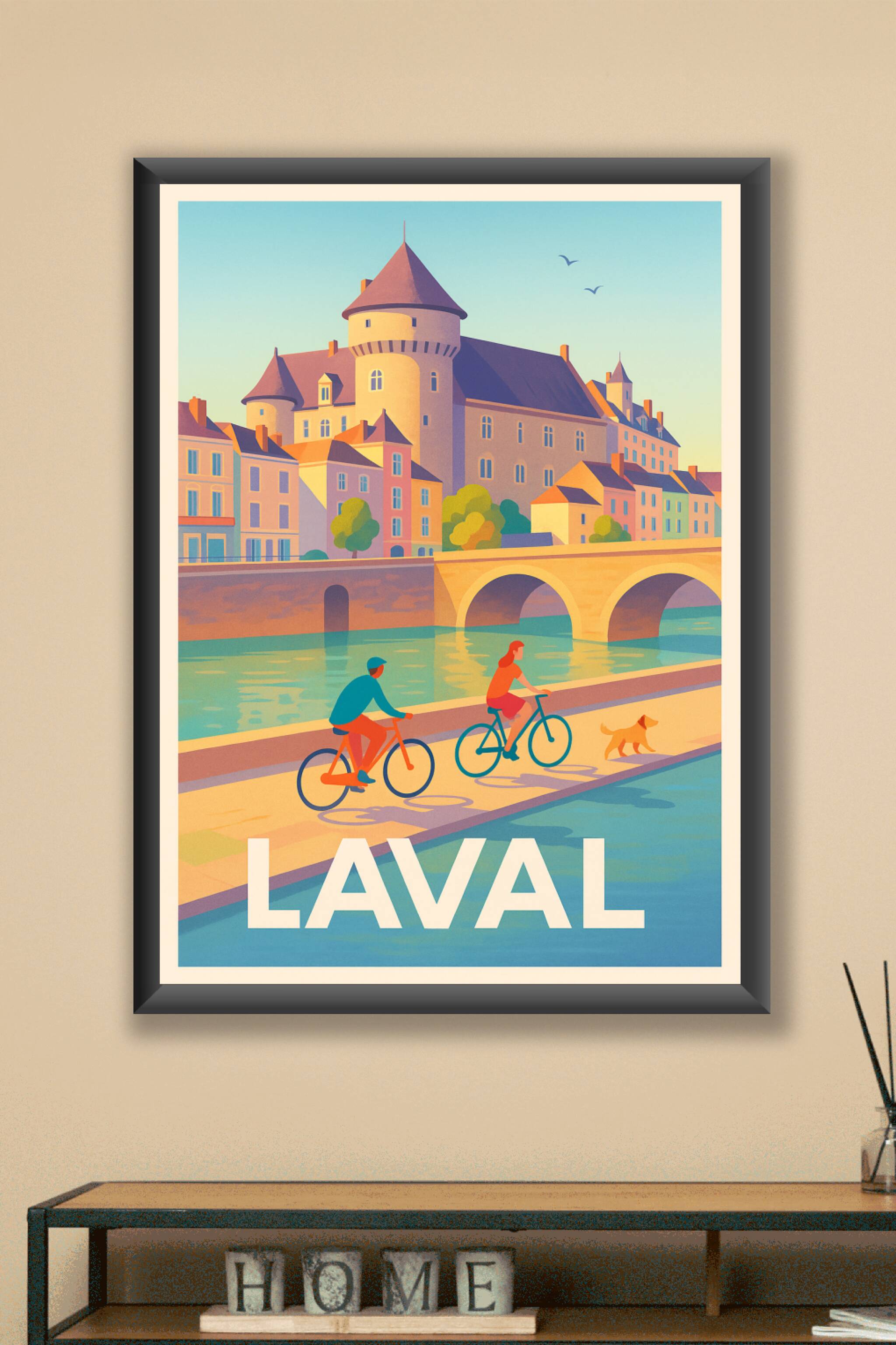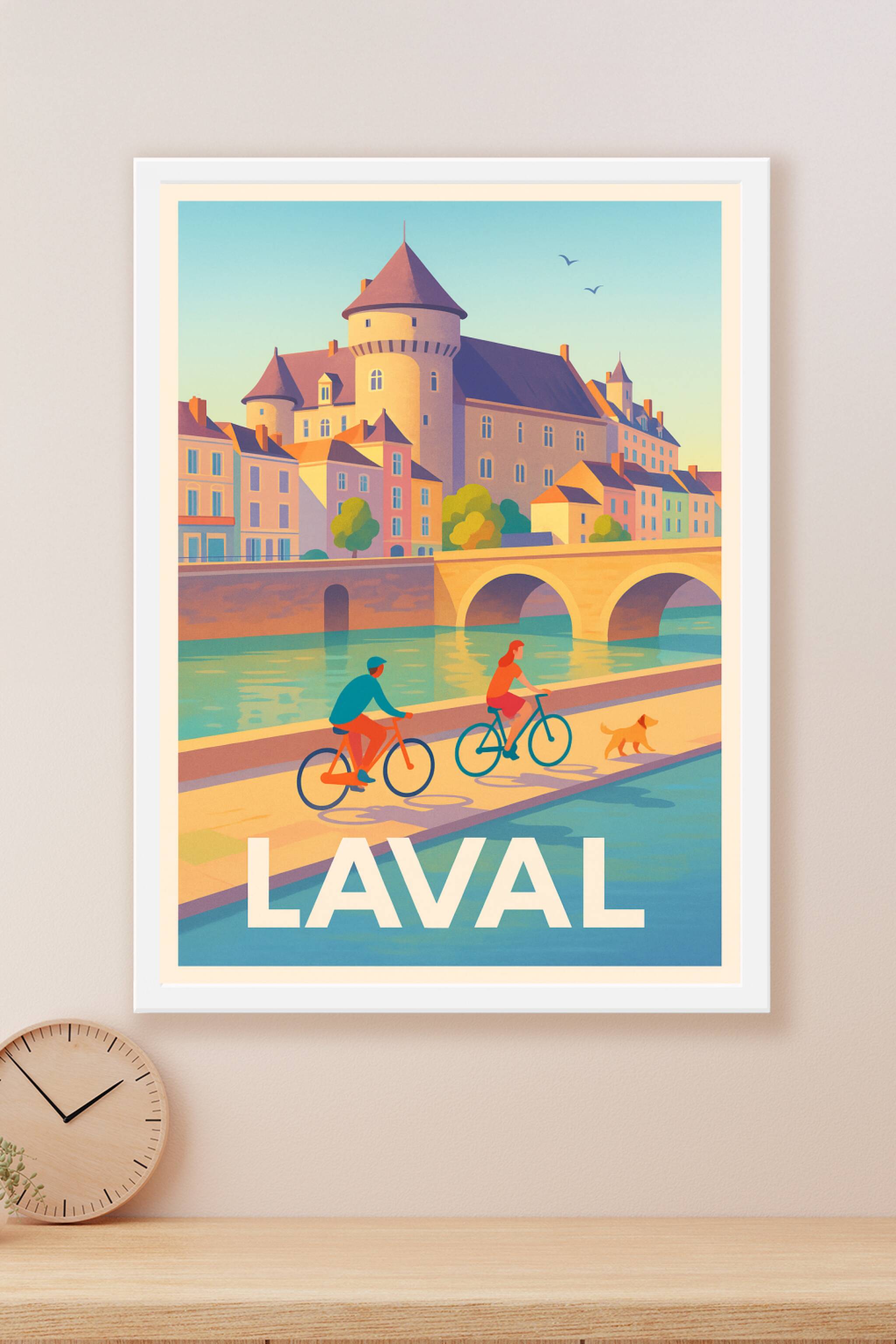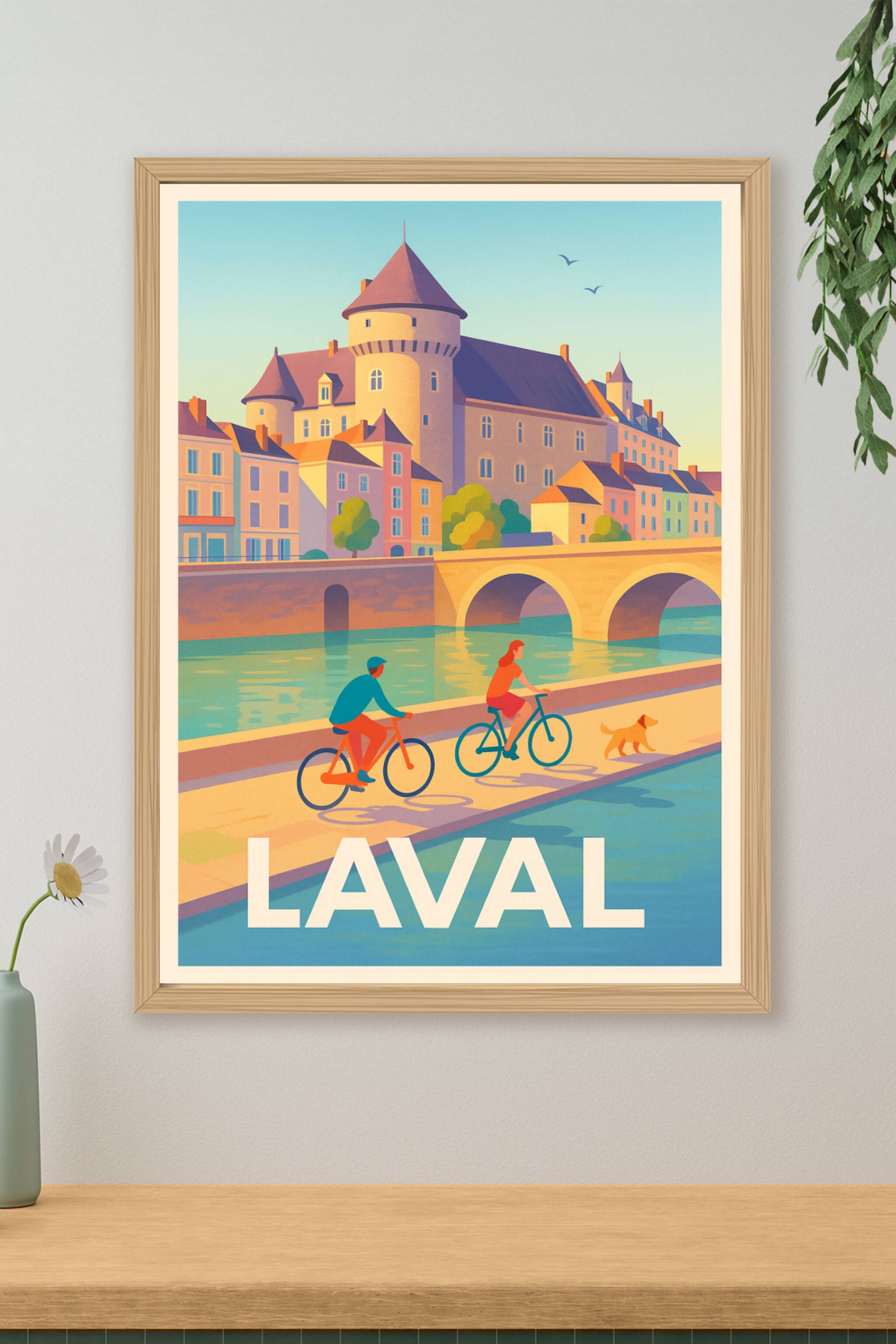 Découvrez la douceur de vivre à Laval avec cette affiche illustrée qui met en scène un décor paisible au bord de la rivière, où cyclistes et chiens...
