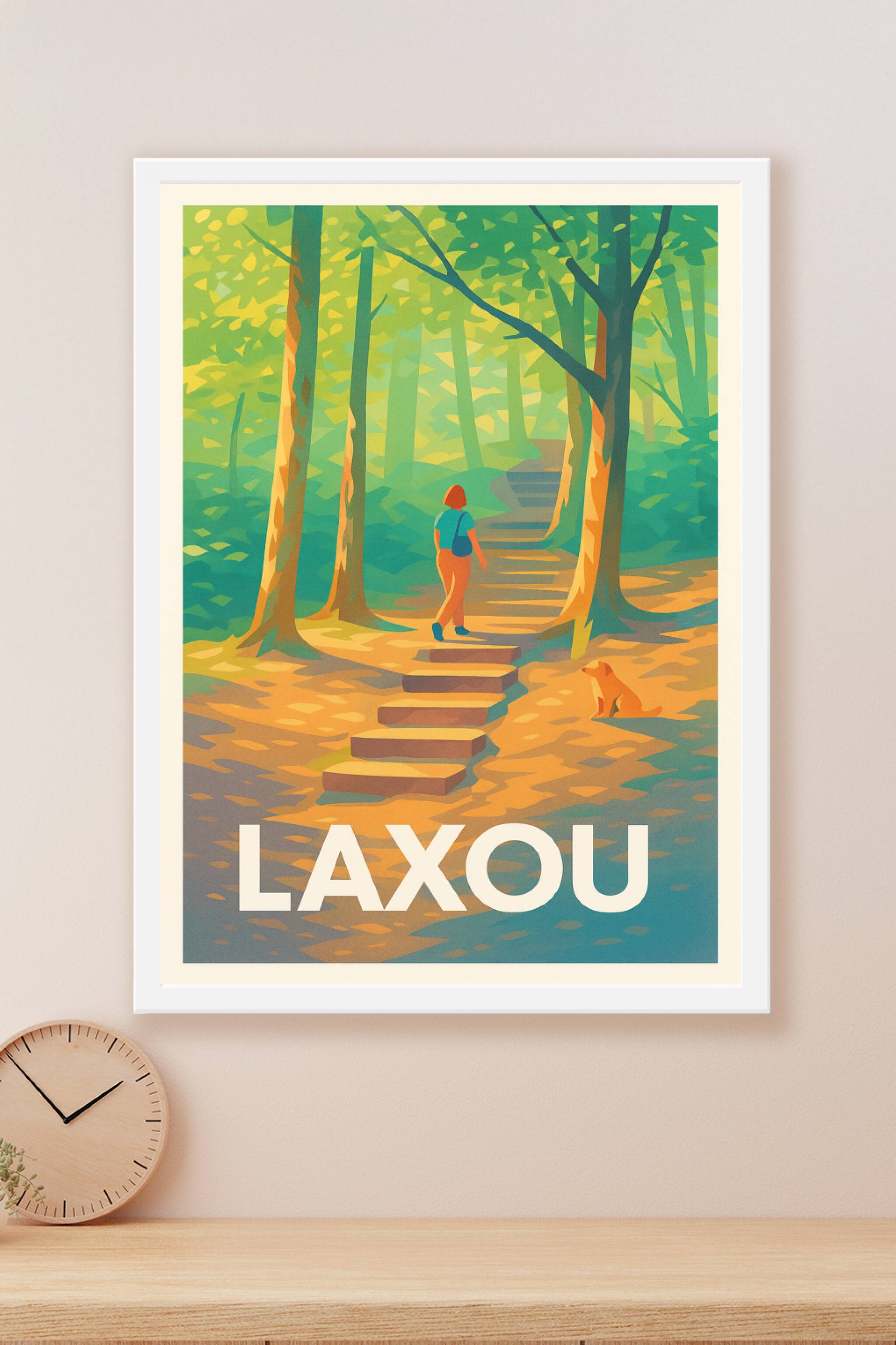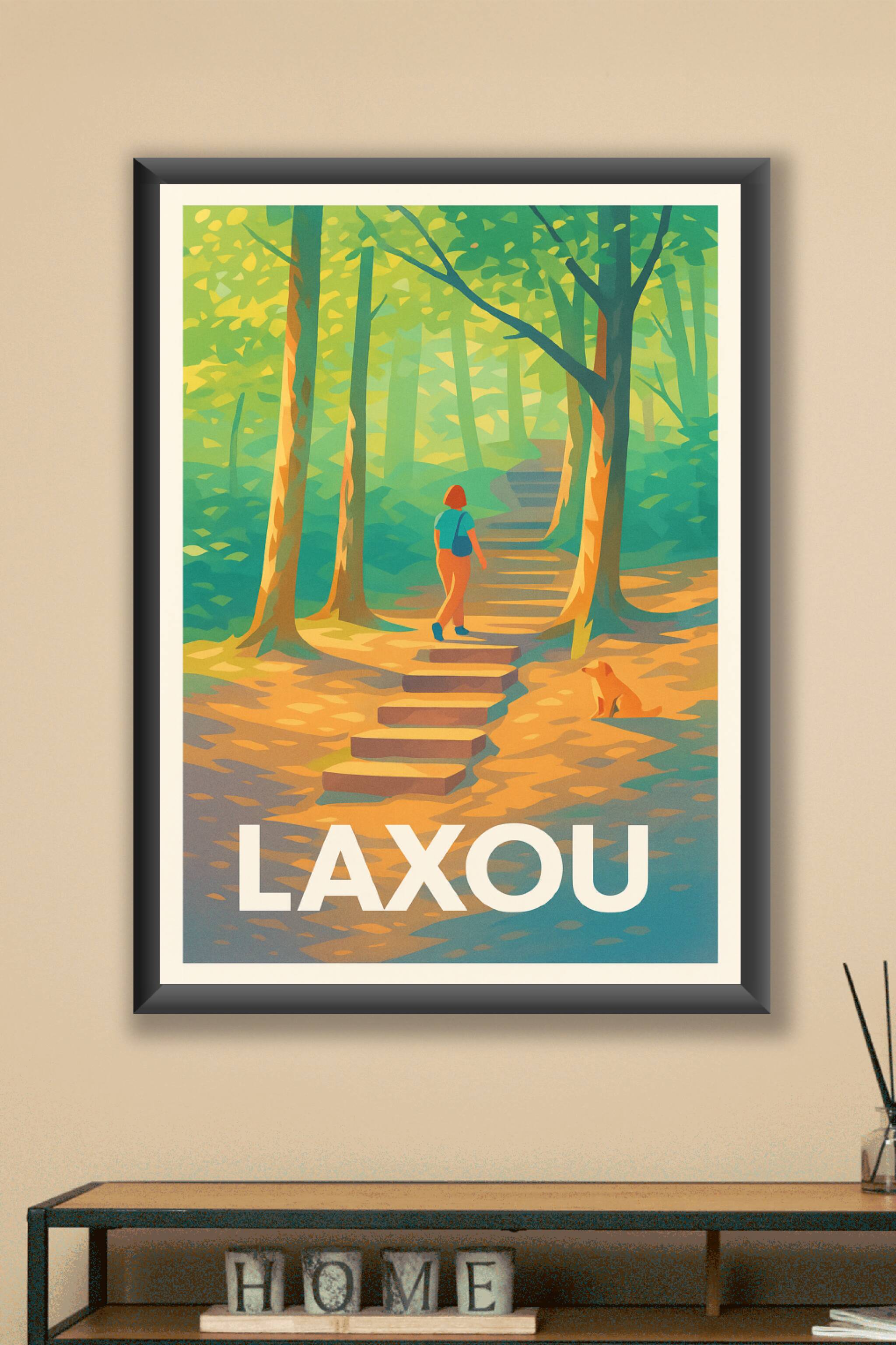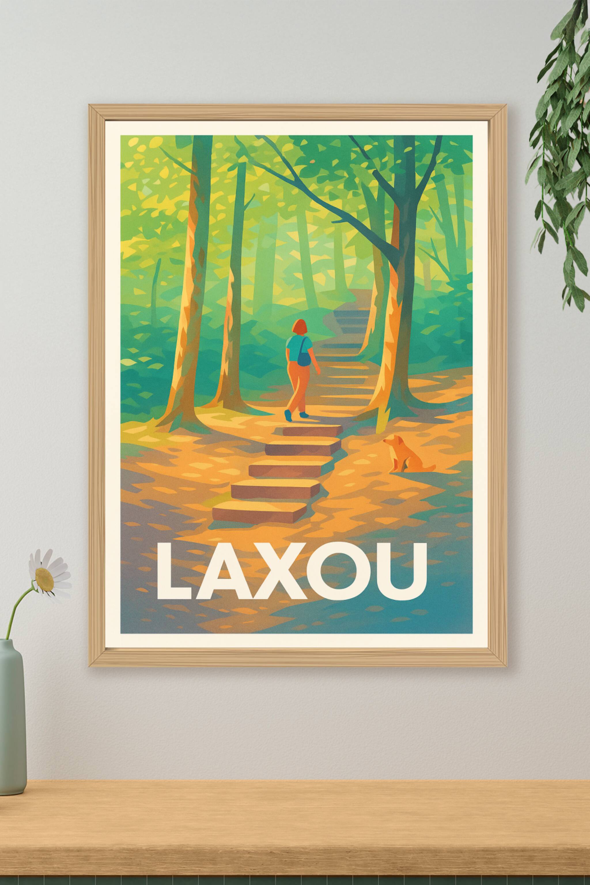 Découvrez la sérénité des sentiers boisés de Laxou avec cette affiche illustrée, qui capture une promenade paisible baignée dans une lumière douce ...