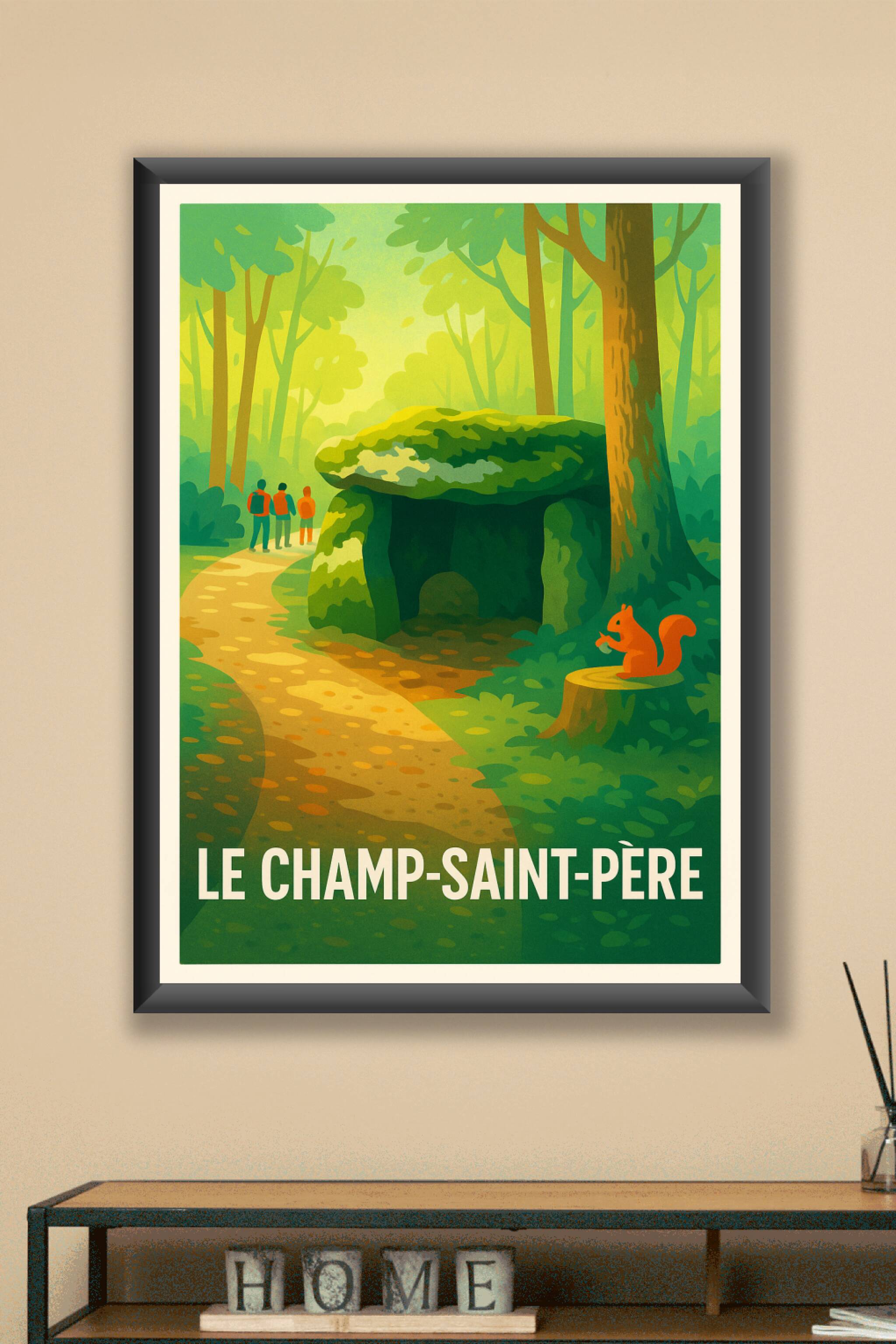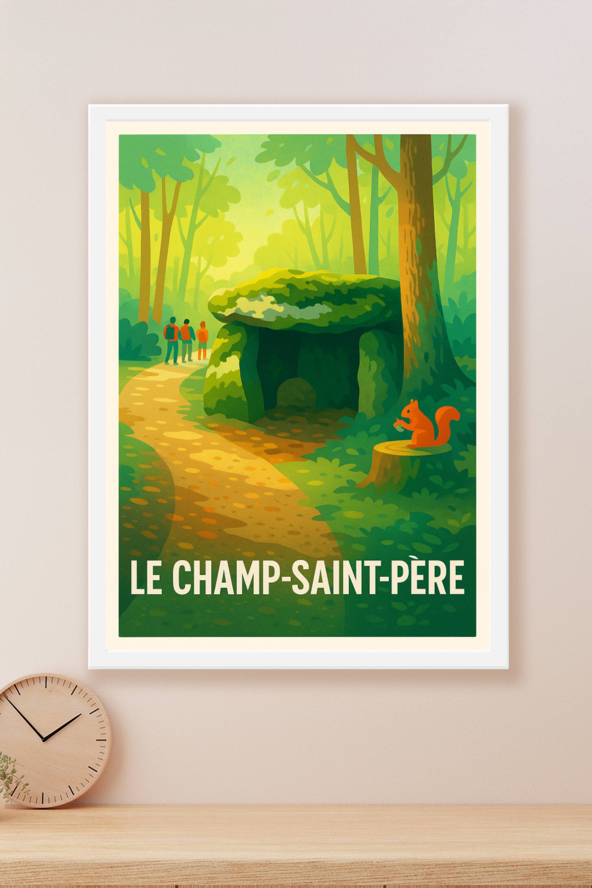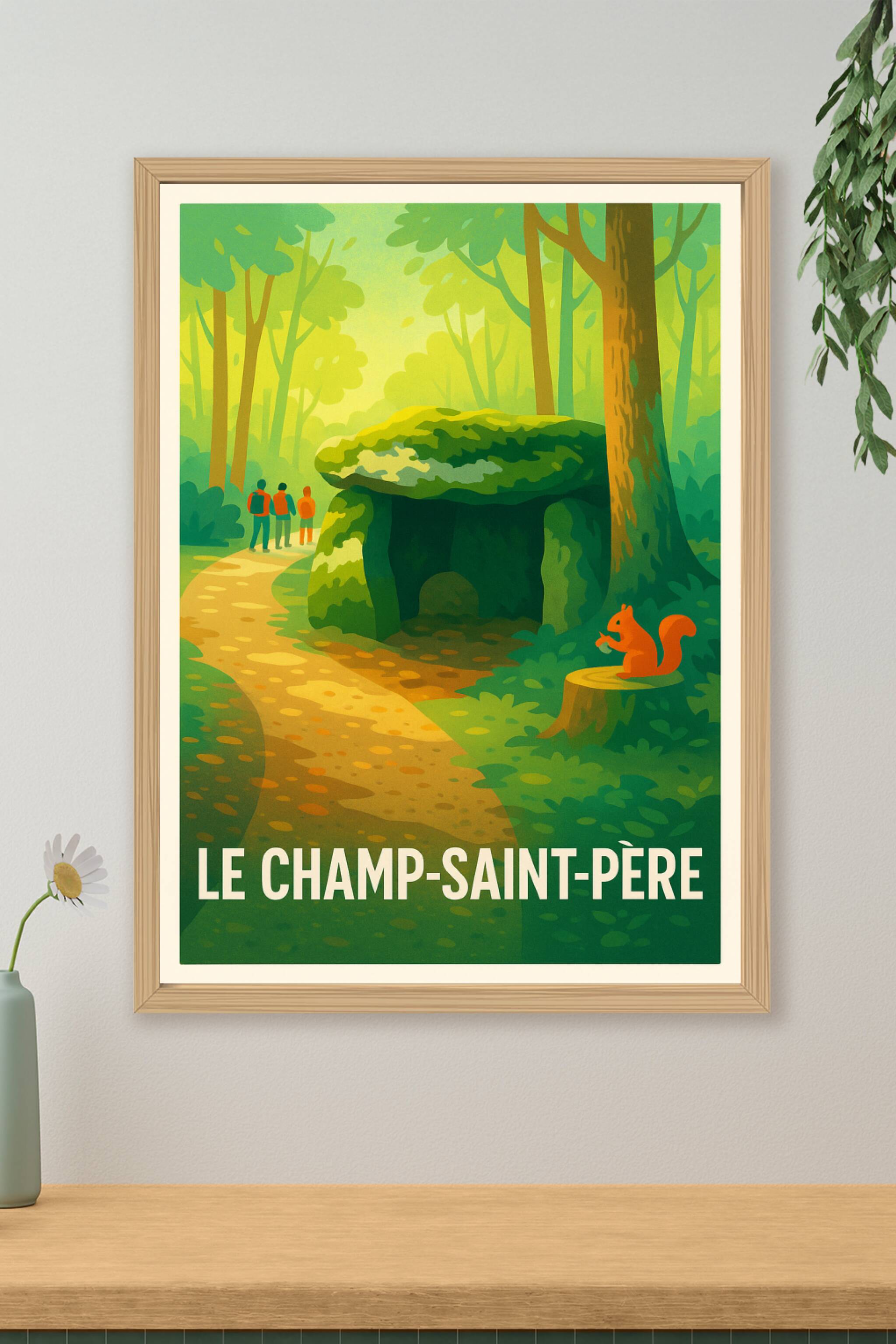 Découvrez l'affiche inspirante qui vous transporte dans la forêt paisible de Le Champ-Saint-Père, illustrée avec des teintes douces et chaleureuses...