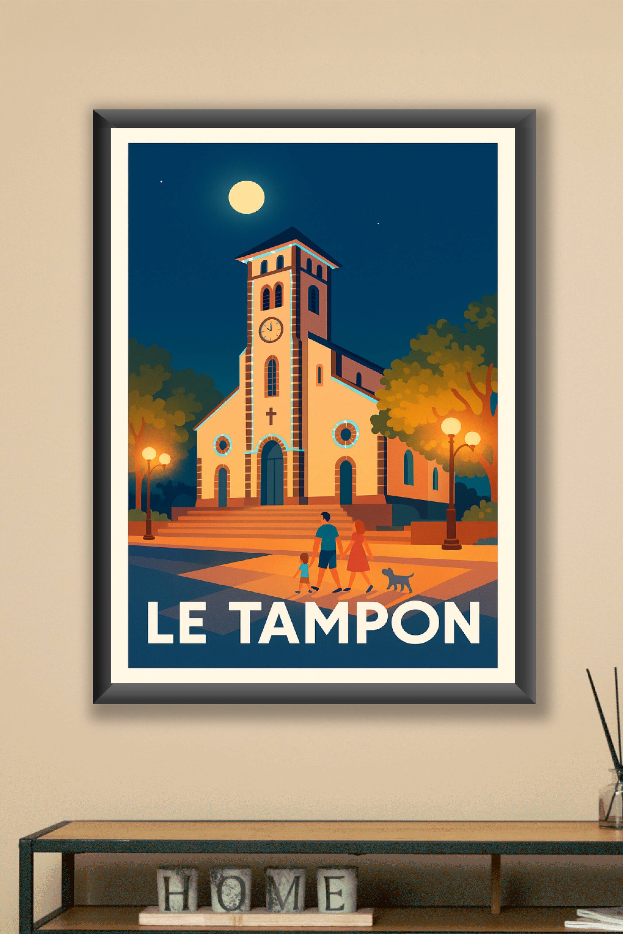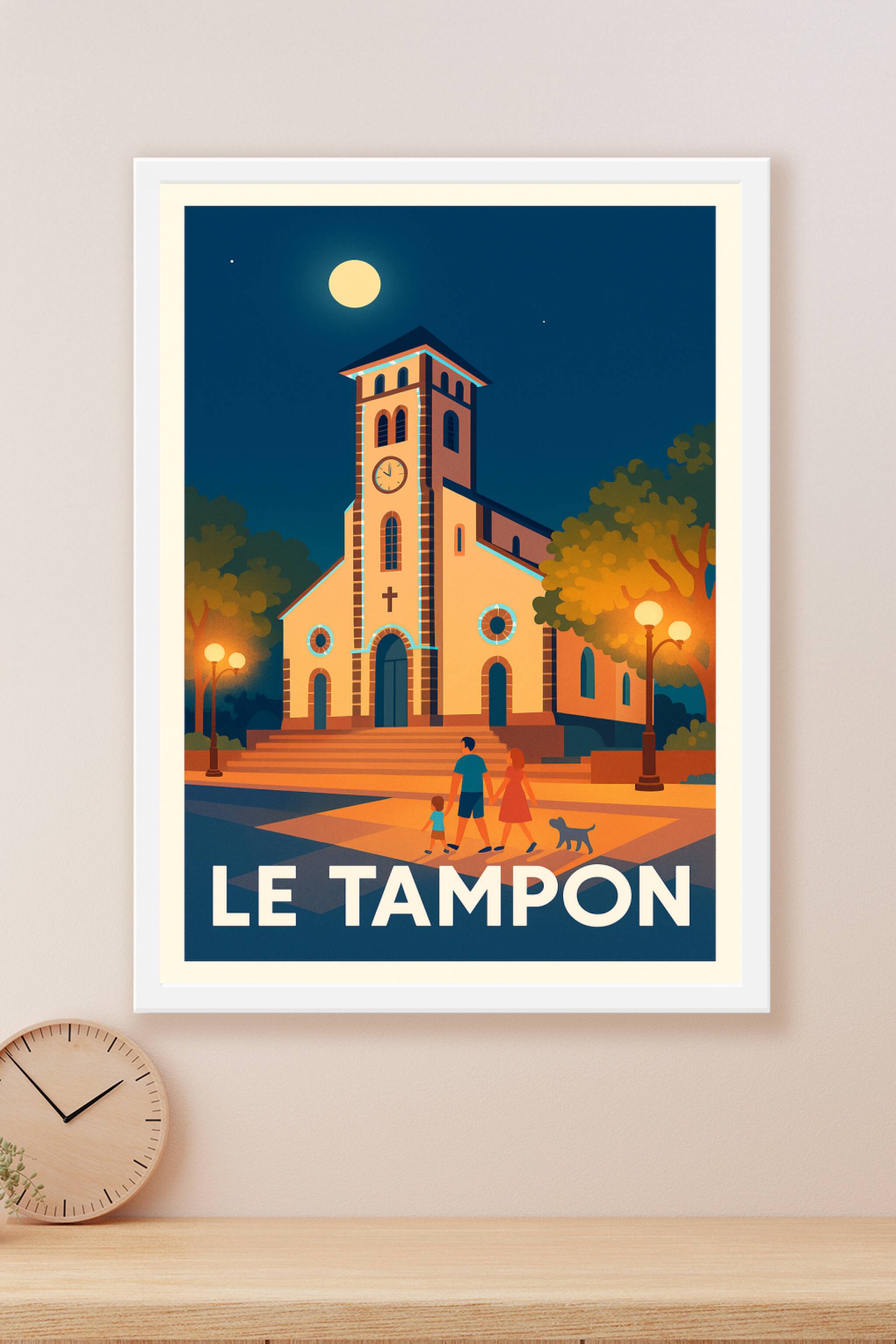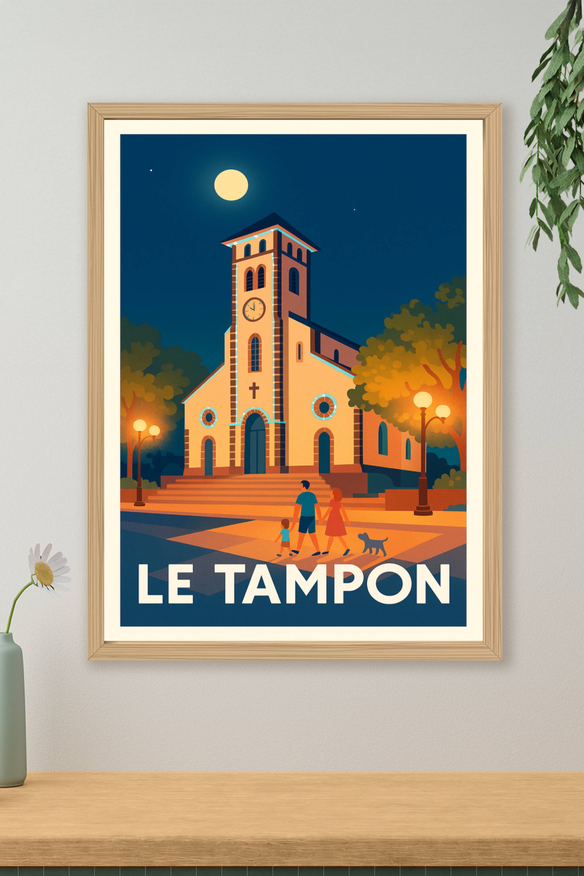 Découvrez la douceur et le charme nocturne de Le Tampon avec cette magnifique affiche illustrée mettant en scène l'église centrale baignée par la l...
