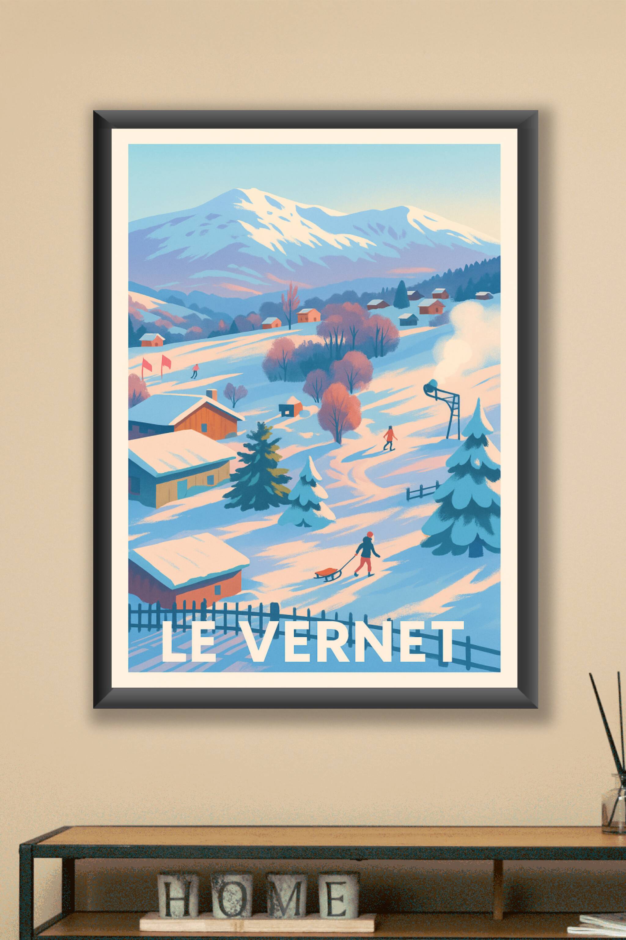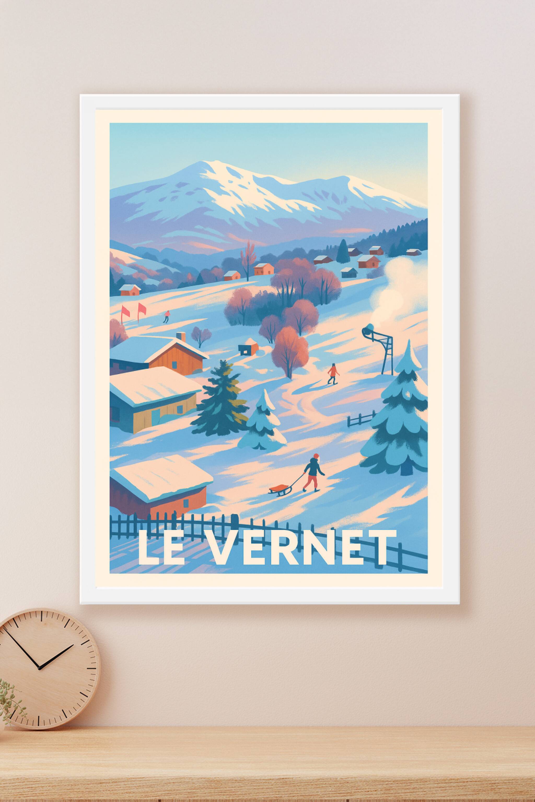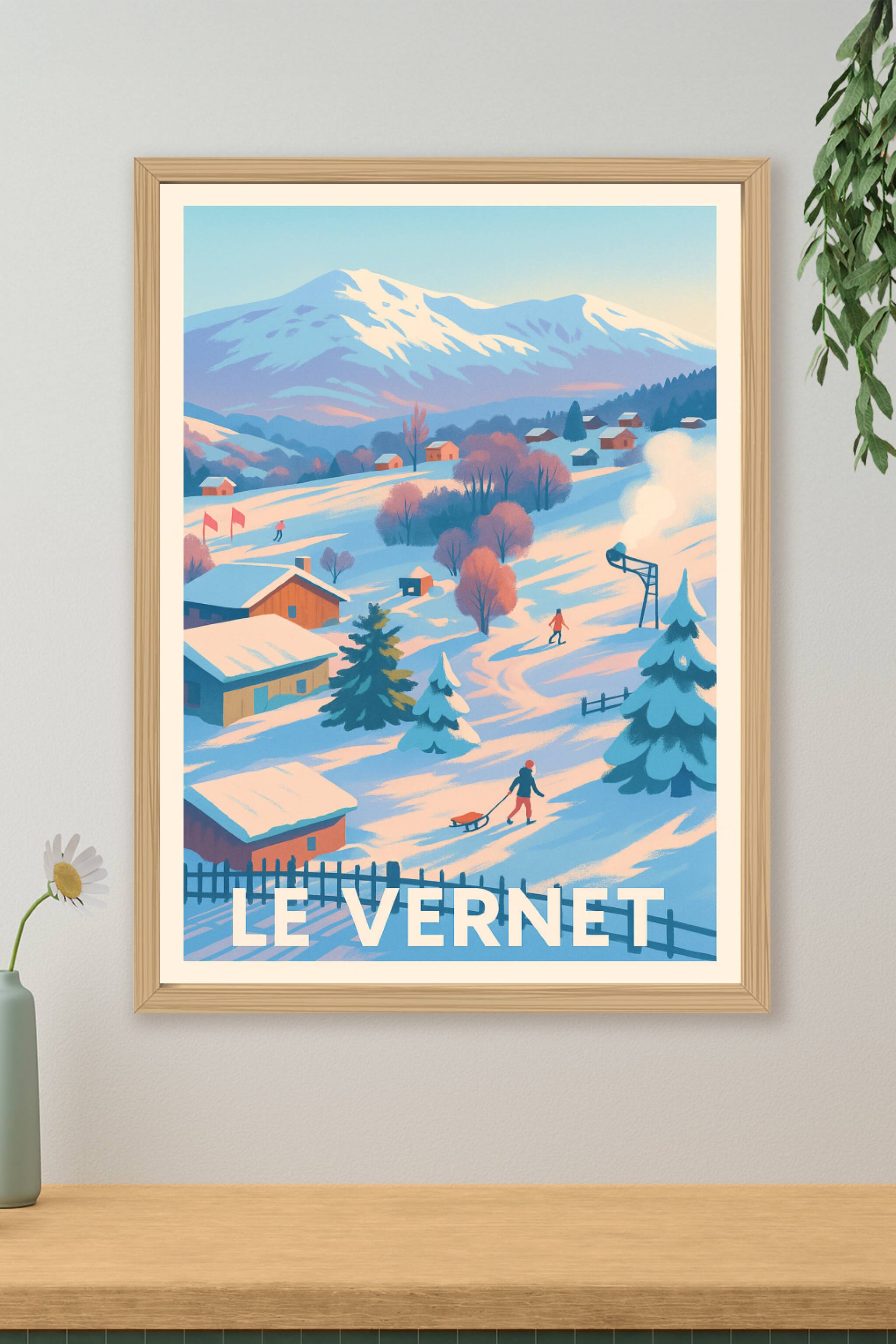 Découvrez l'ambiance paisible et enneigée du Vernet avec cette affiche illustrée au style chaleureux et coloré. Cette scène hivernale ravira les am...