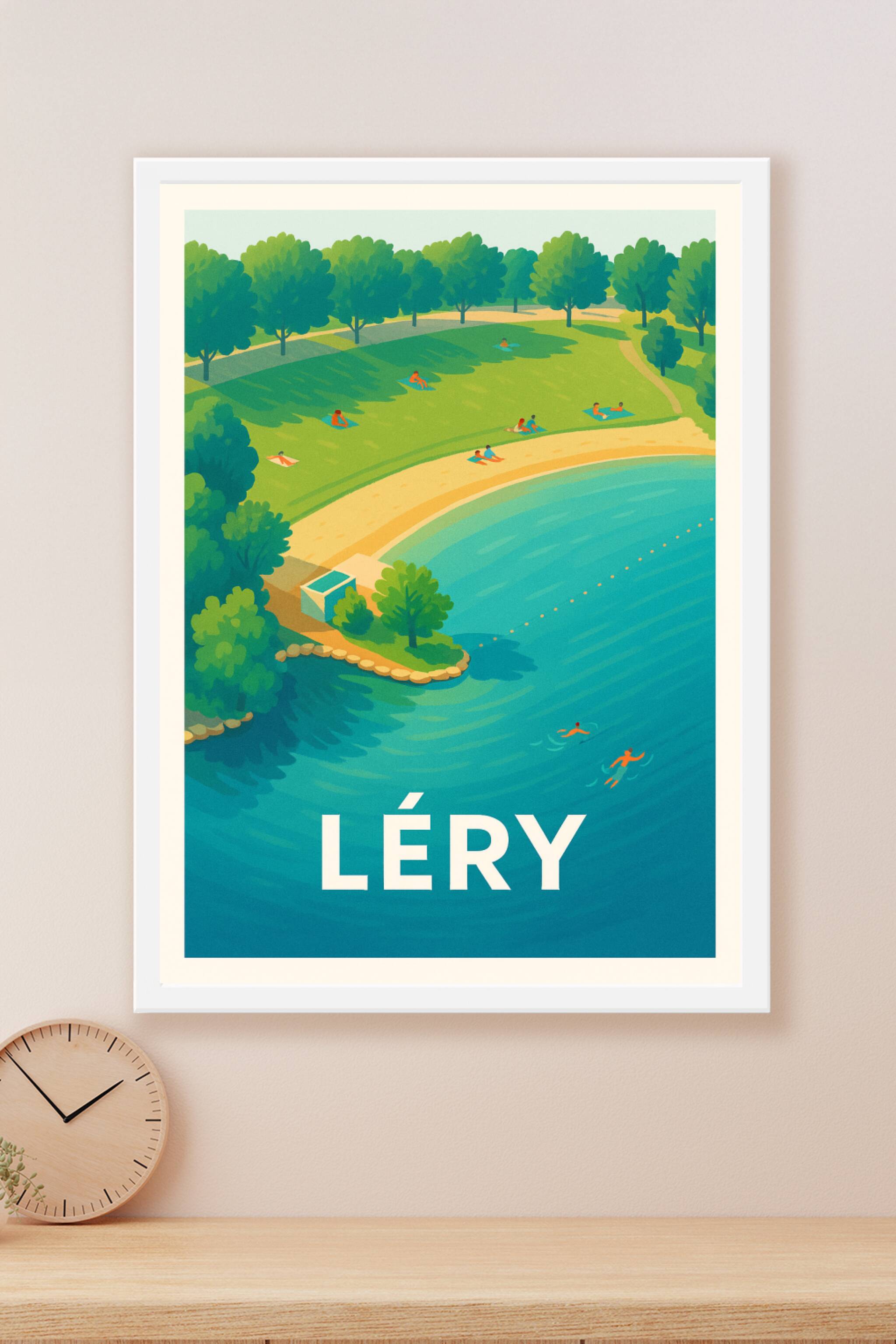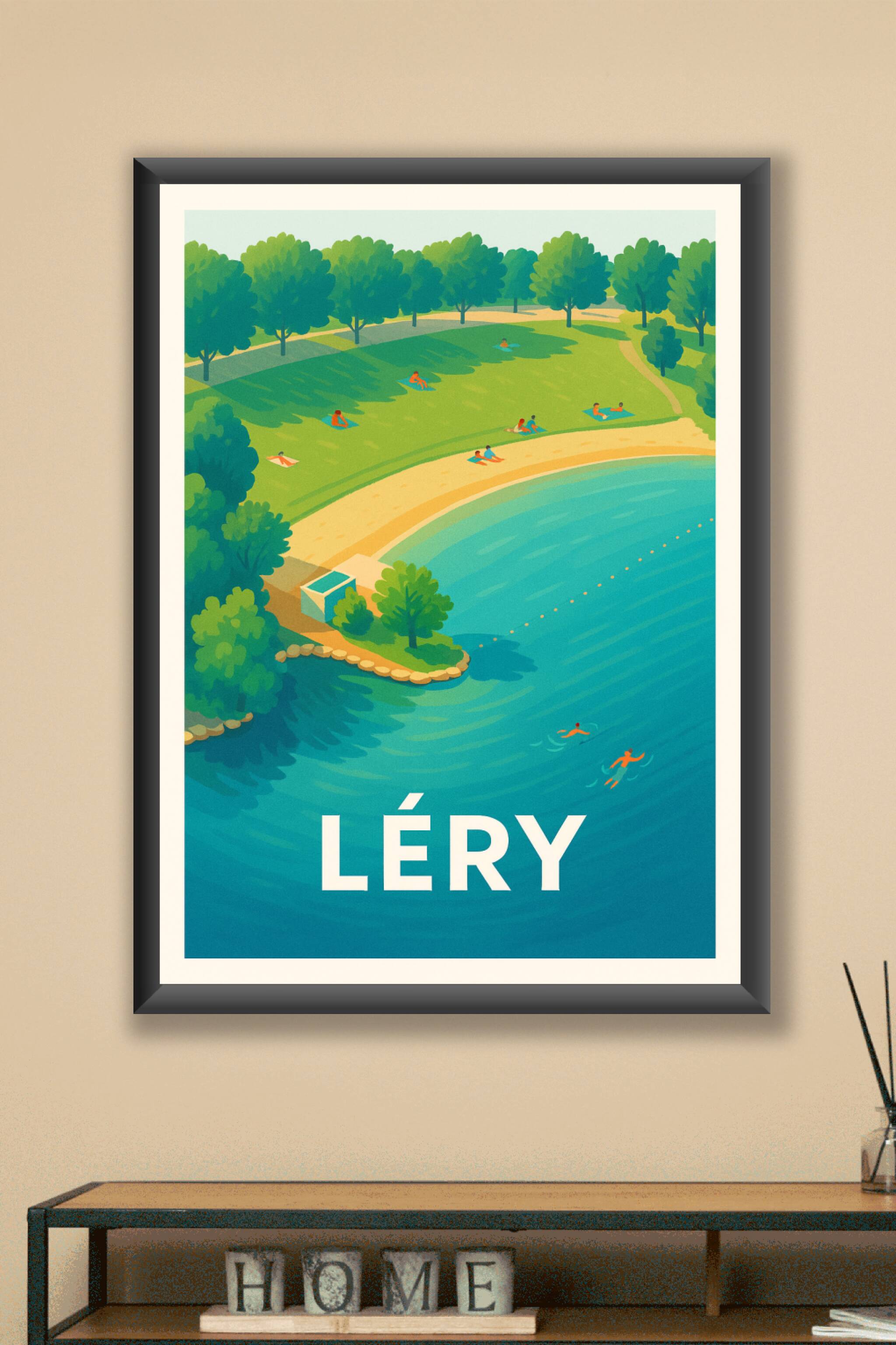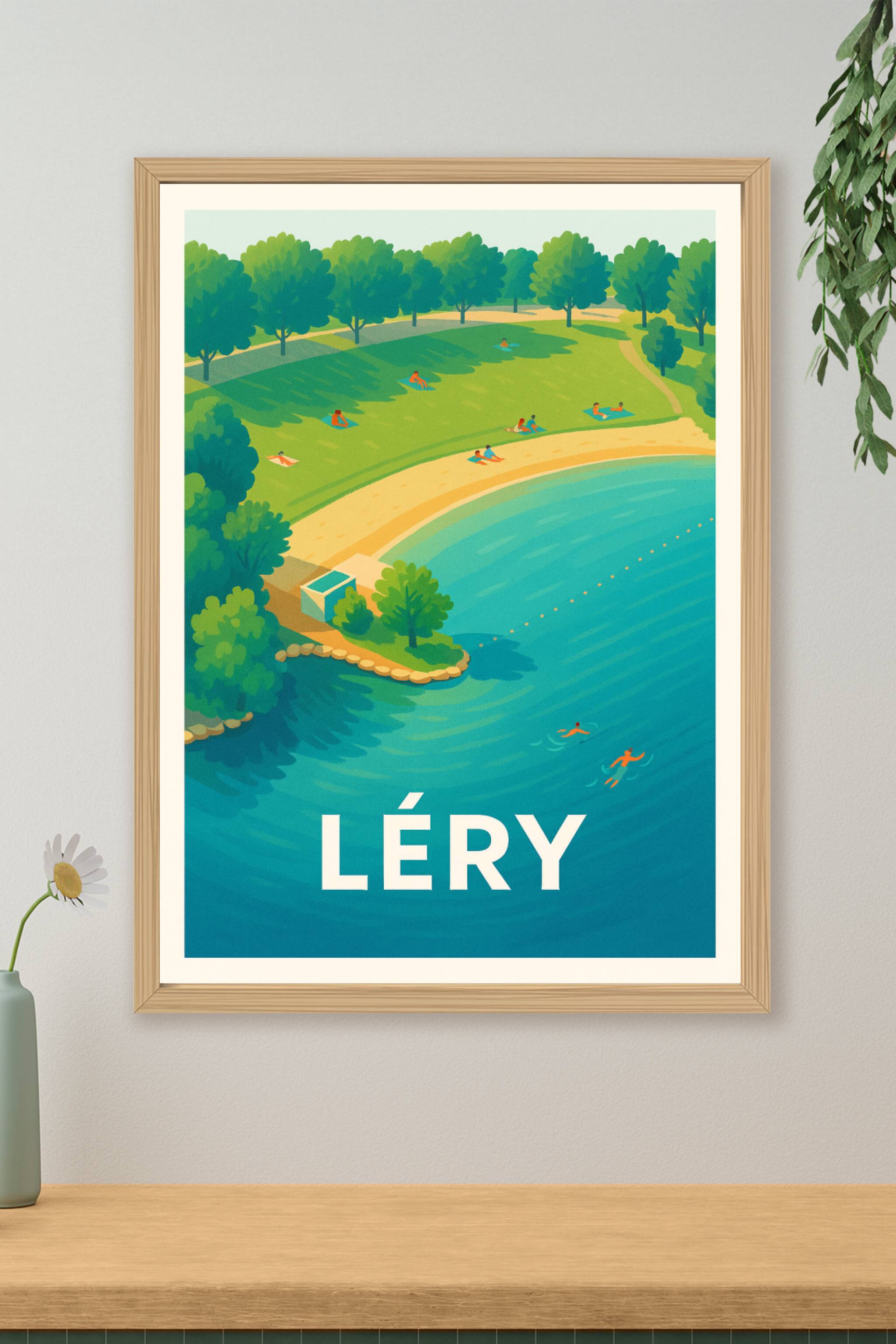 Découvrez cette affiche représentant le cadre paisible et verdoyant de Léry, avec son lac accueillant des baigneurs et des espaces de repos en plei...