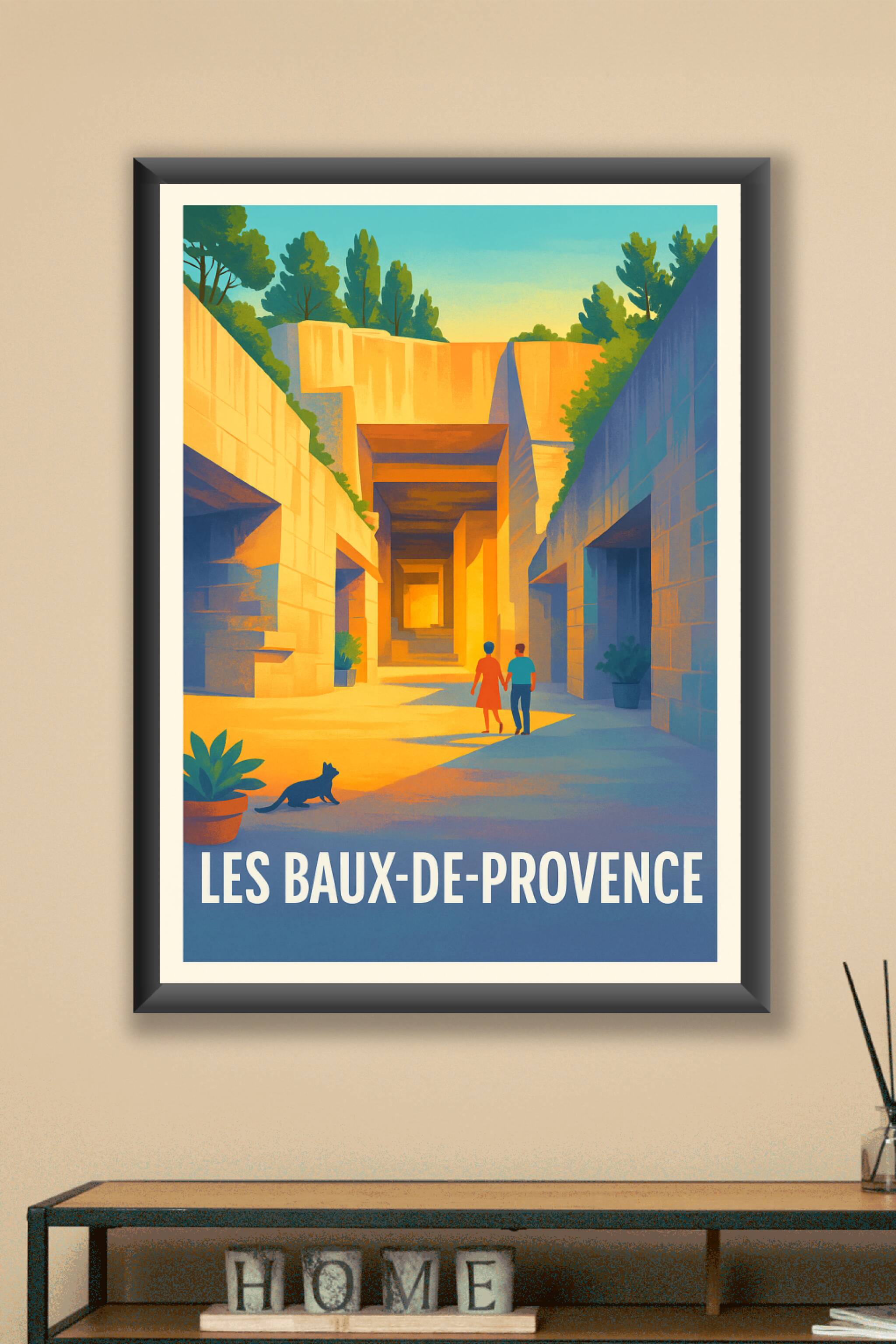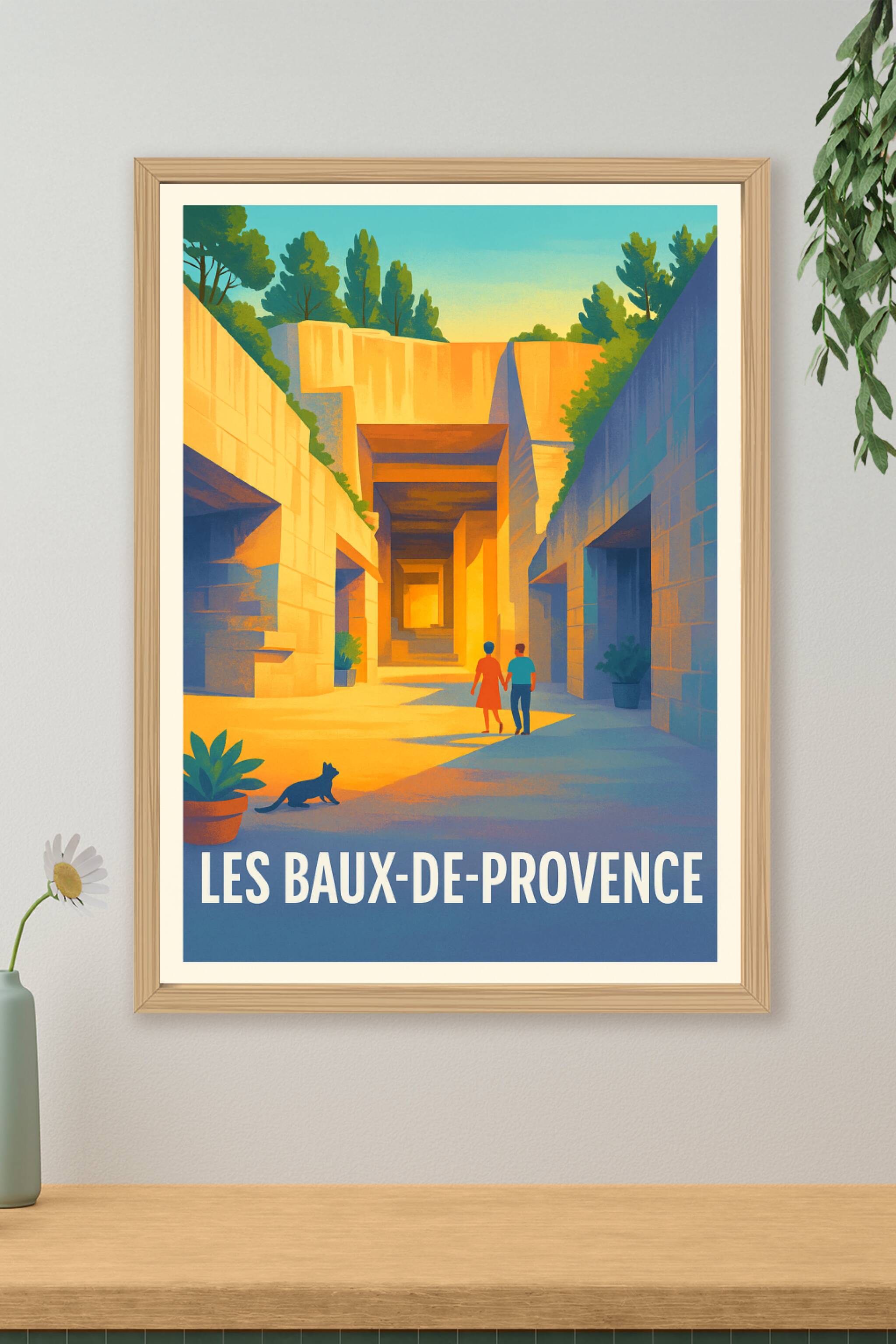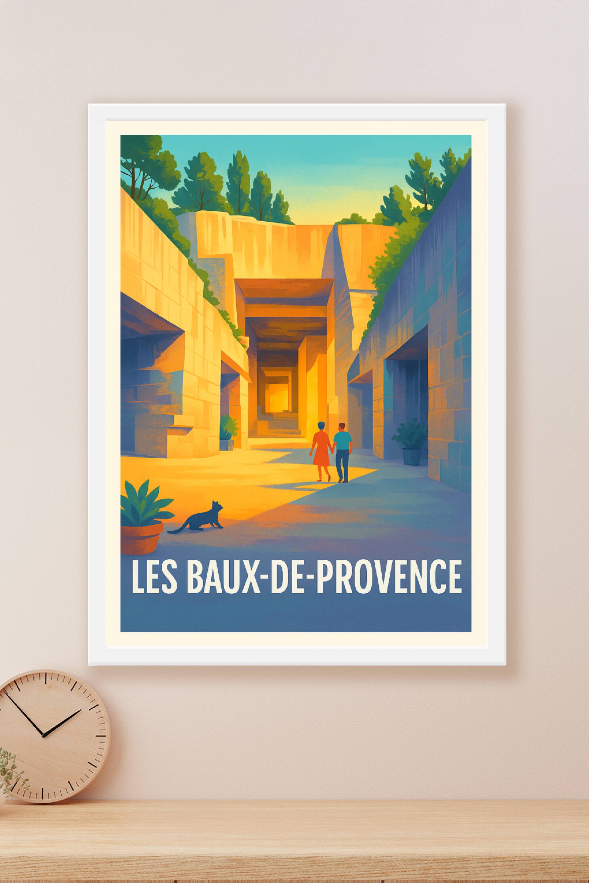 Plongez dans la magie minérale des Baux-de-Provence avec ce poster au style néo-rétro, capturant l'essence des carrières baignées de lumière dorée. Deux promeneurs main dans la main, accompagnés d'un chat, évoquent le charme paisible du sud de la France.