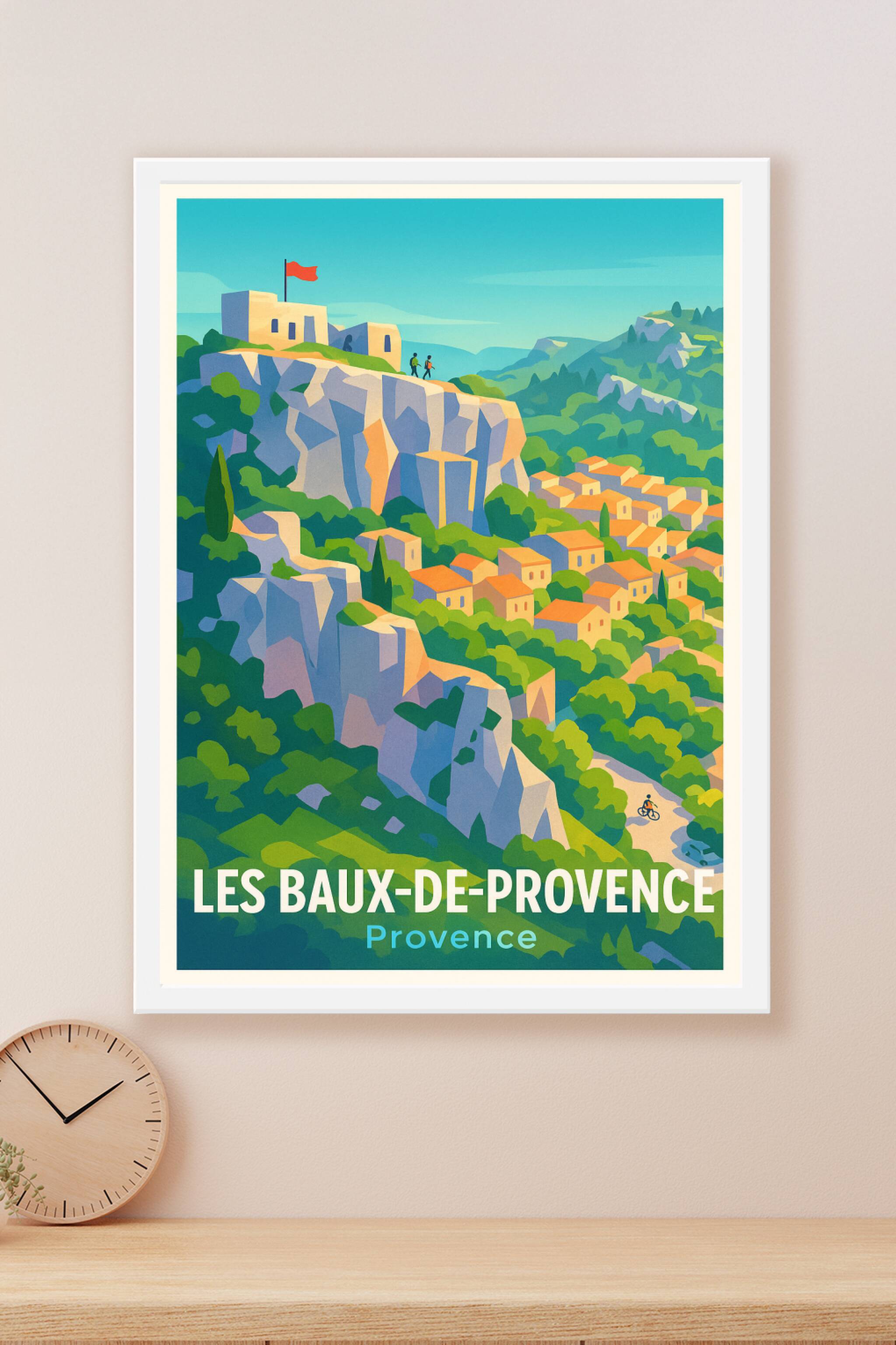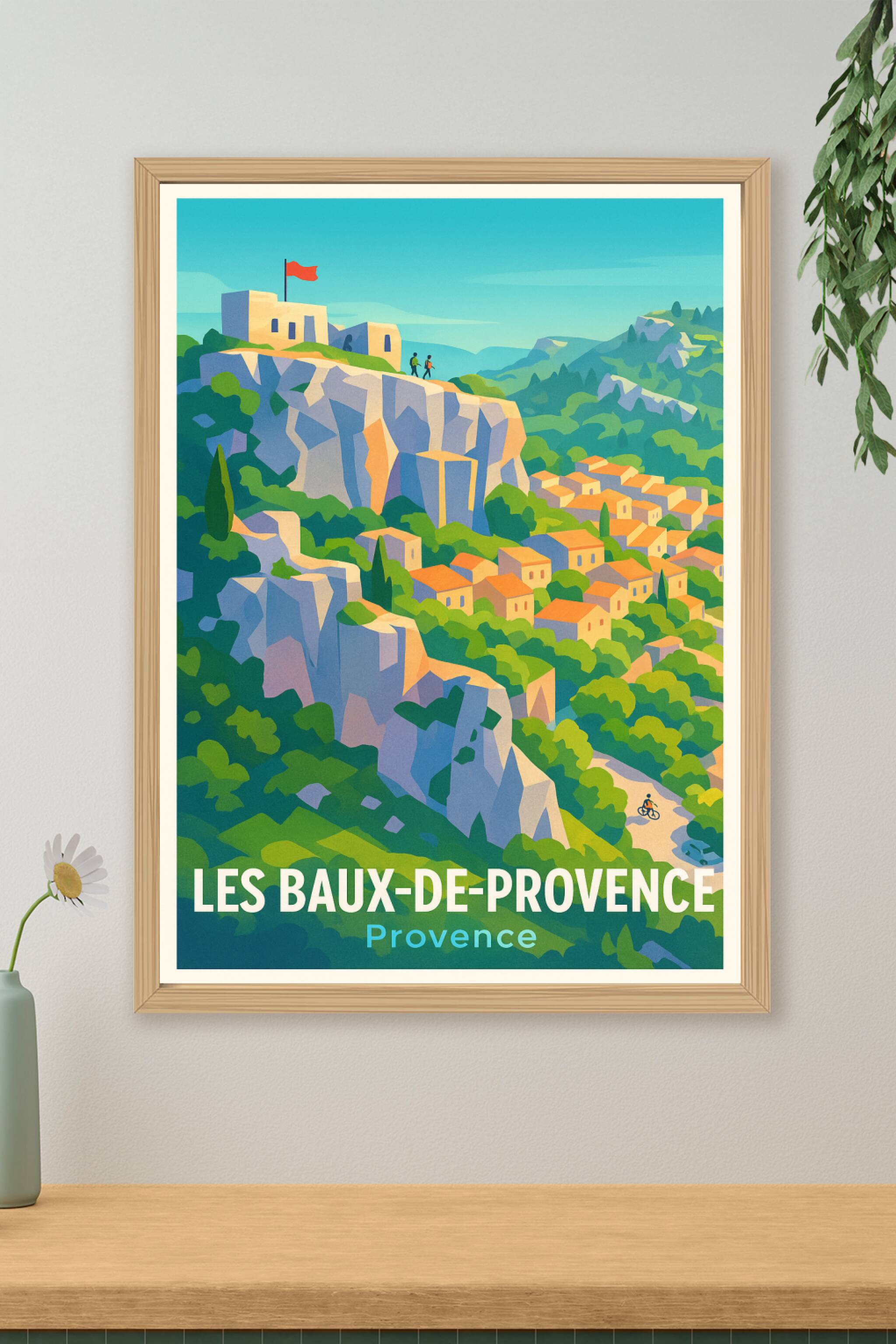 Plongez dans l'atmosphère envoûtante des Baux-de-Provence avec ce poster illustré au style néo-rétro vibrant. Perché sur son rocher, ce village emblématique est entouré d'une nature luxuriante et de maisons aux toits ocre baignées de soleil.