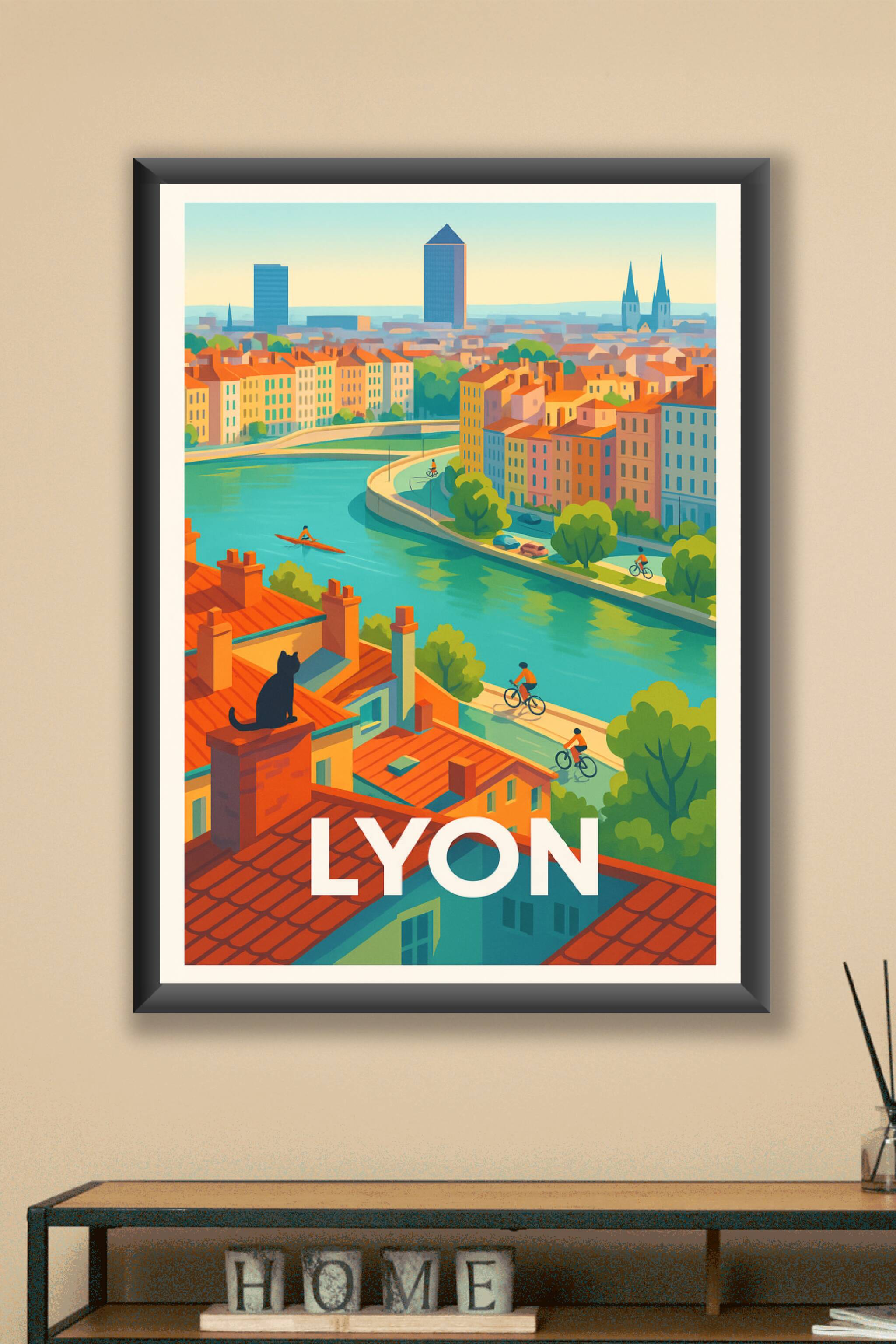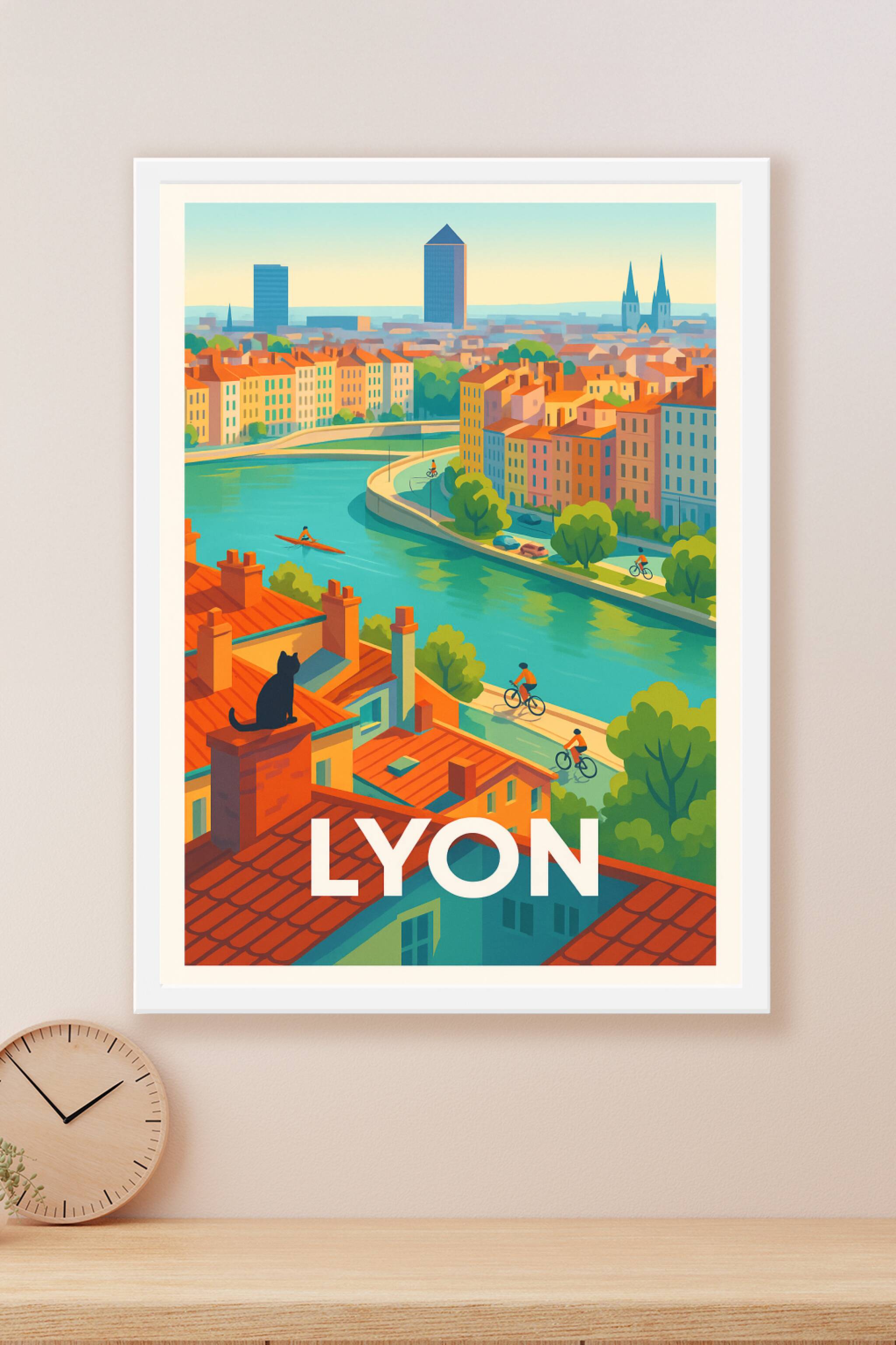 Plongez dans l'ambiance chaleureuse de la capitale des Gaules avec ce poster au style néo-rétro éclatant. Cette affiche capture la quiétude de la v...