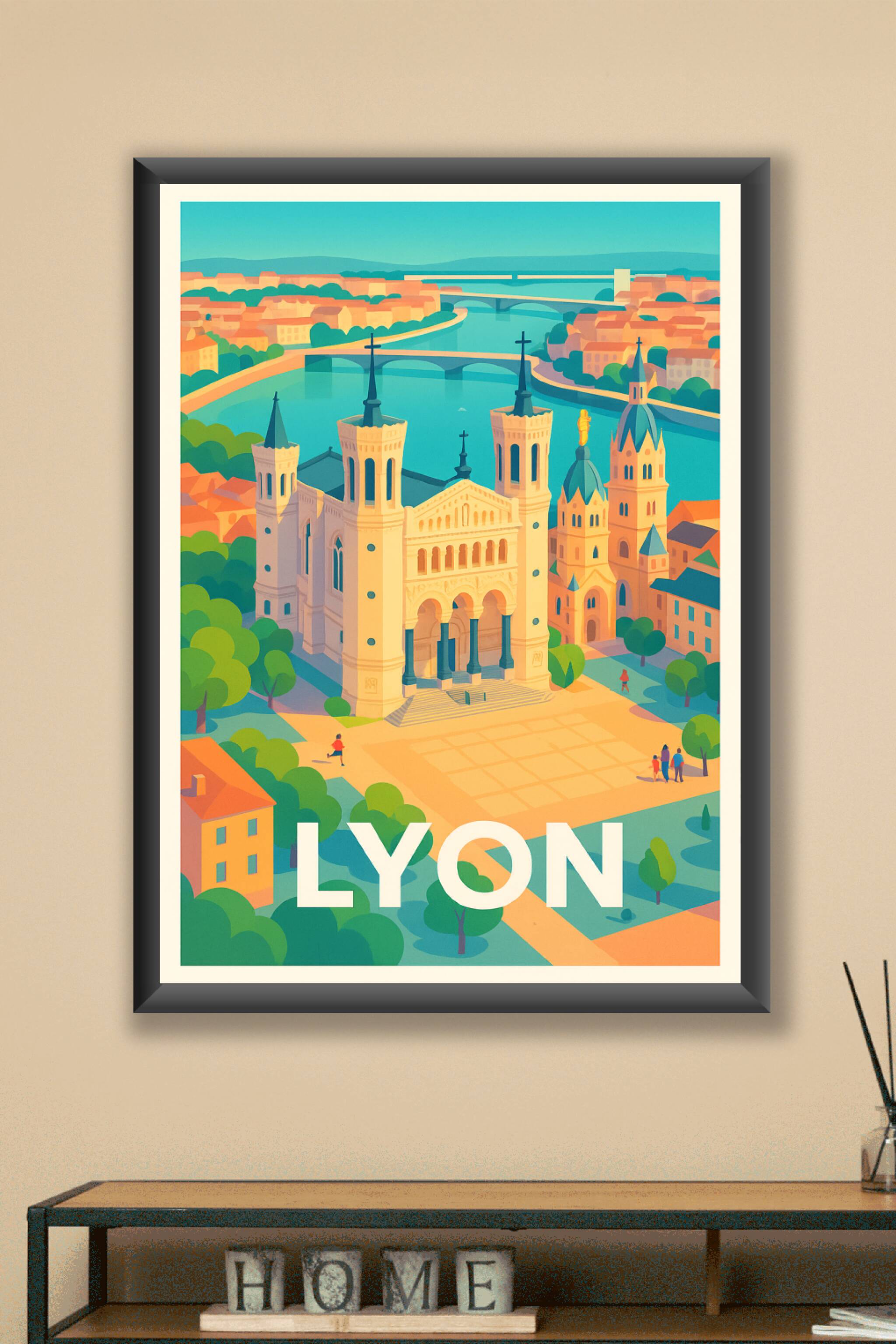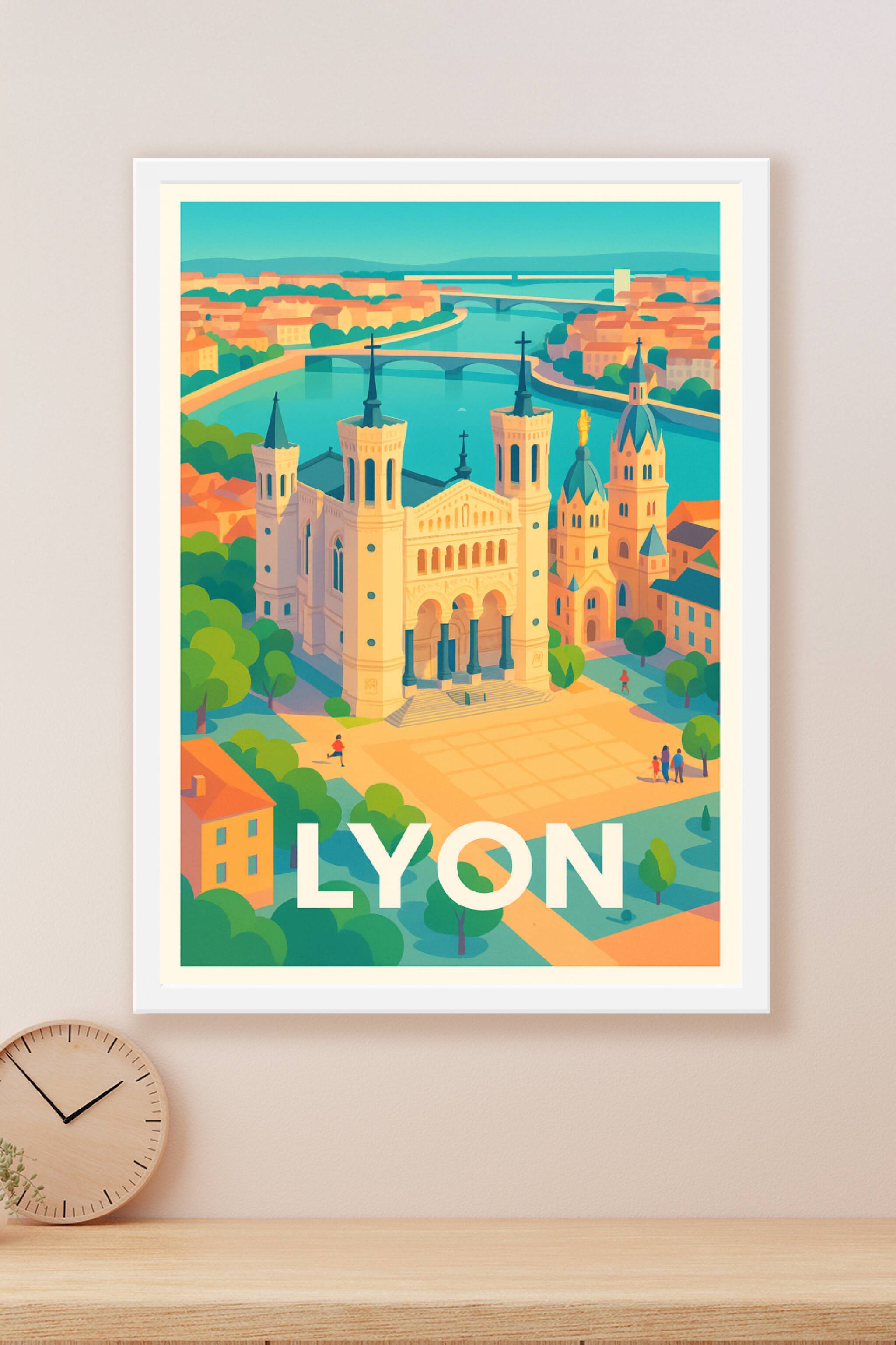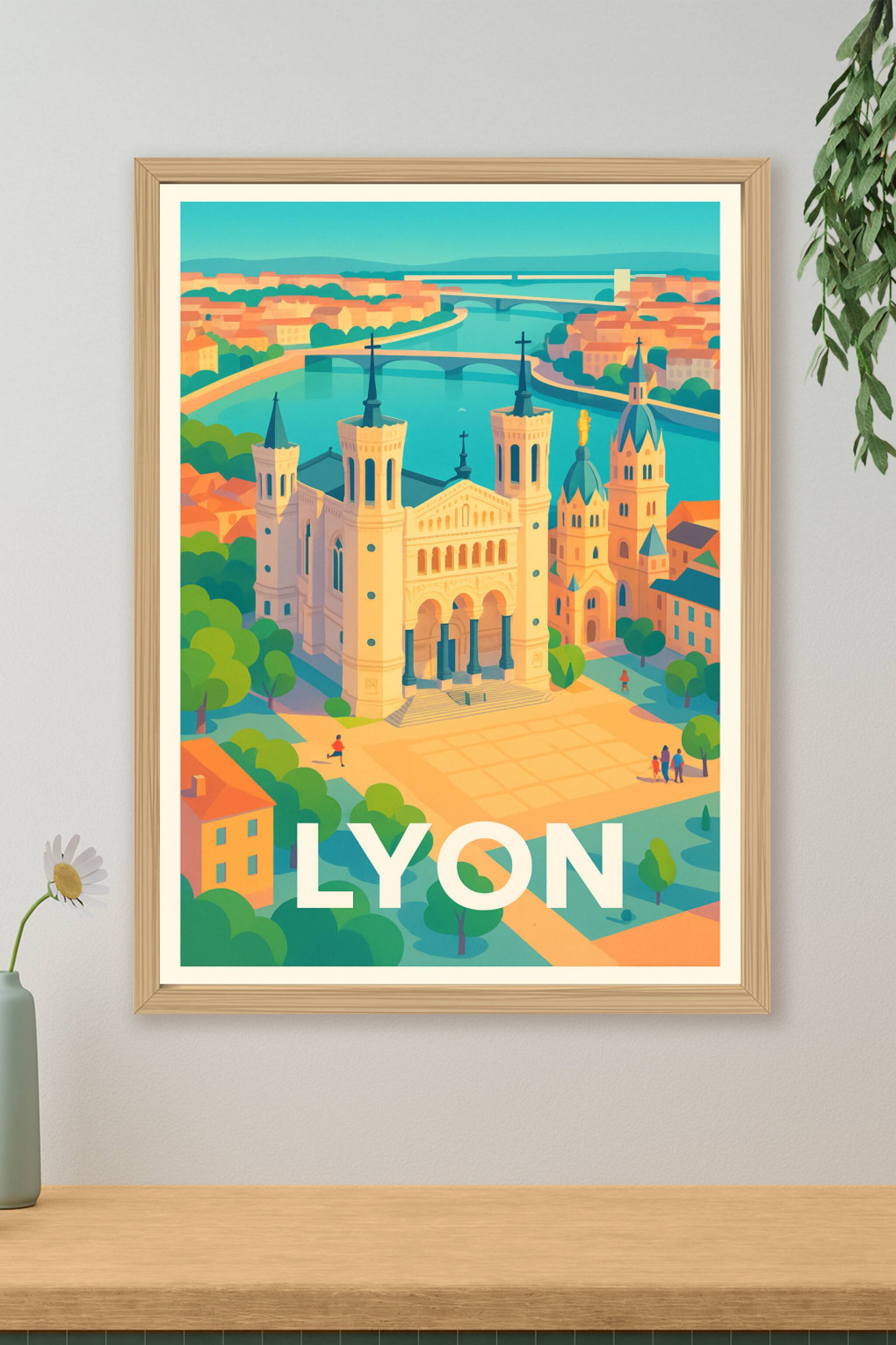 Apportez le charme intemporel de Lyon à votre intérieur avec ce poster élégant illustré dans un style graphique néo-rétro. La majestueuse basilique de Fourvière surplombe la Saône et les toits colorés de la ville sur cette affiche artistique.