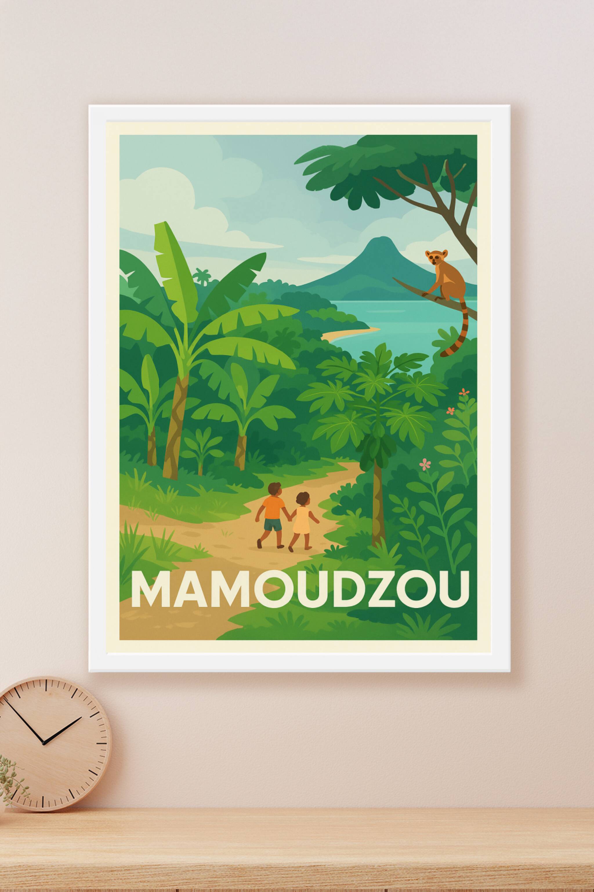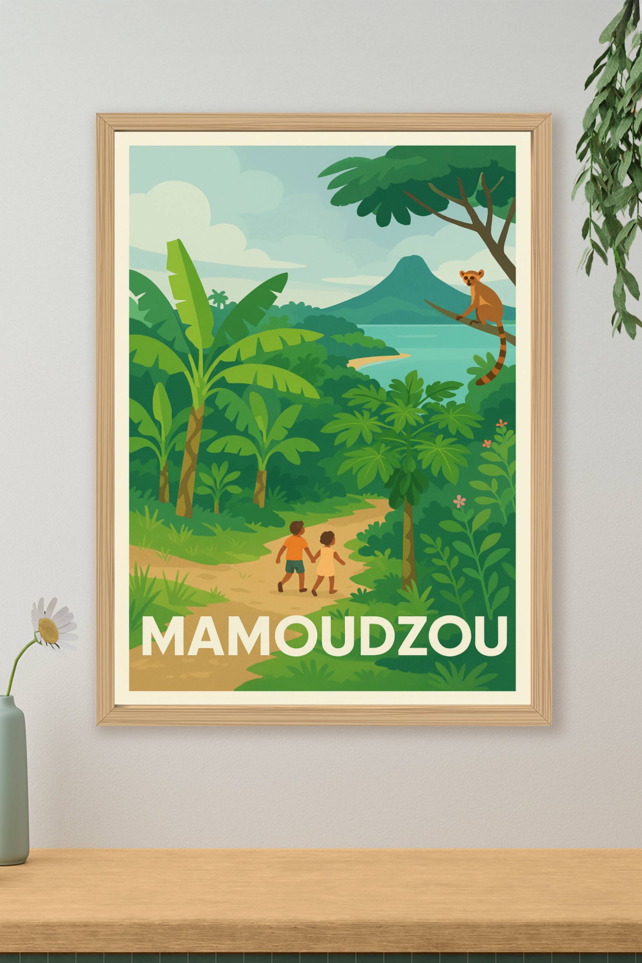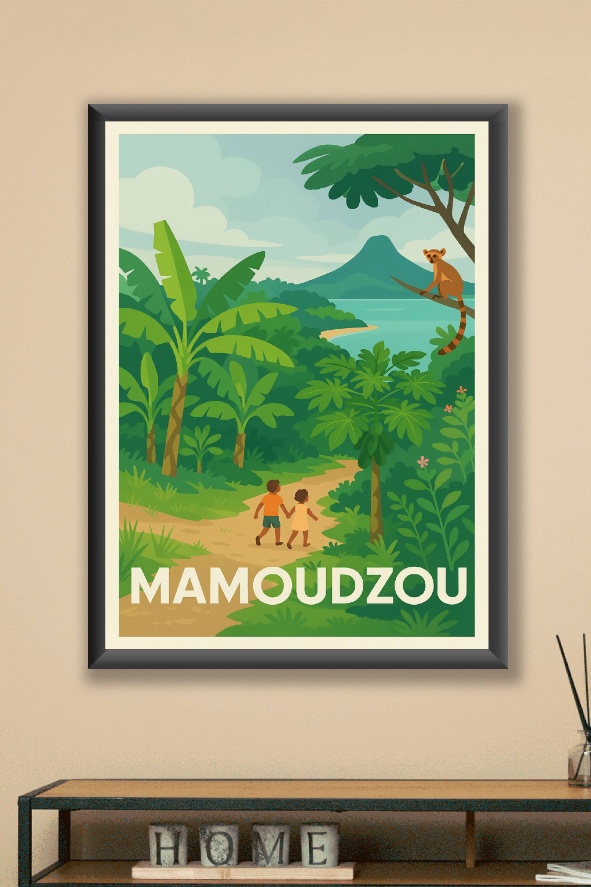 Découvrez l'évasion et la douceur de Mamoudzou avec cette superbe affiche illustrée qui capture la richesse de sa végétation luxuriante et la beaut...