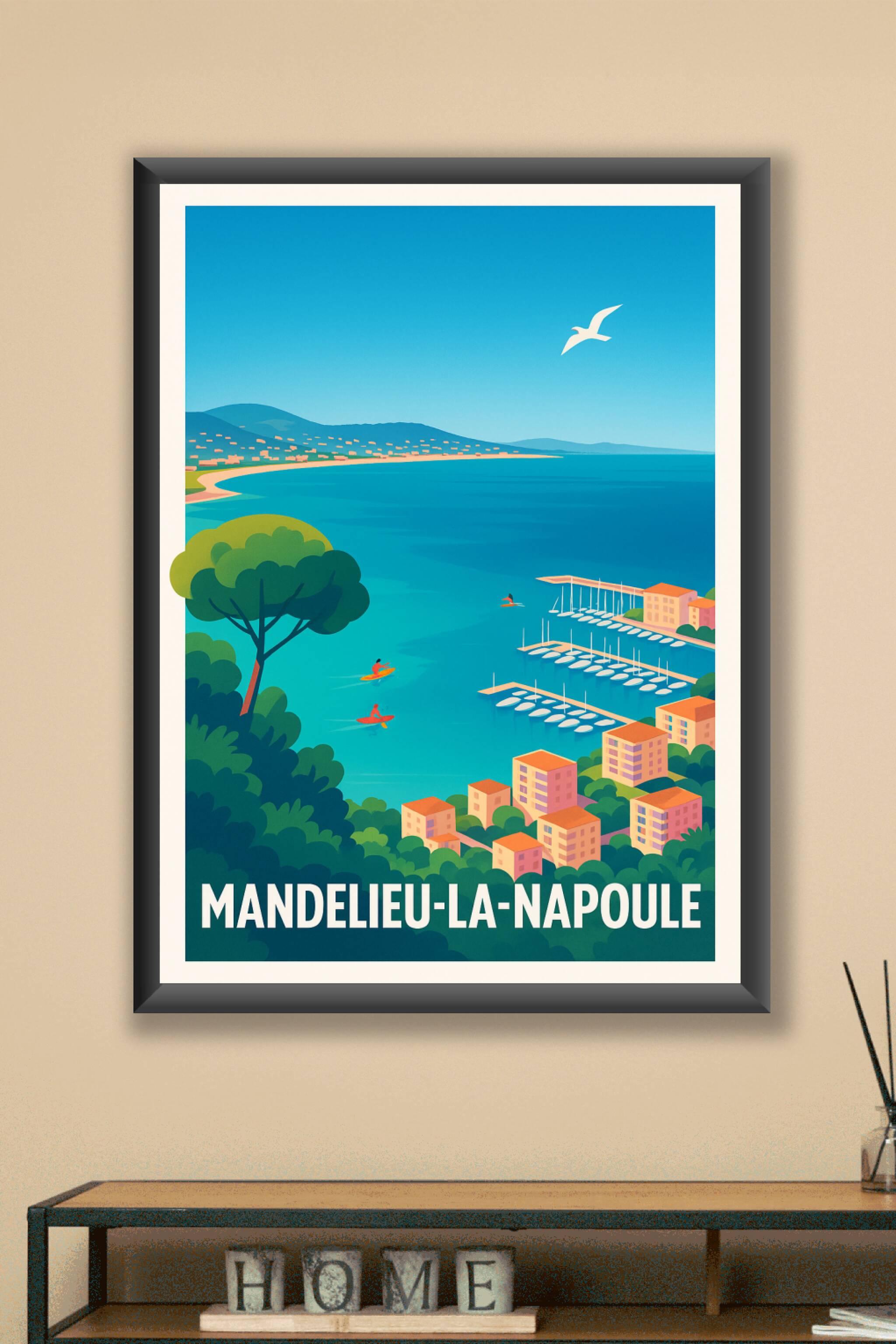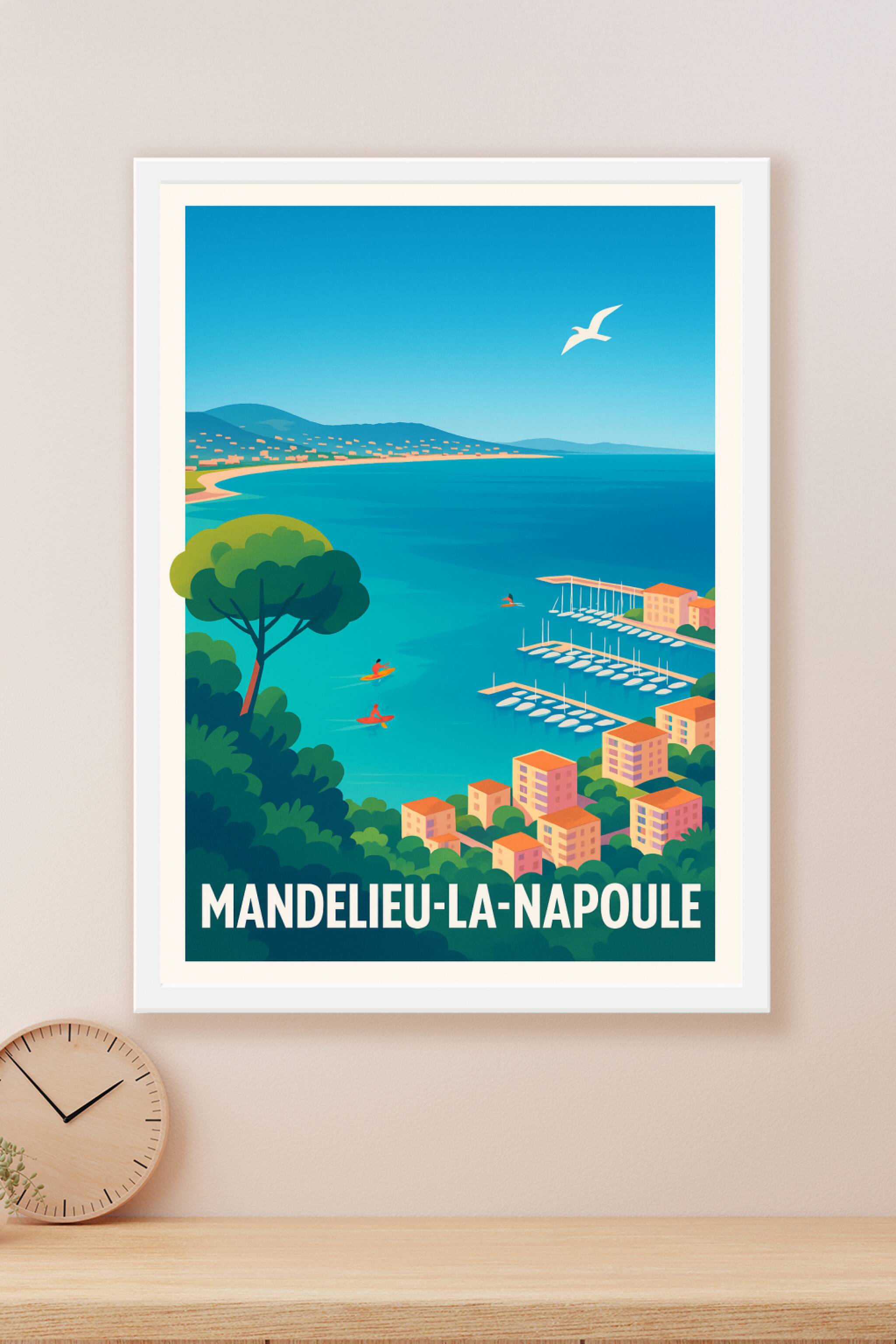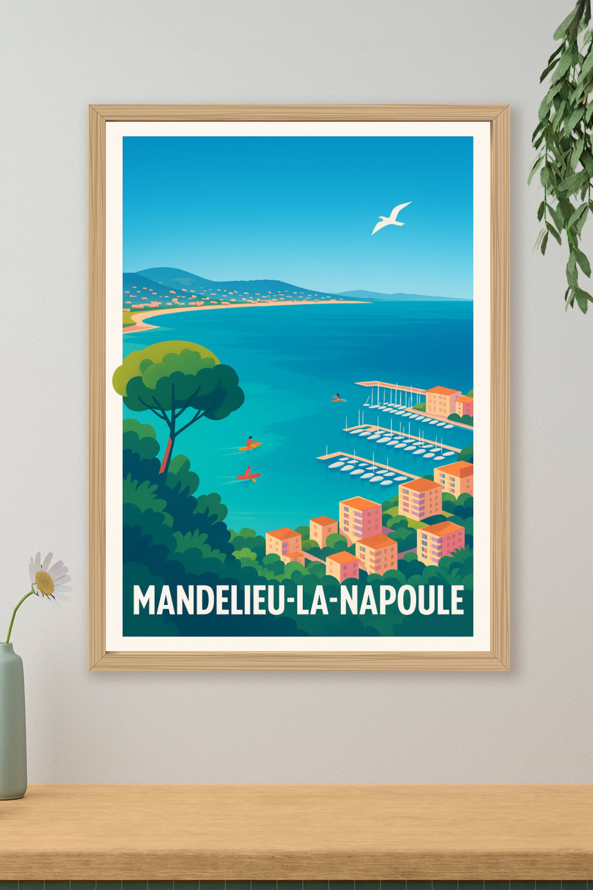 Découvrez la douceur méditerranéenne de Mandelieu-la-Napoule avec cette affiche illustrée aux couleurs vibrantes et au style rétro. Le poster met e...
