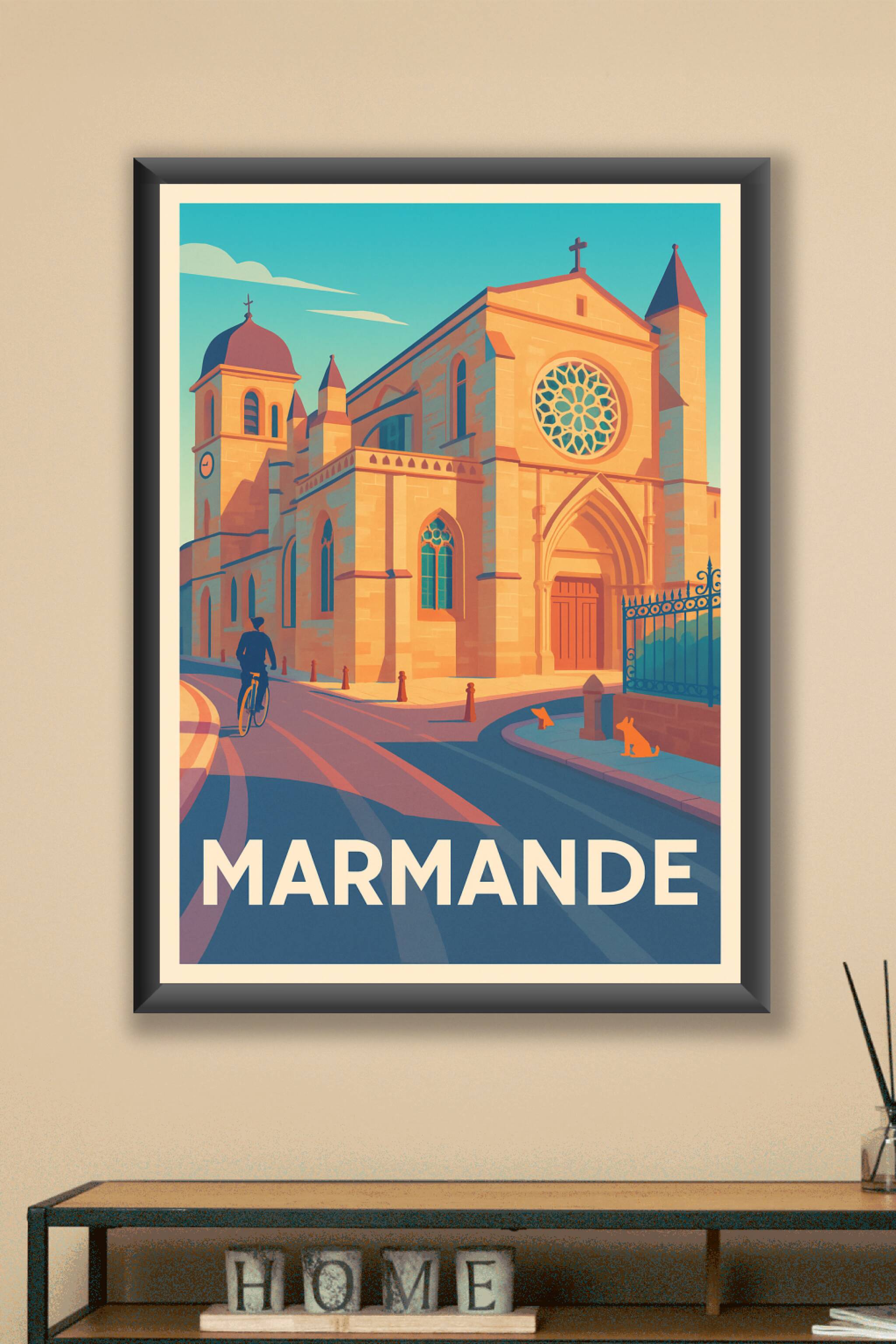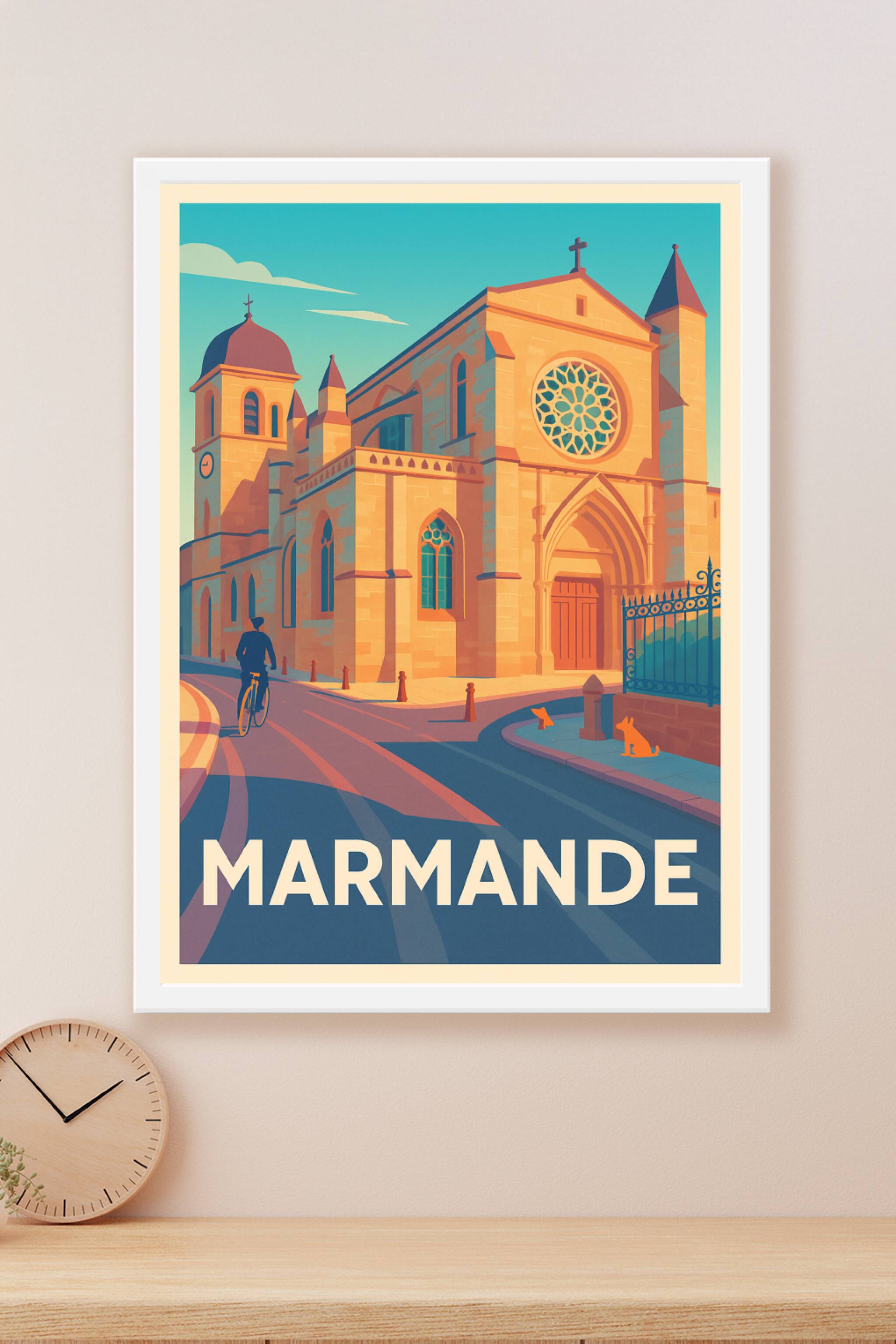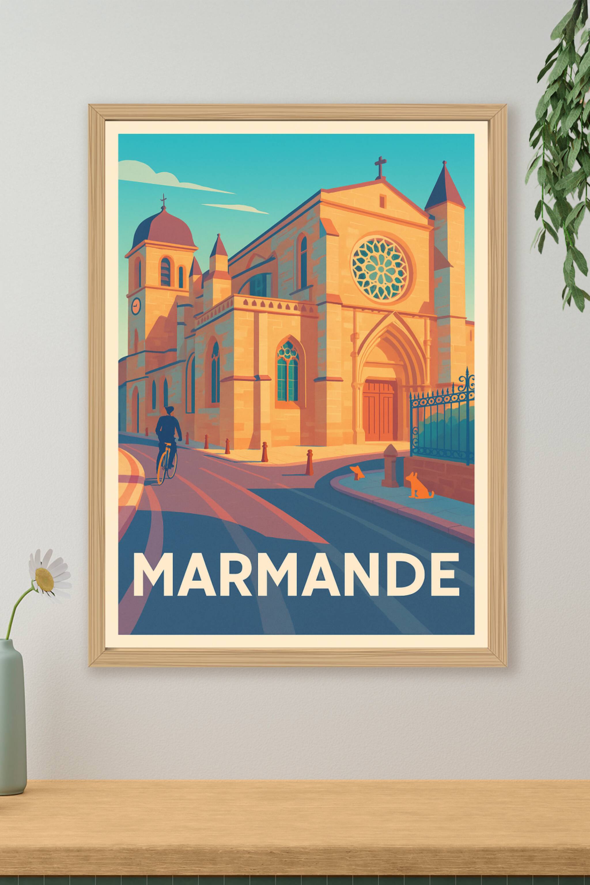 Découvrez cette affiche au style vintage représentant un coin paisible de Marmande, avec sa magnifique église baignée par la lumière douce du solei...