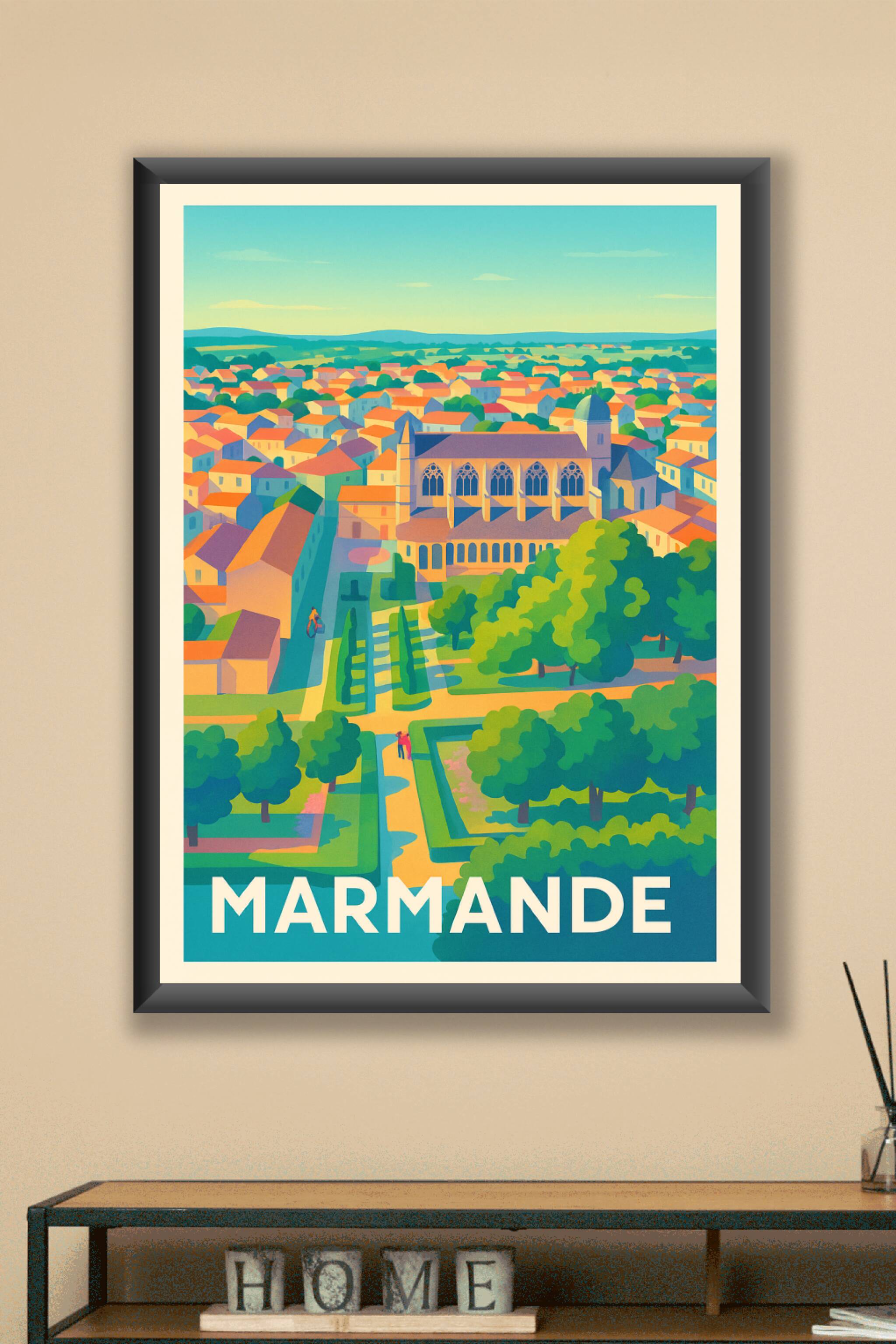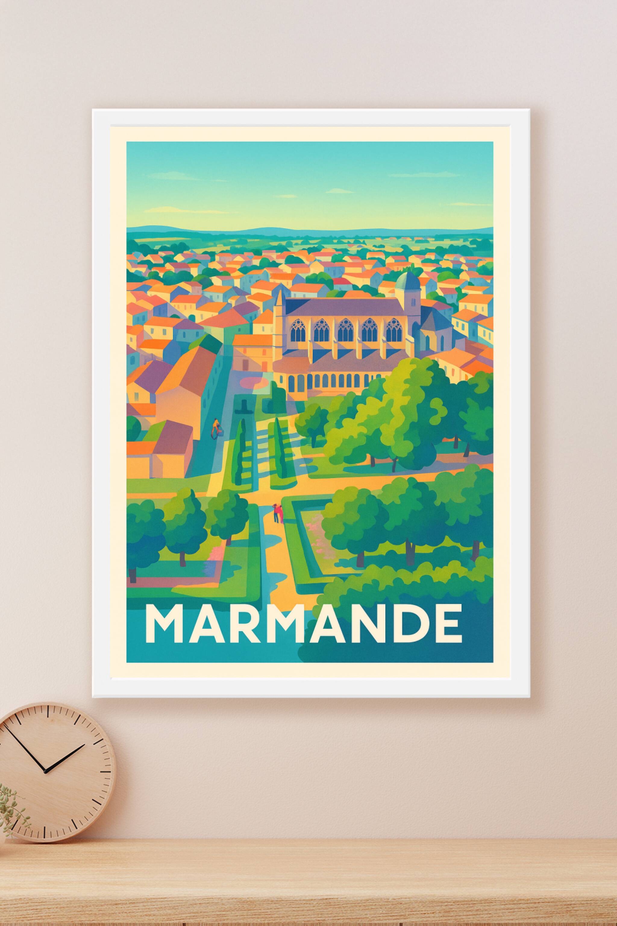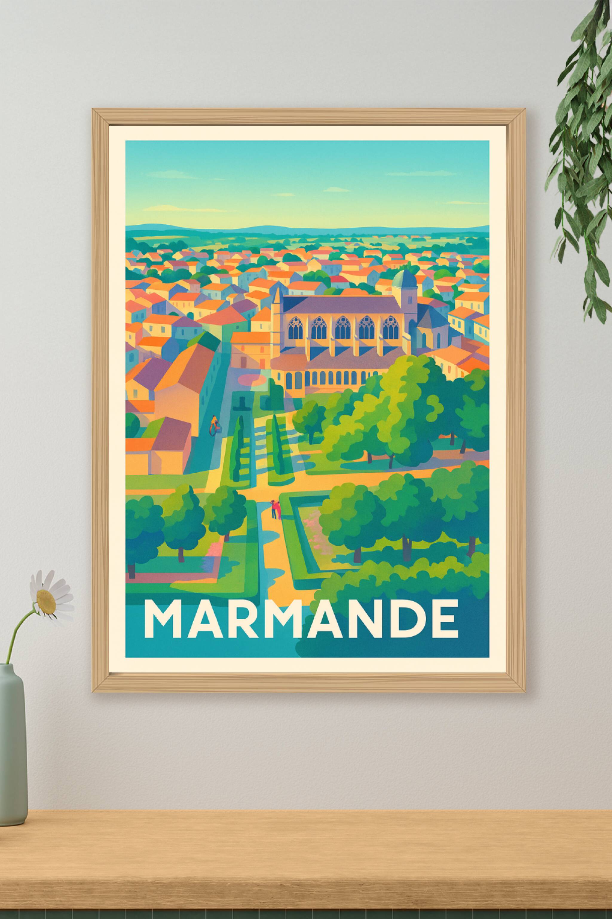 Découvrez la douceur de vivre à Marmande avec cette affiche au style graphique et coloré qui met en avant l'architecture emblématique et les espace...