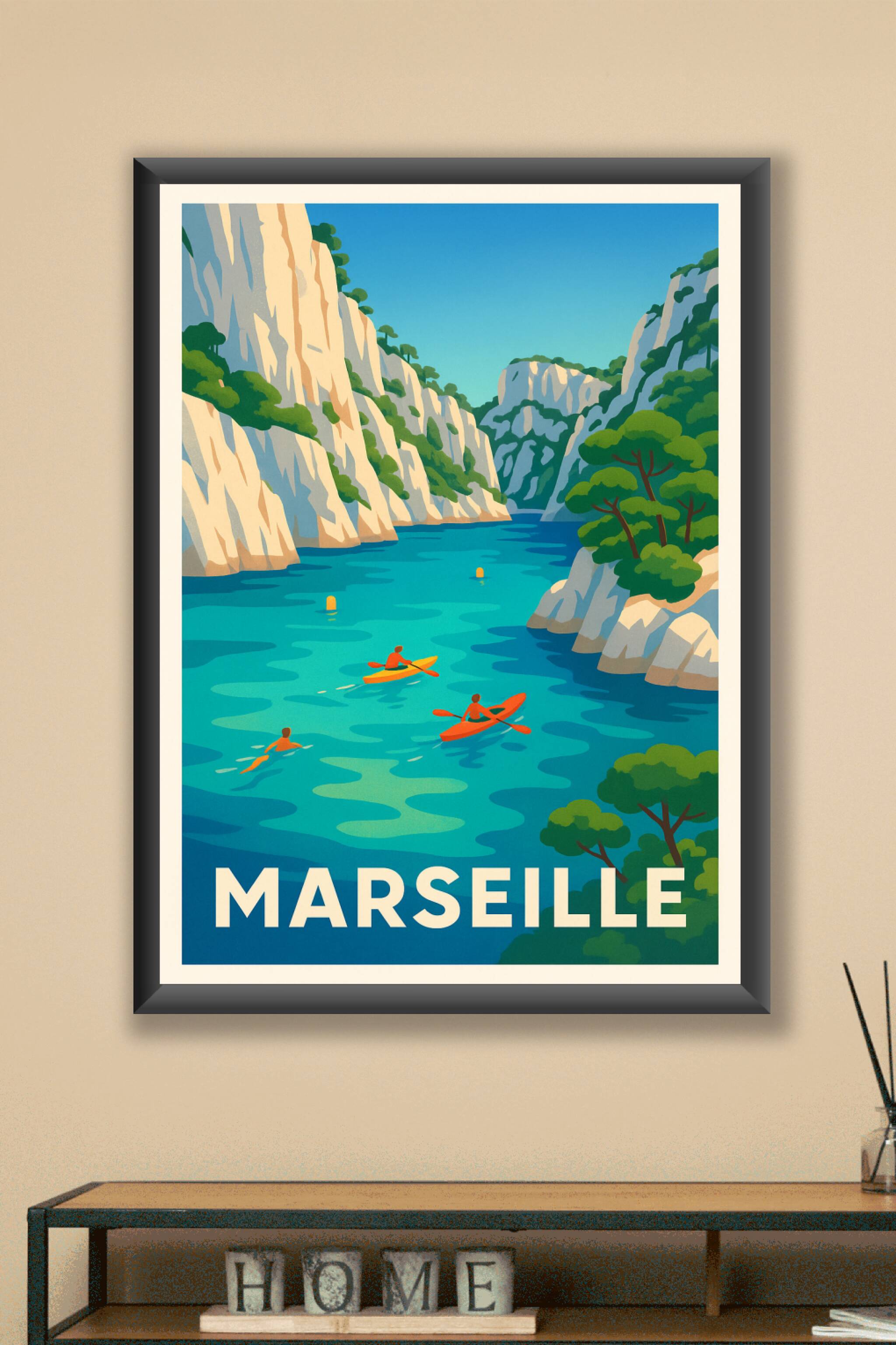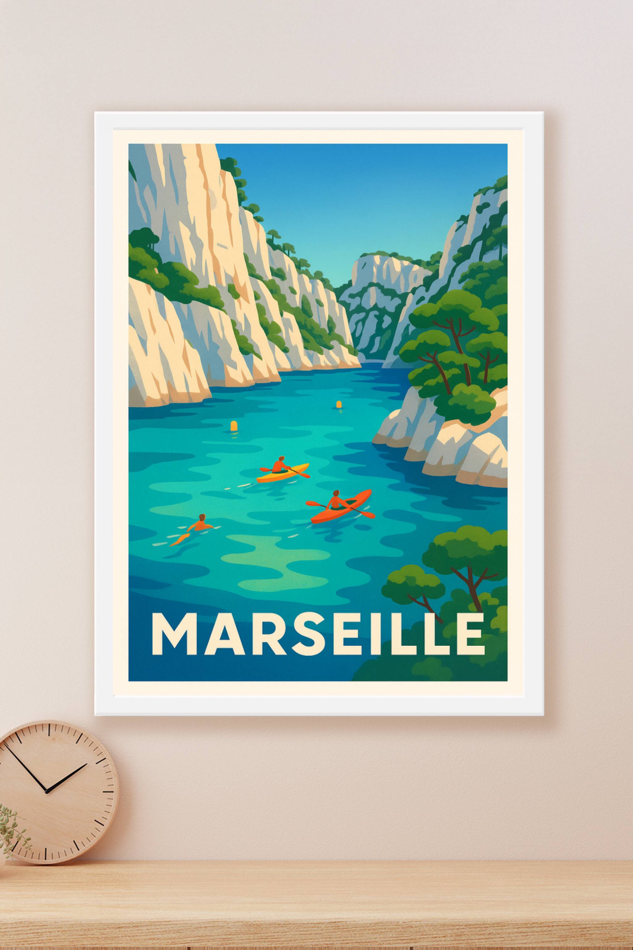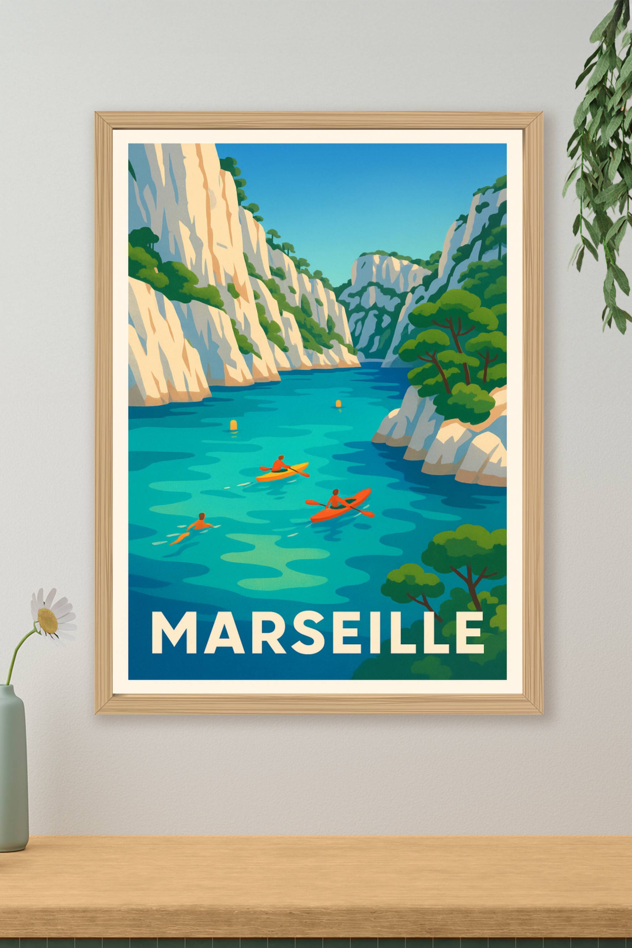 Plongez dans l'ambiance ensoleillée du Sud avec ce magnifique poster des calanques de Marseille. Entre mer turquoise et falaises blanches, cette affiche au style néo-rétro capture toute la beauté sauvage de la Méditerranée.