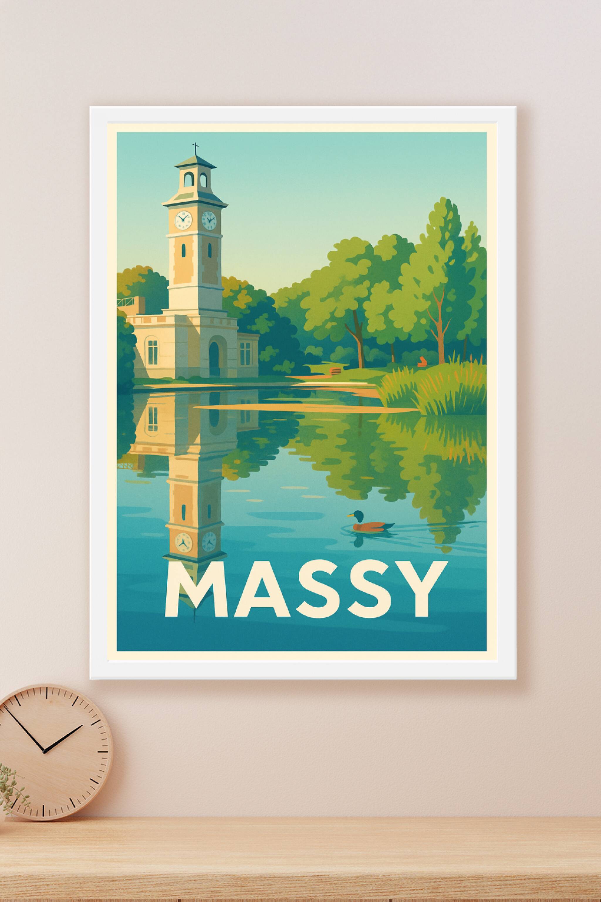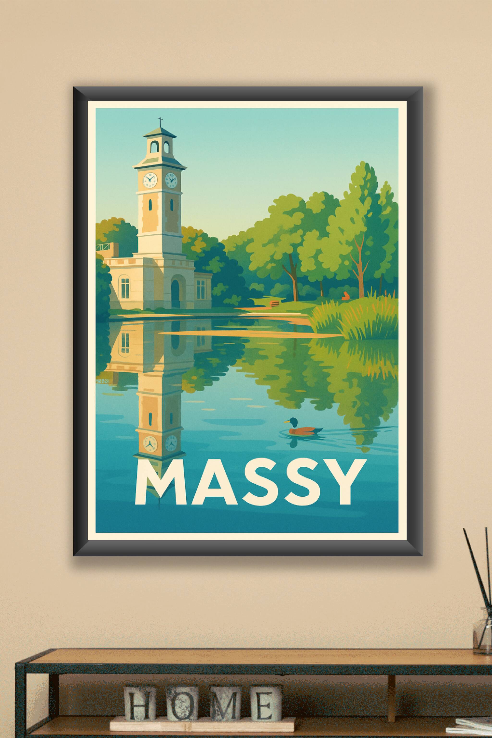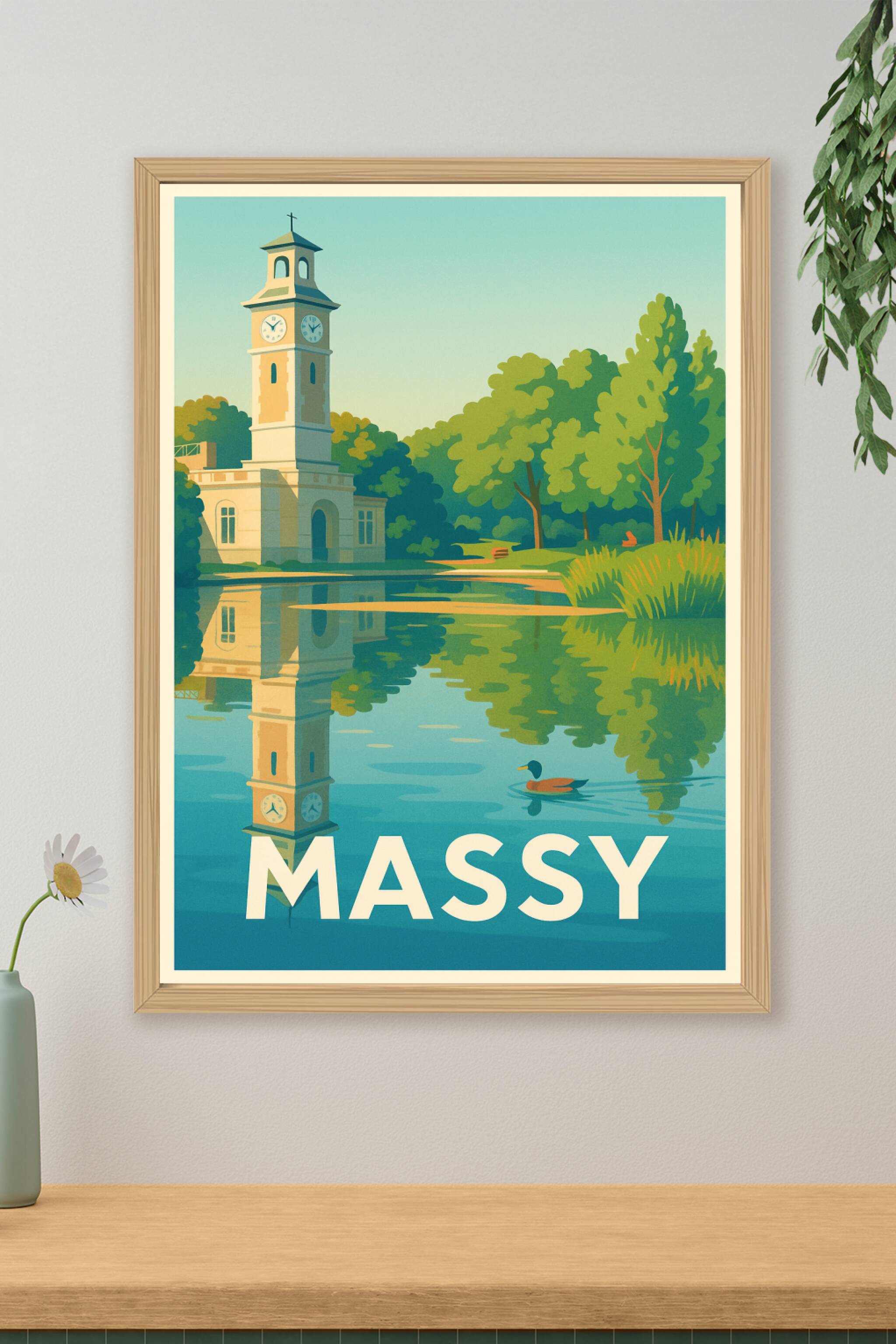Découvrez la douceur paisible de Massy à travers cette affiche élégante représentant un paysage naturel où une tour horloge se reflète dans l'eau c...