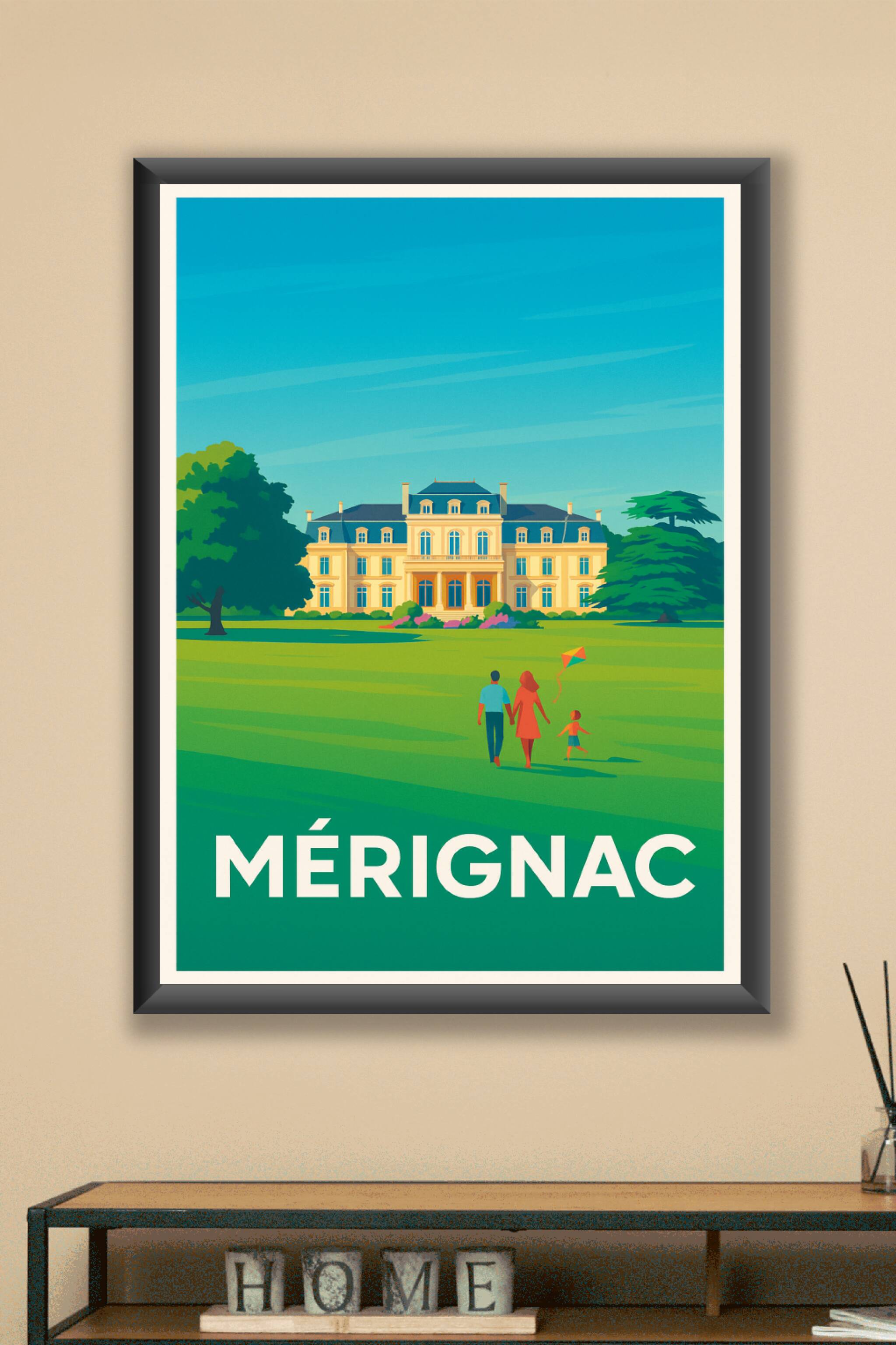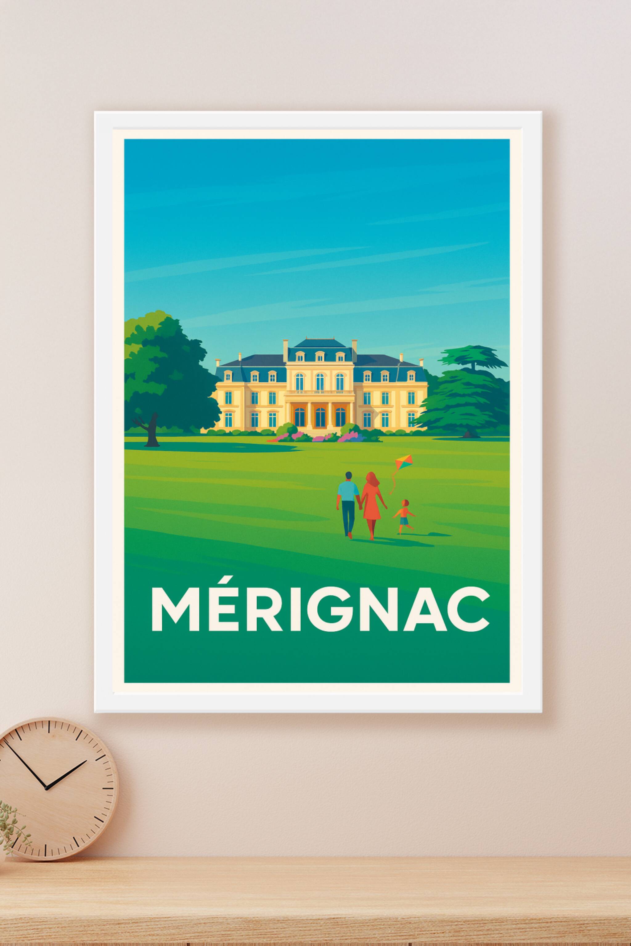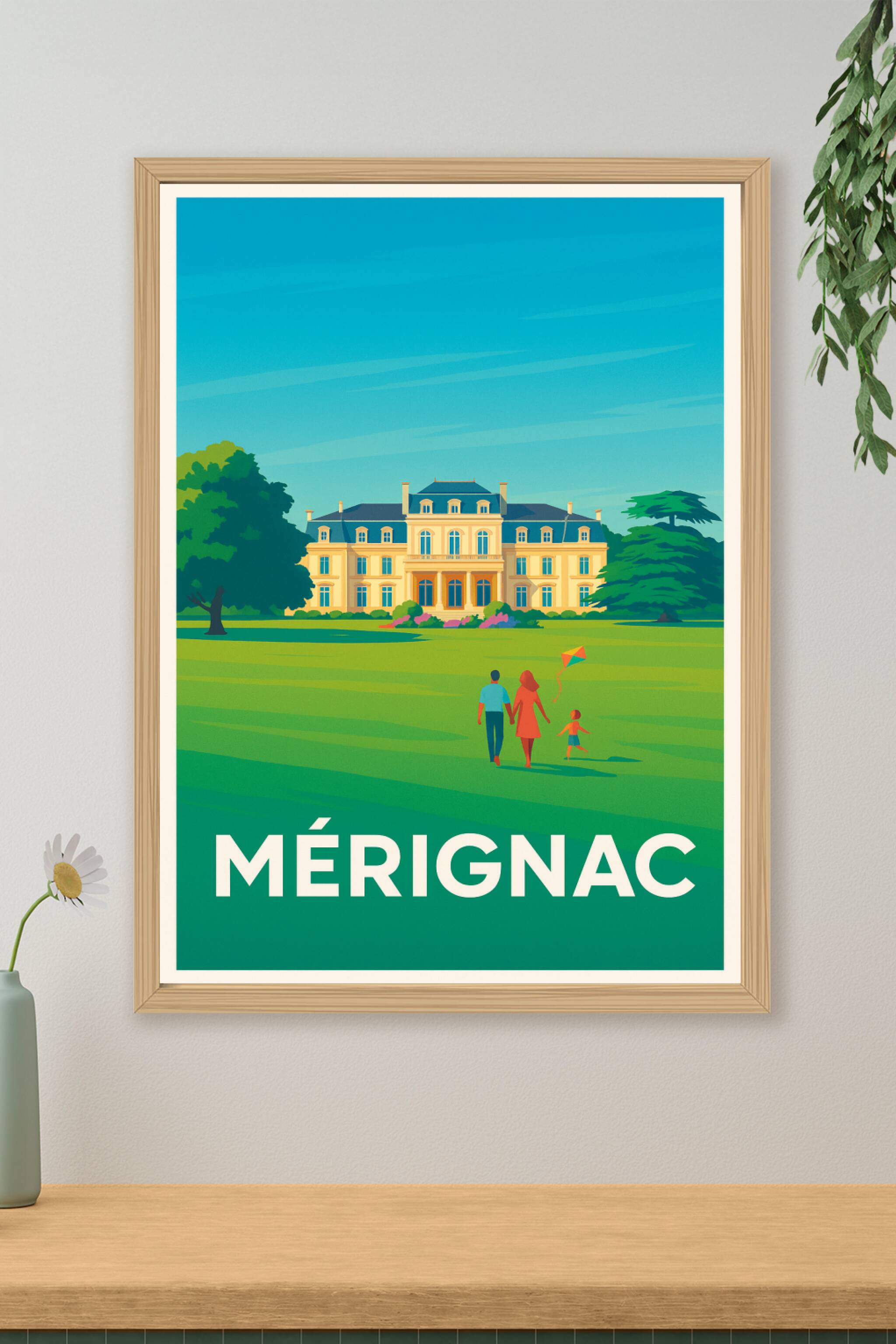 Découvrez la douceur de vivre à Mérignac avec cette affiche illustrée mettant en scène un château majestueux aux abords d'un grand parc verdoyant. ...