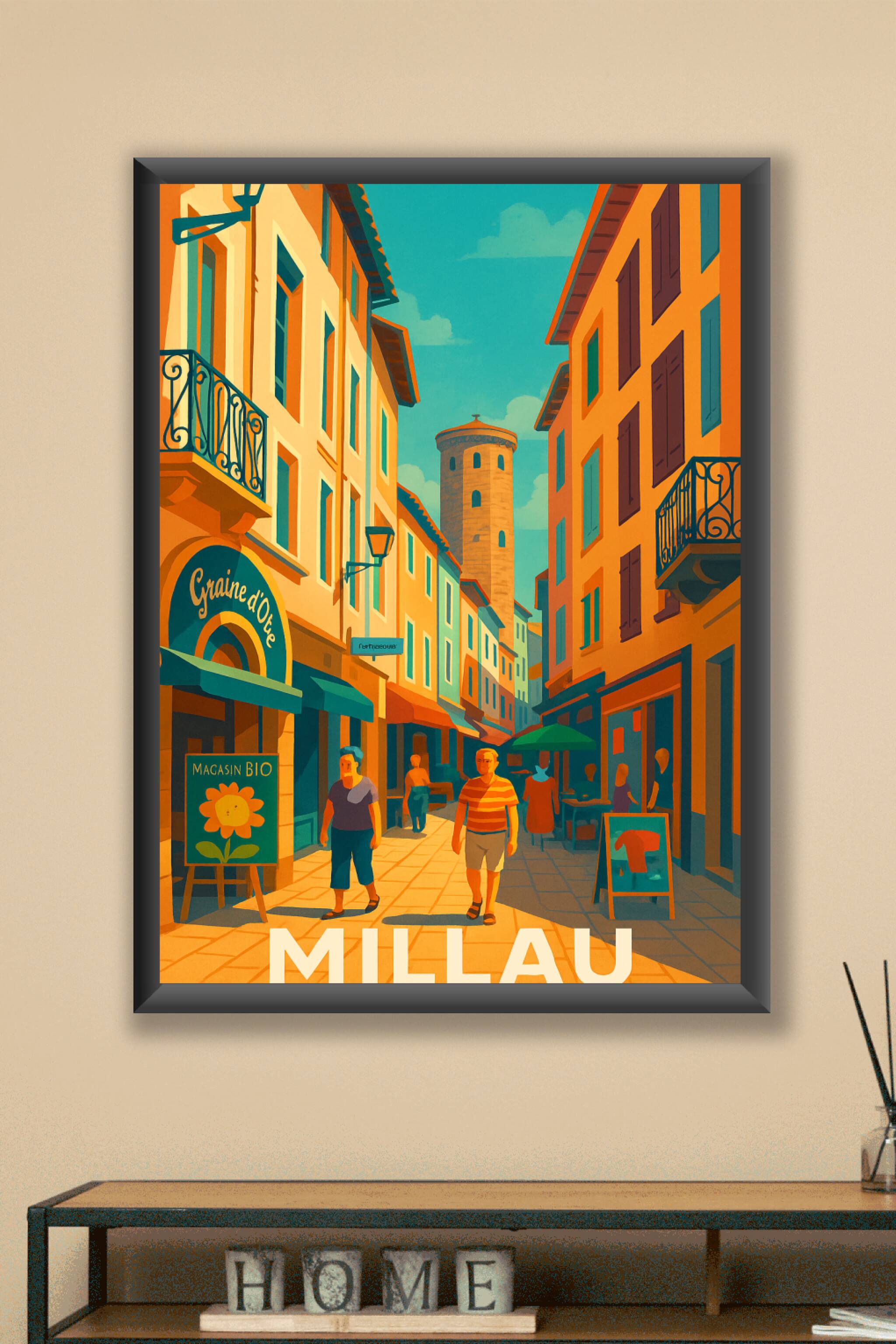 Explorez le charme pittoresque de Millau avec cette affiche illustrée capturant une ruelle animée et baignée de soleil, dominée par sa célèbre tour...
