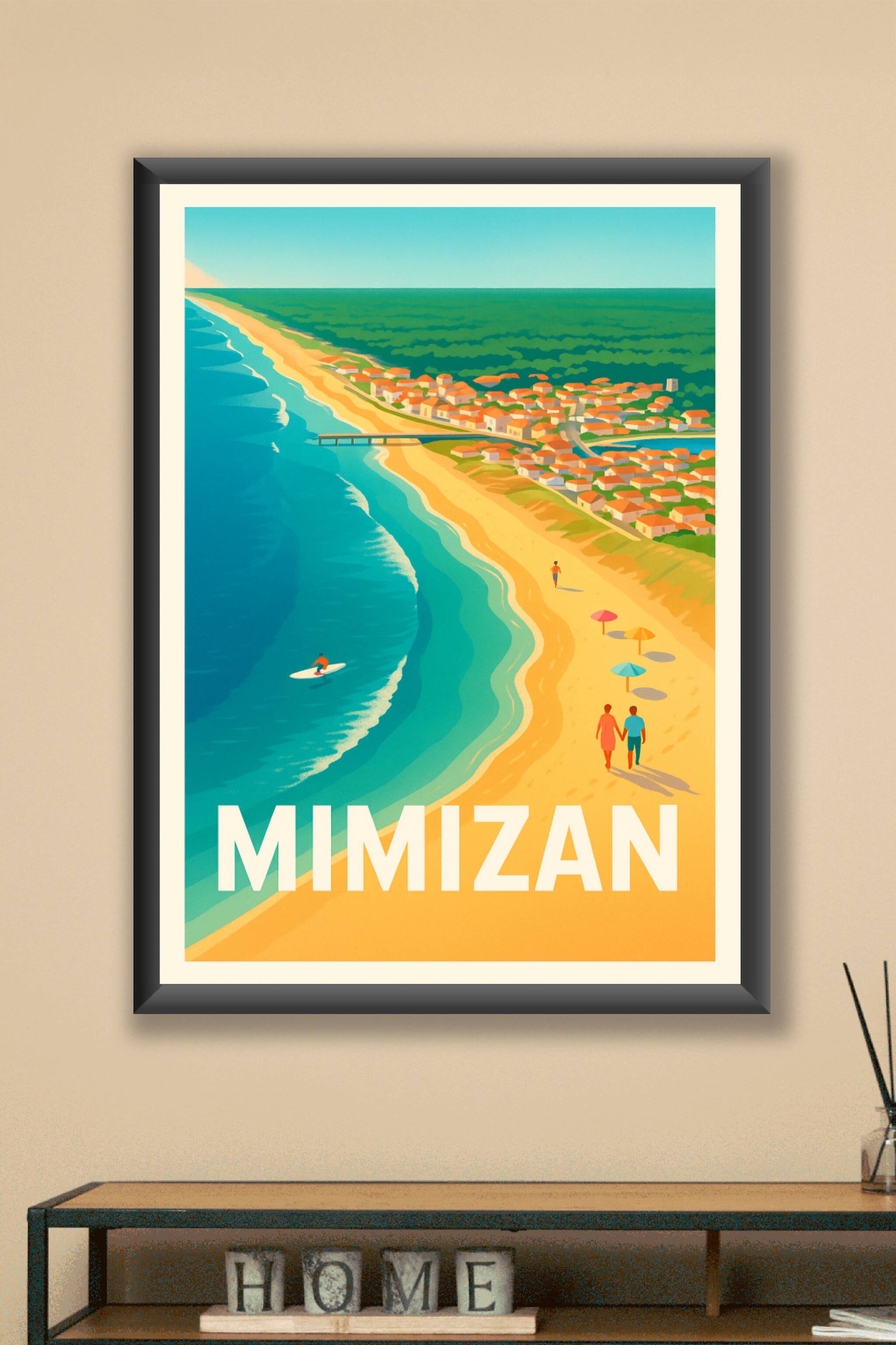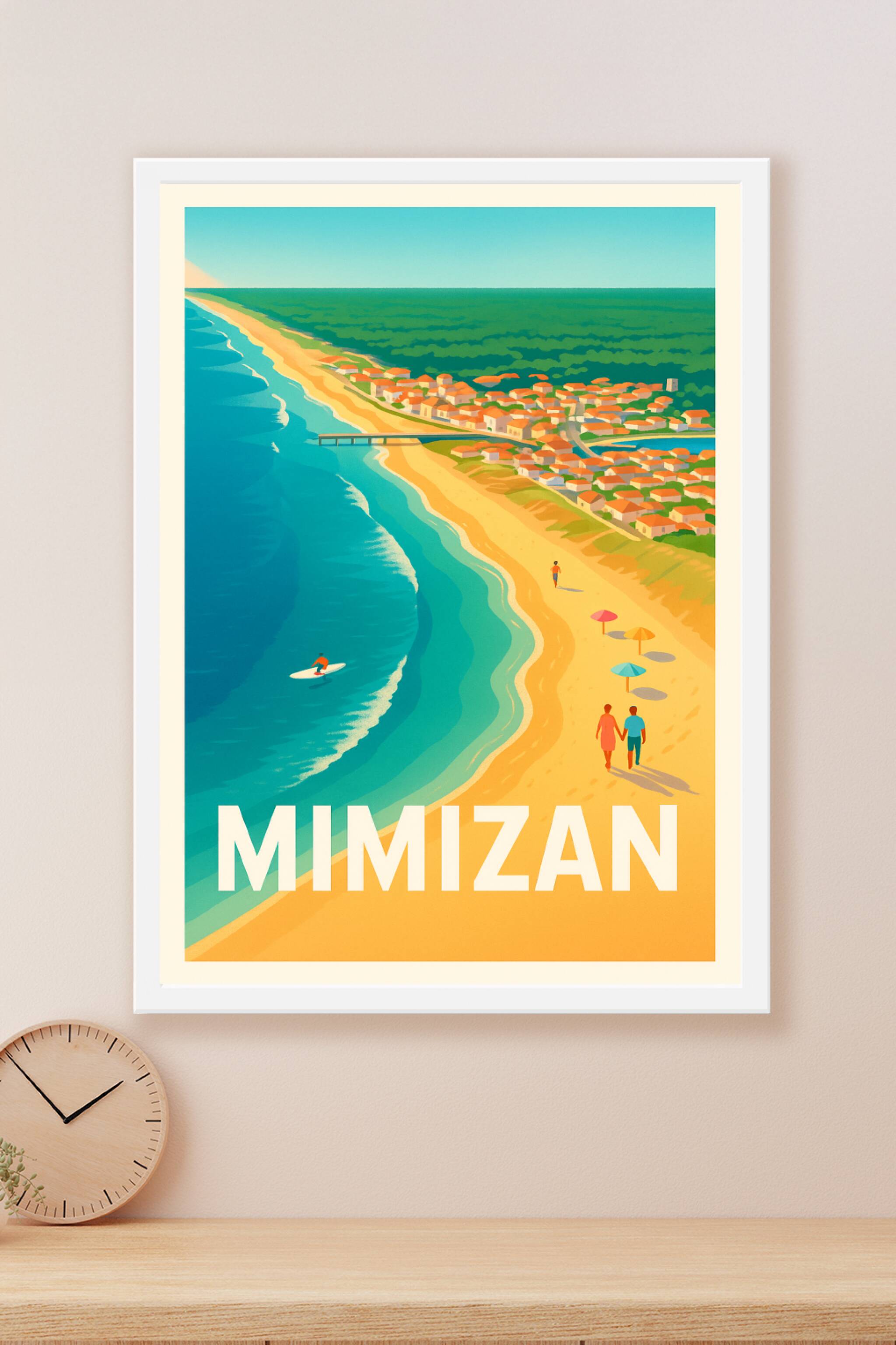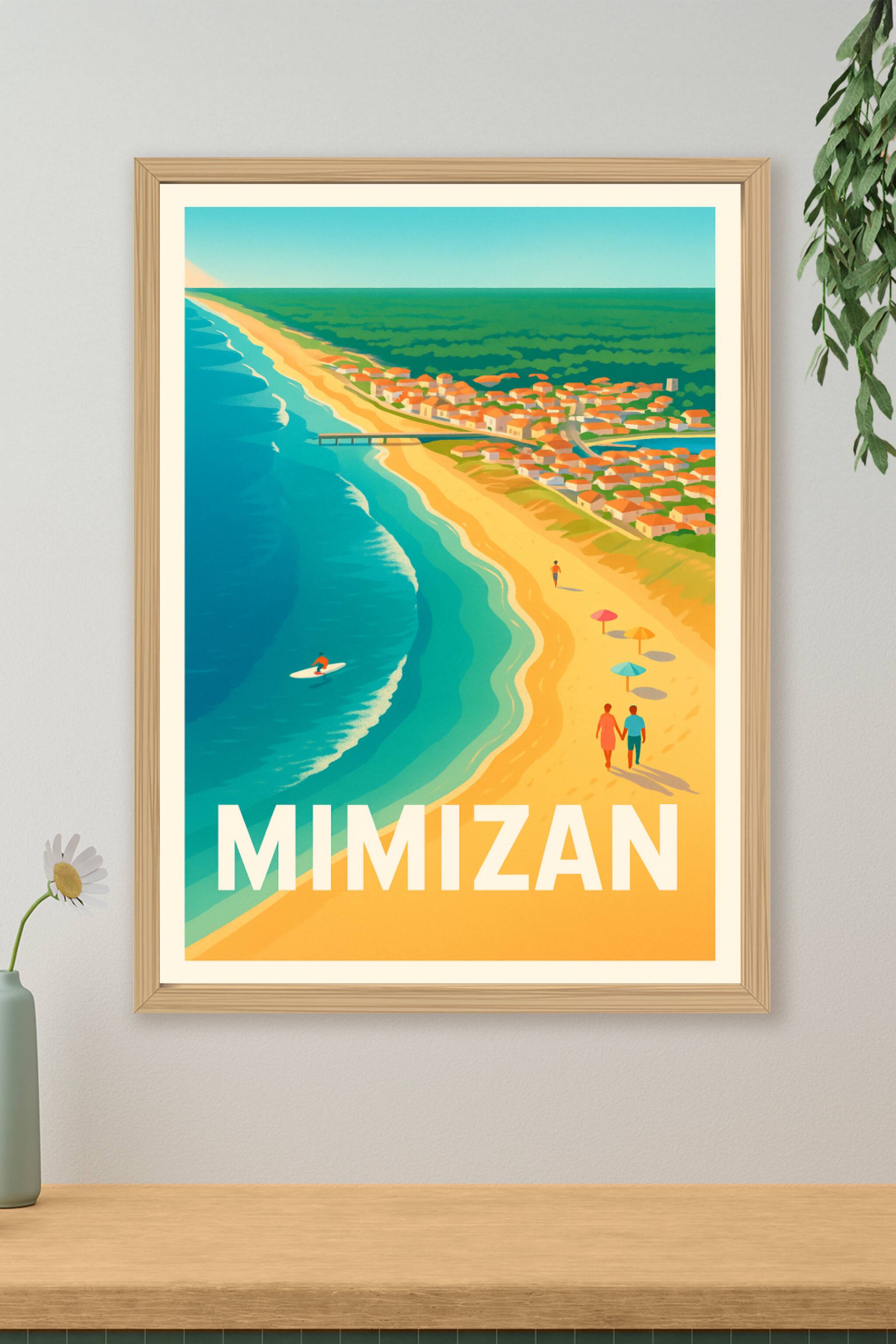 Laissez-vous captiver par cette affiche illustrée de Mimizan représentant une vue idyllique de la plage, ses promeneurs, son surfeur solitaire et l...