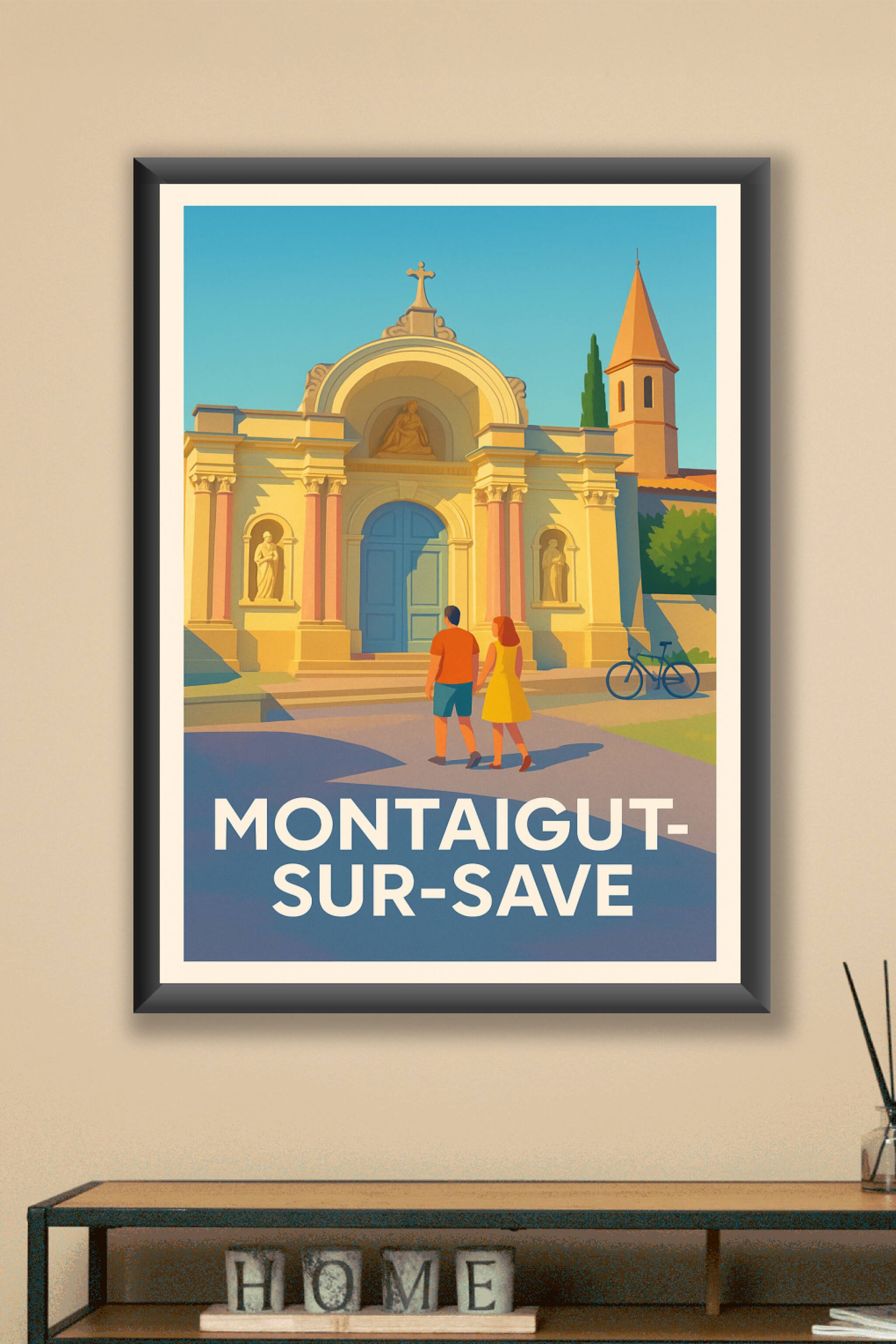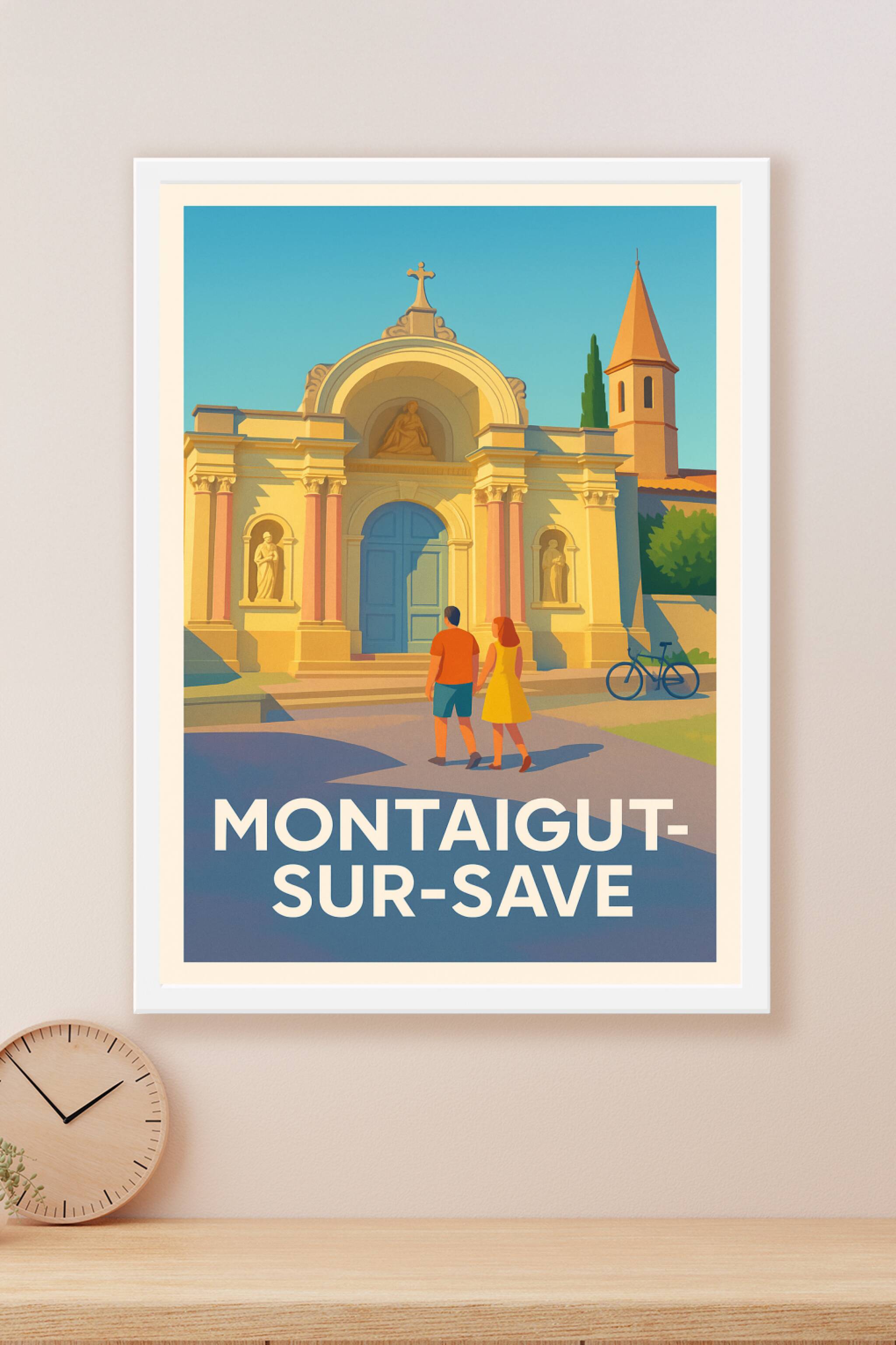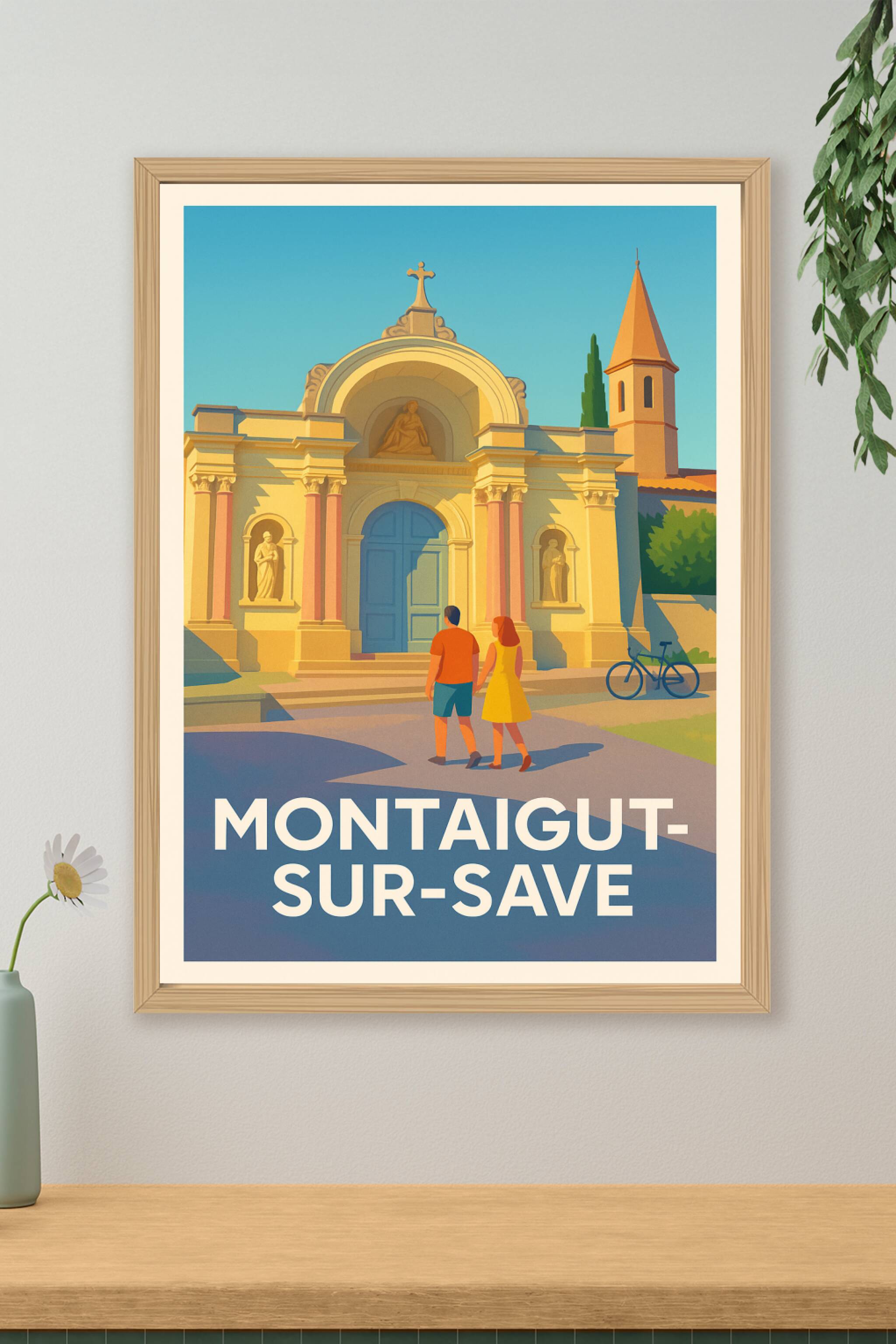Découvrez la quiétude et la beauté architecturale de Montaigut-sur-Save avec cette affiche illustrée aux couleurs chaudes et lumineuses. Cette scène montre un couple admirant la façade détaillée de l'église locale, capturant un moment paisible sous un ciel azur. Le poster est proposé en tirage "Fine Art" sur papier 305g coton pour une qualité d'impression exceptionnelle, garantissant des couleurs vibrantes et une grande finesse des détails. Disponible en formats A1 à A4, avec ou sans cadre, cette affiche apportera une touche d'authenticité et de douceur à votre intérieur. Parfaite pour les amoureux des villages pittoresques et des escapades culturelles, cette affiche est imprimée avec soin 100% en France.