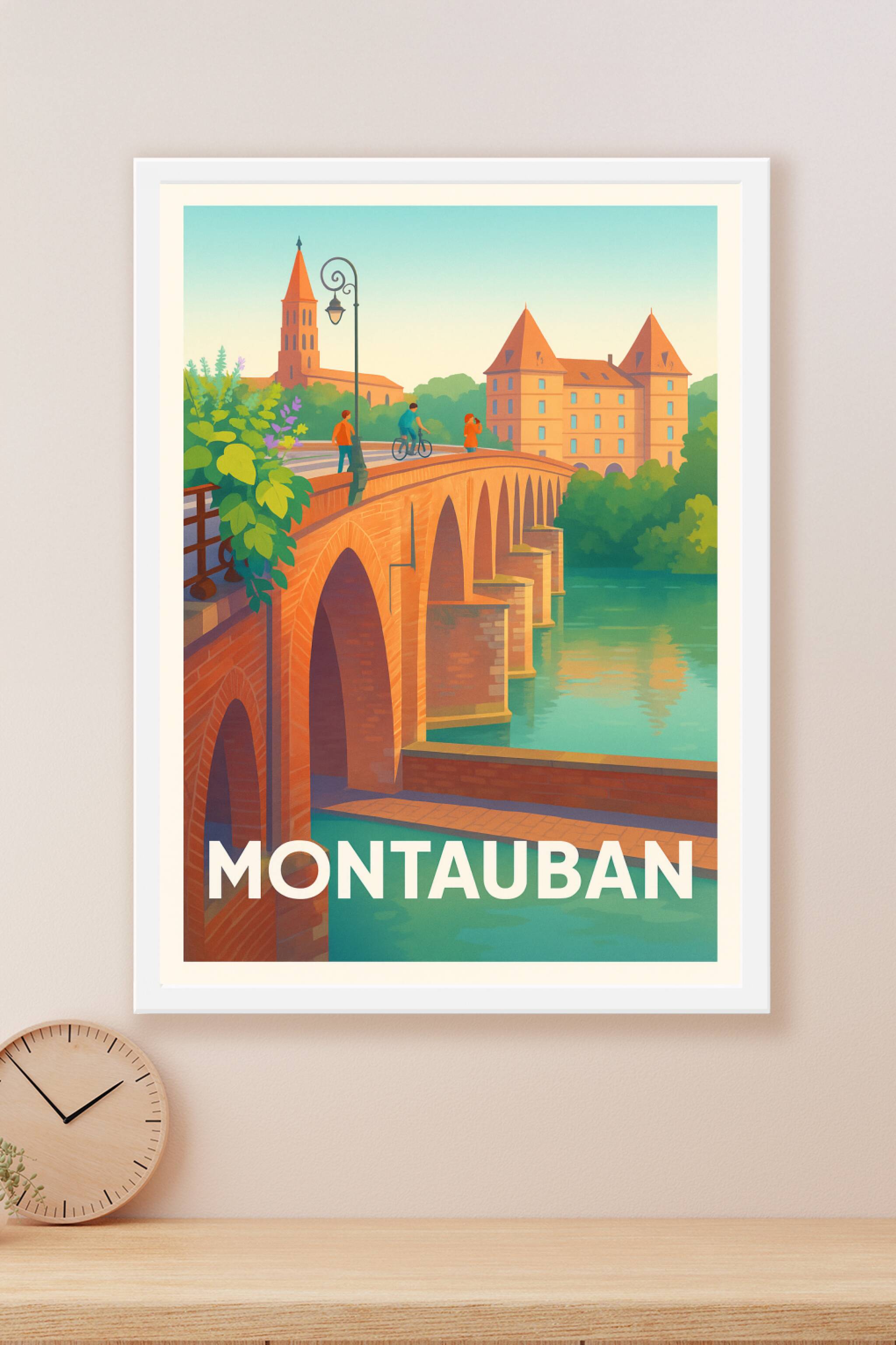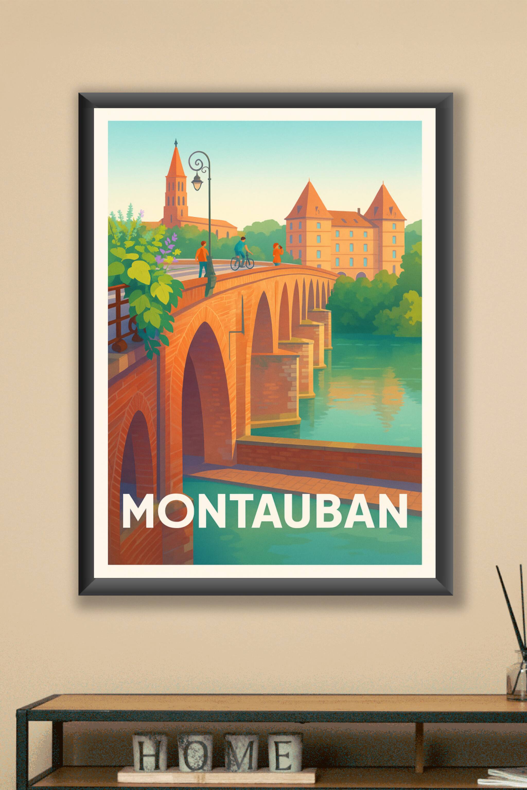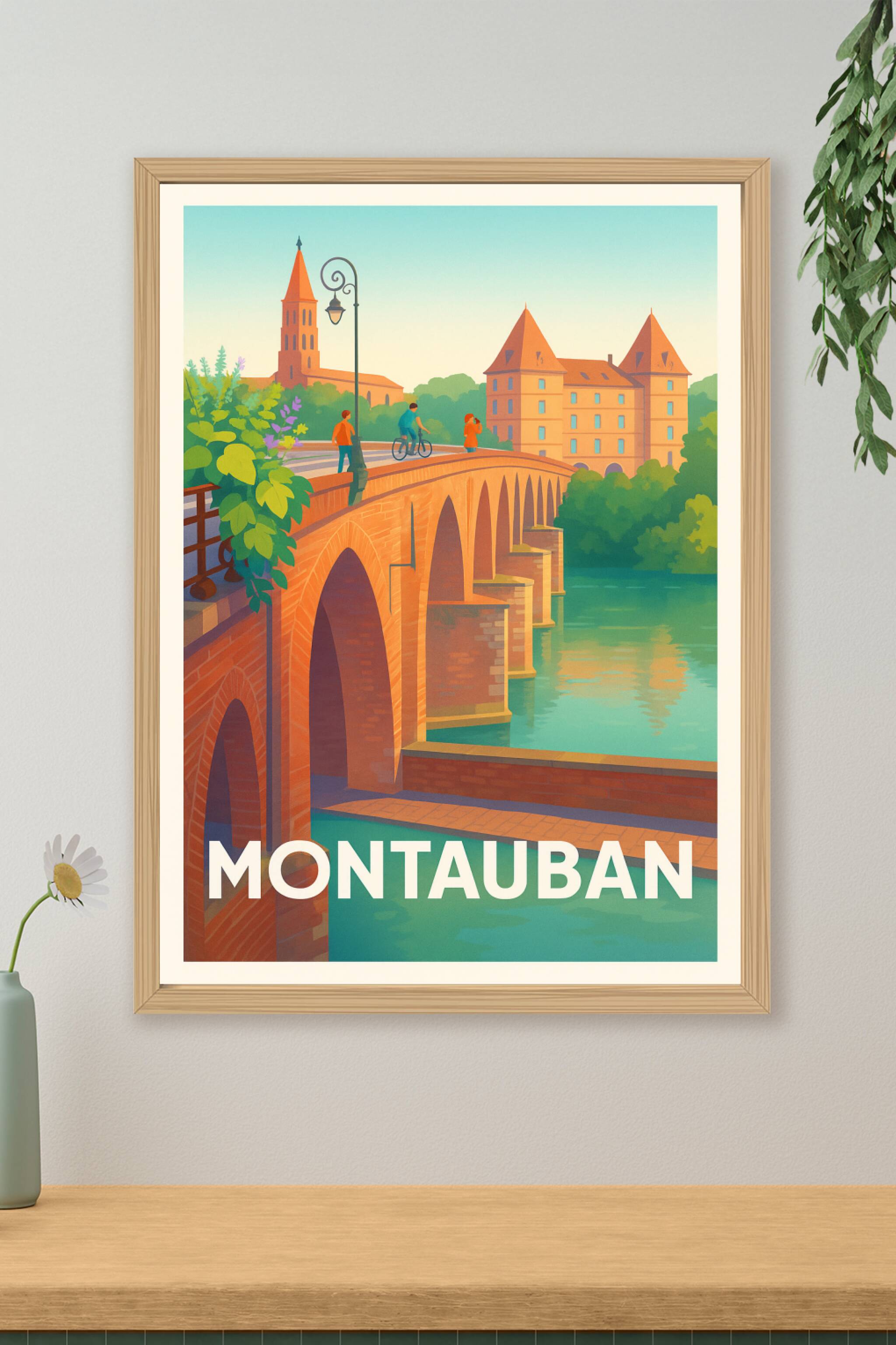 Découvrez Montauban à travers cette affiche illustrée qui met en lumière le célèbre pont-vieux et le patrimoine architectural unique de la ville. C...