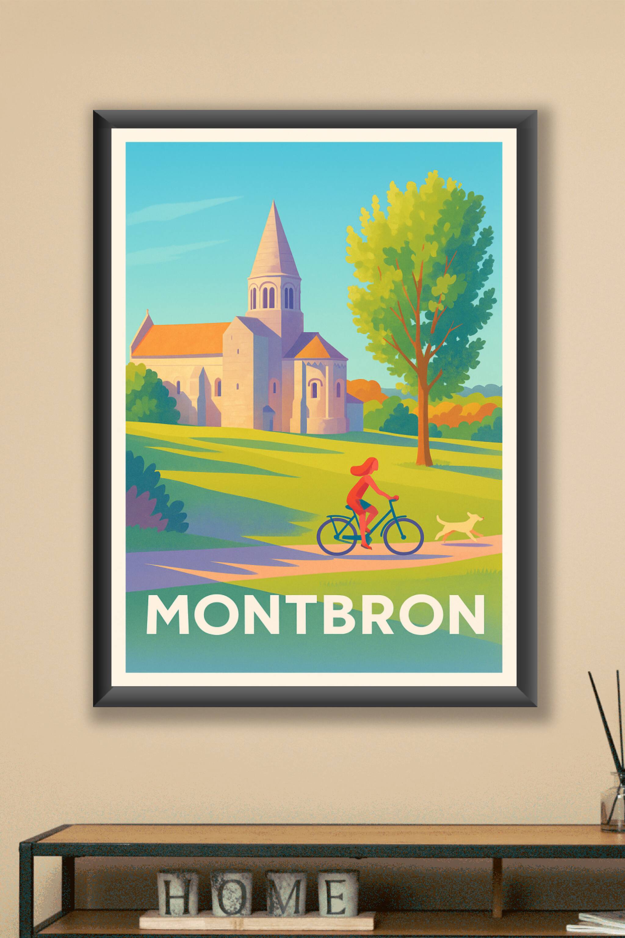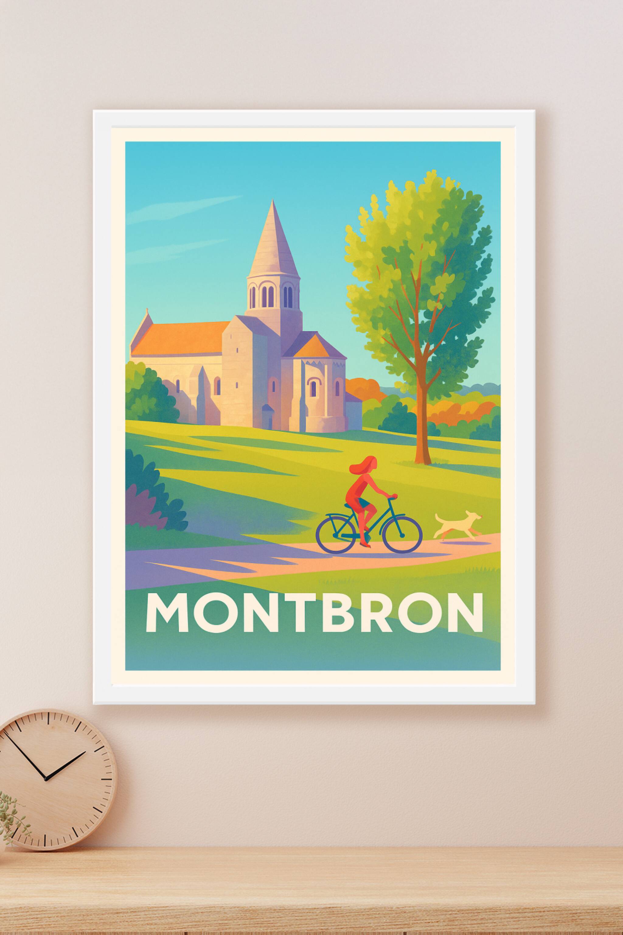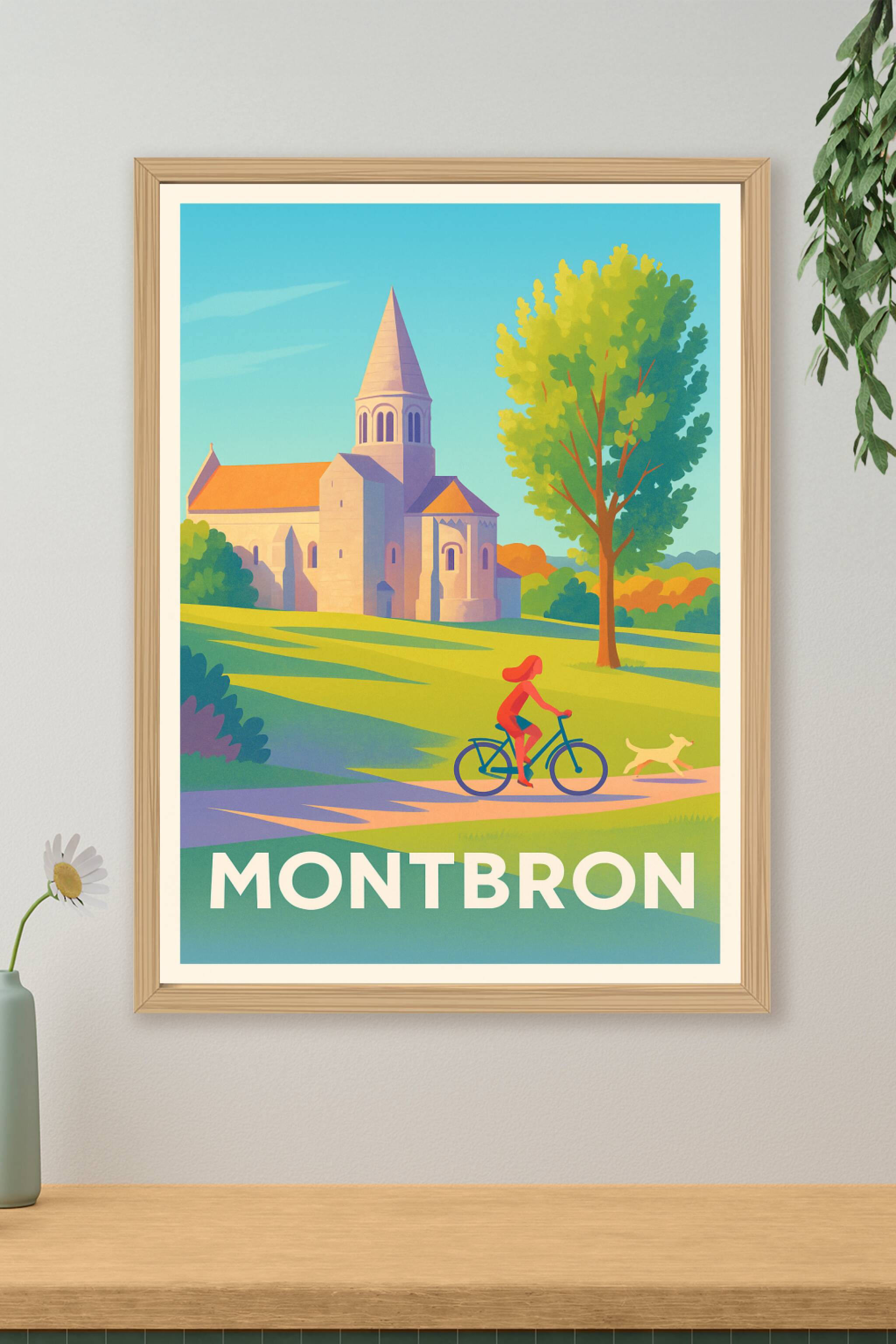 Découvrez la sérénité de Montbron avec cette affiche illustrée mettant en scène un paysage bucolique et son église emblématique sous un ciel azur. Le poster capture l'essence de la vie paisible à vélo au cœur d’un environnement verdoyant, idéal pour apporter une ambiance apaisante à votre intérieur. Imprimée en tirage "Fine Art" sur papier 305g coton, cette affiche garantit une qualité d'impression exceptionnelle et des couleurs lumineuses. Disponible du format A1 à A4, avec ou sans cadre, ce produit premium fabriqué en France s'adapte parfaitement à tous les styles de décoration, que ce soit pour embellir votre maison ou offrir un cadeau original à un amoureux des paysages français.