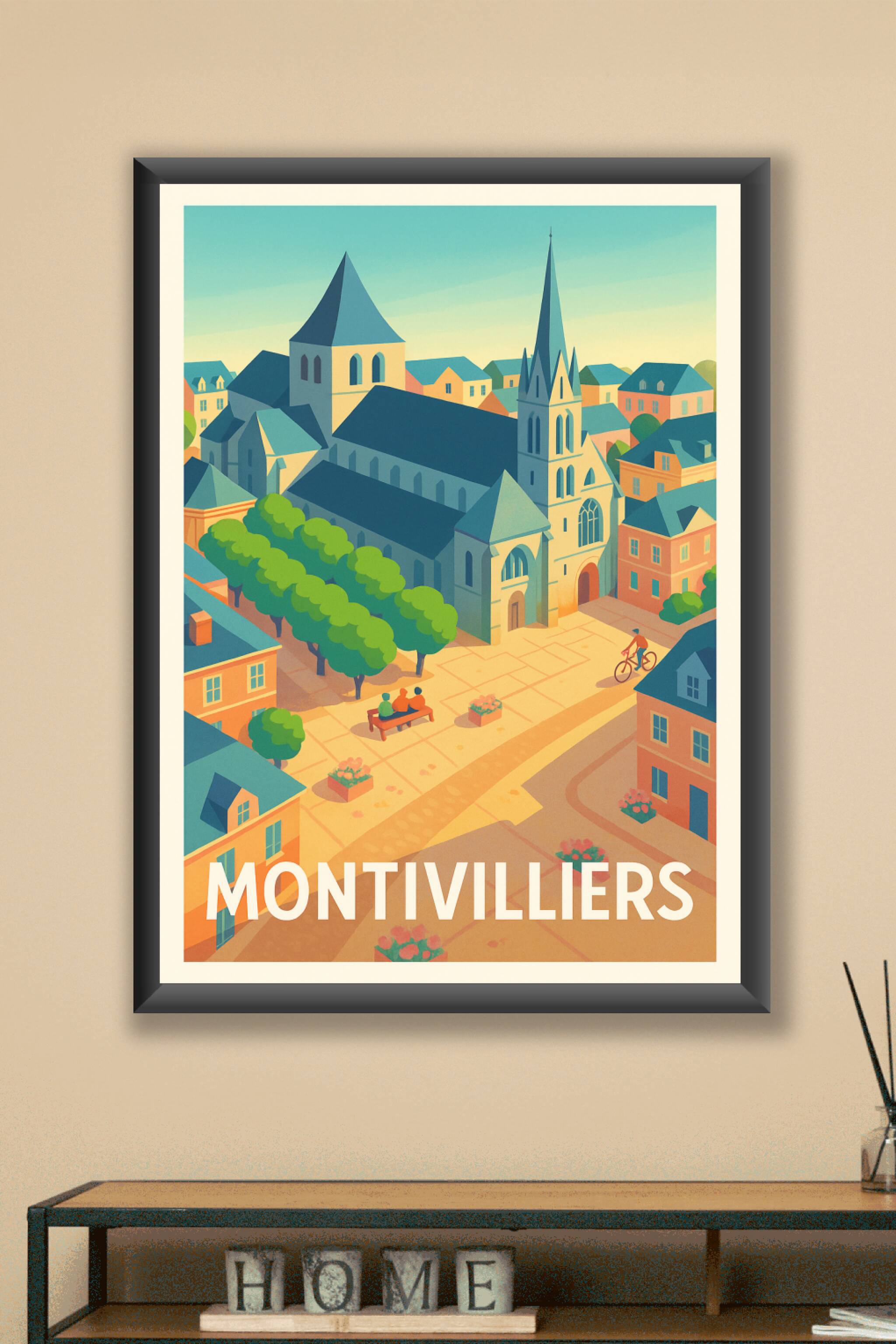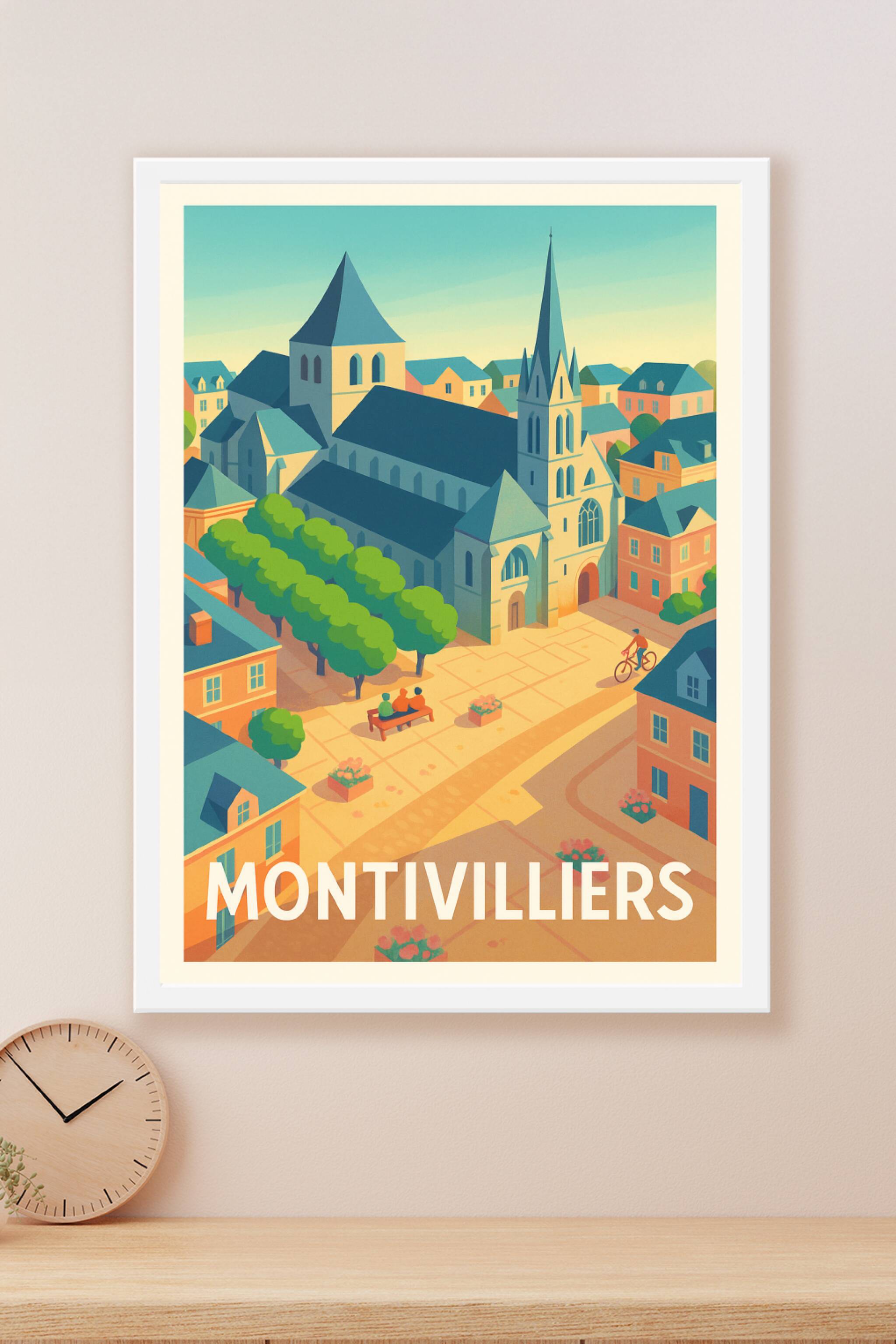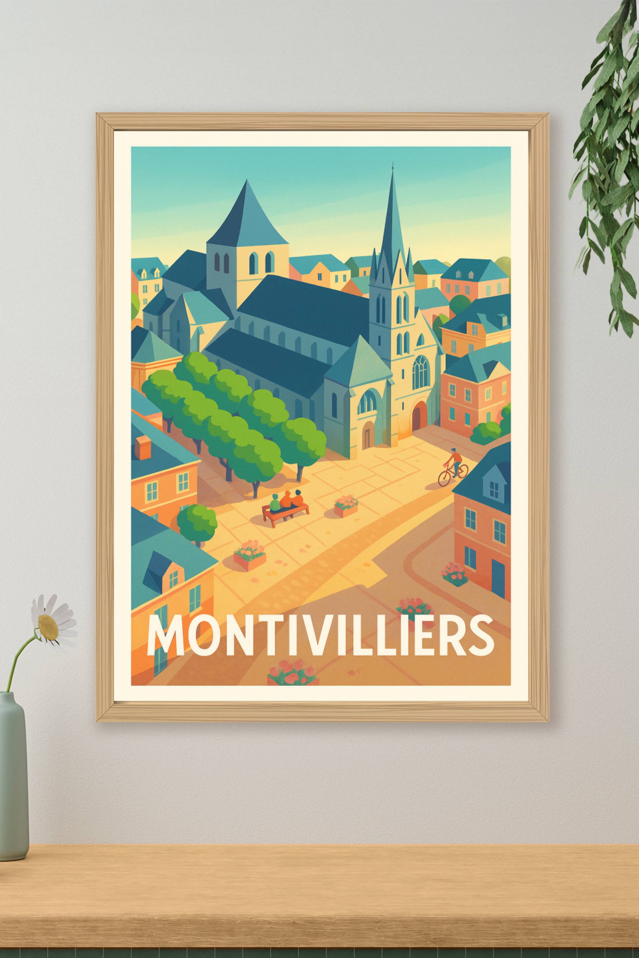 Découvrez l'élégance paisible de Montivilliers à travers cette affiche illustrée aux couleurs douces et lumineuses, évoquant l'atmosphère chaleureu...