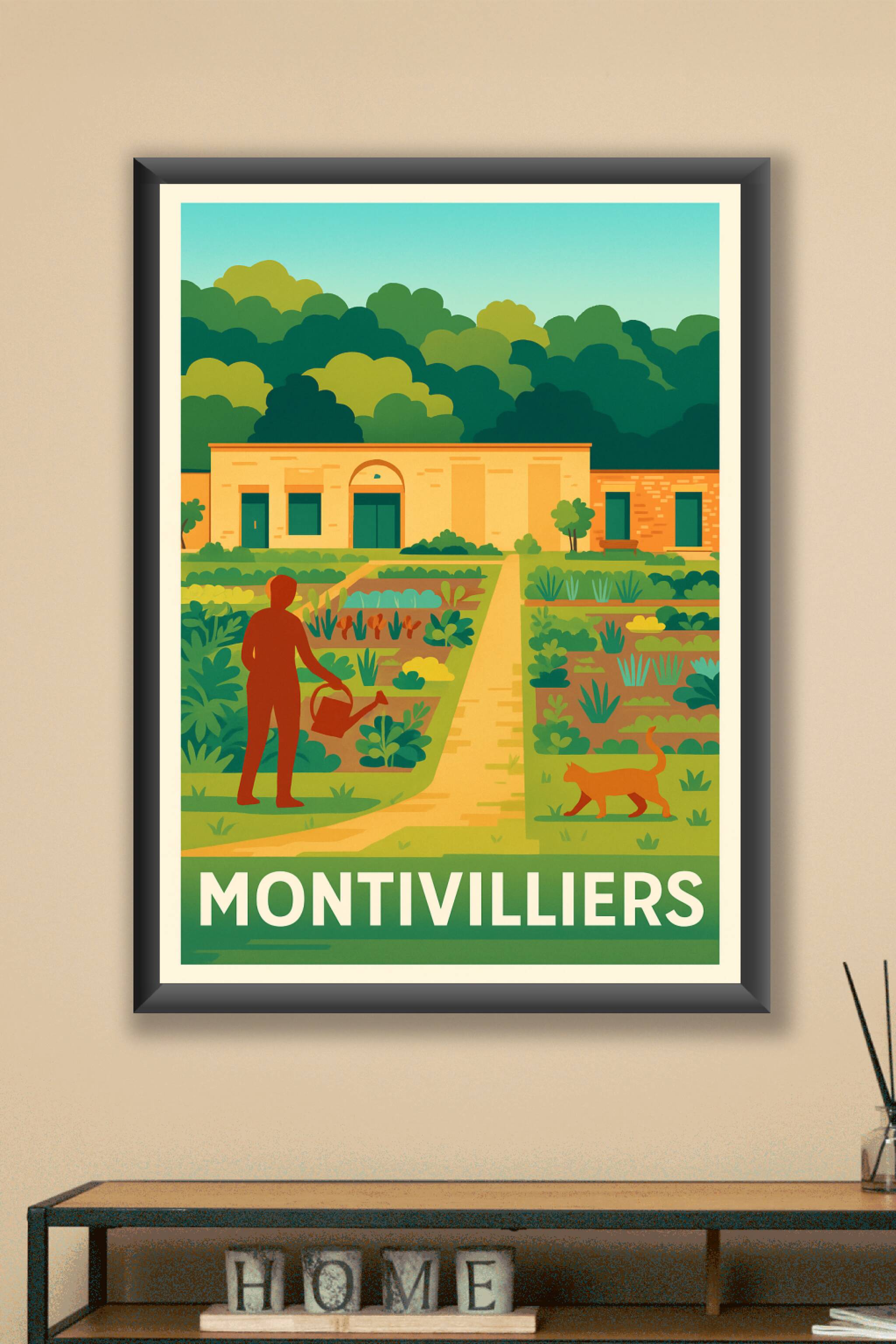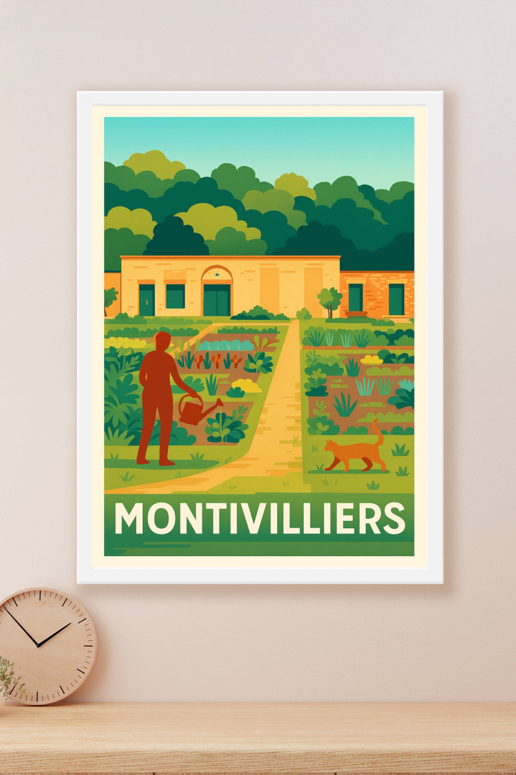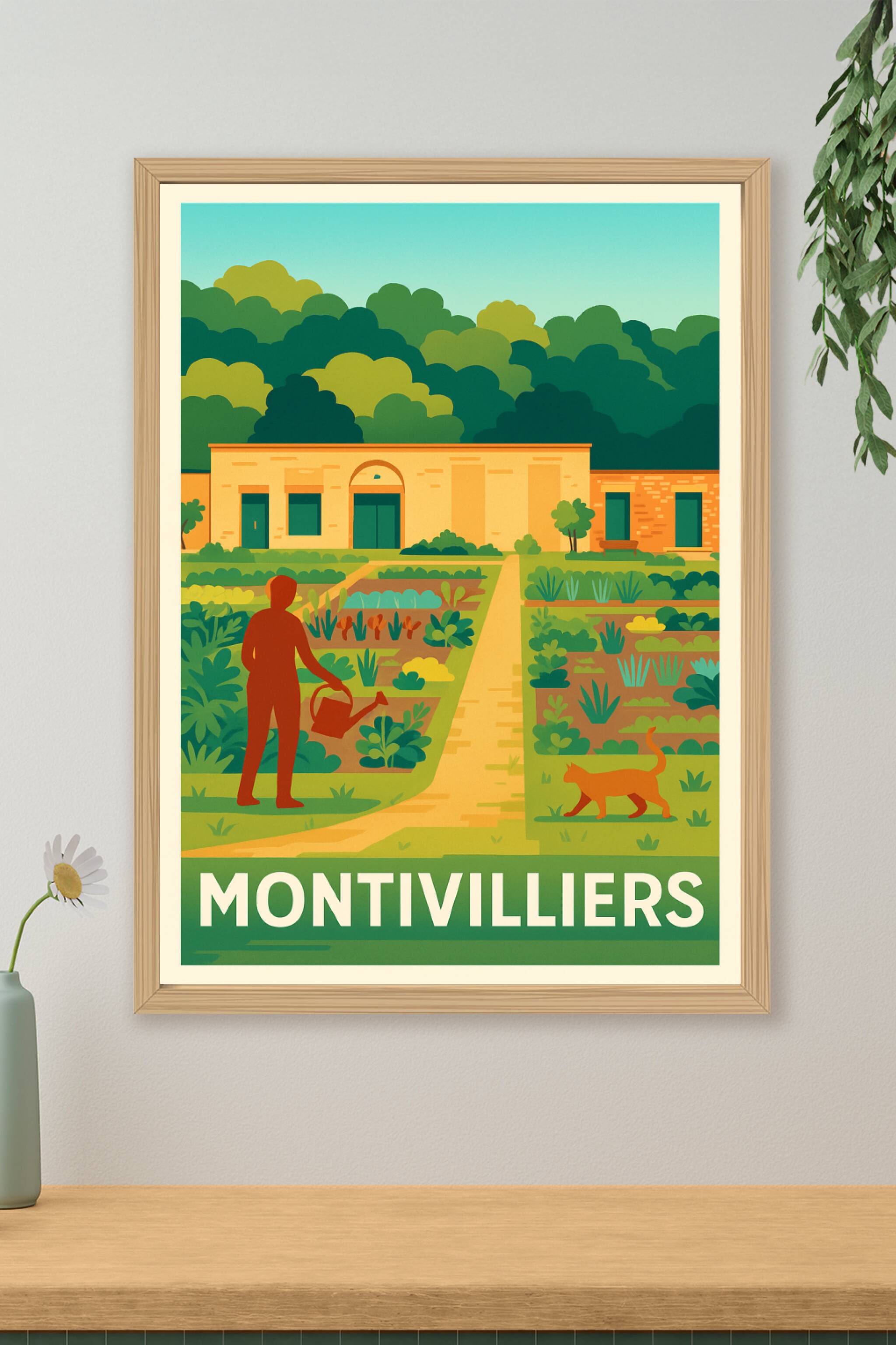 Découvrez la quiétude de Montivilliers à travers cette affiche illustrée aux couleurs douces et harmonieuses. Le poster met en scène un jardin verd...