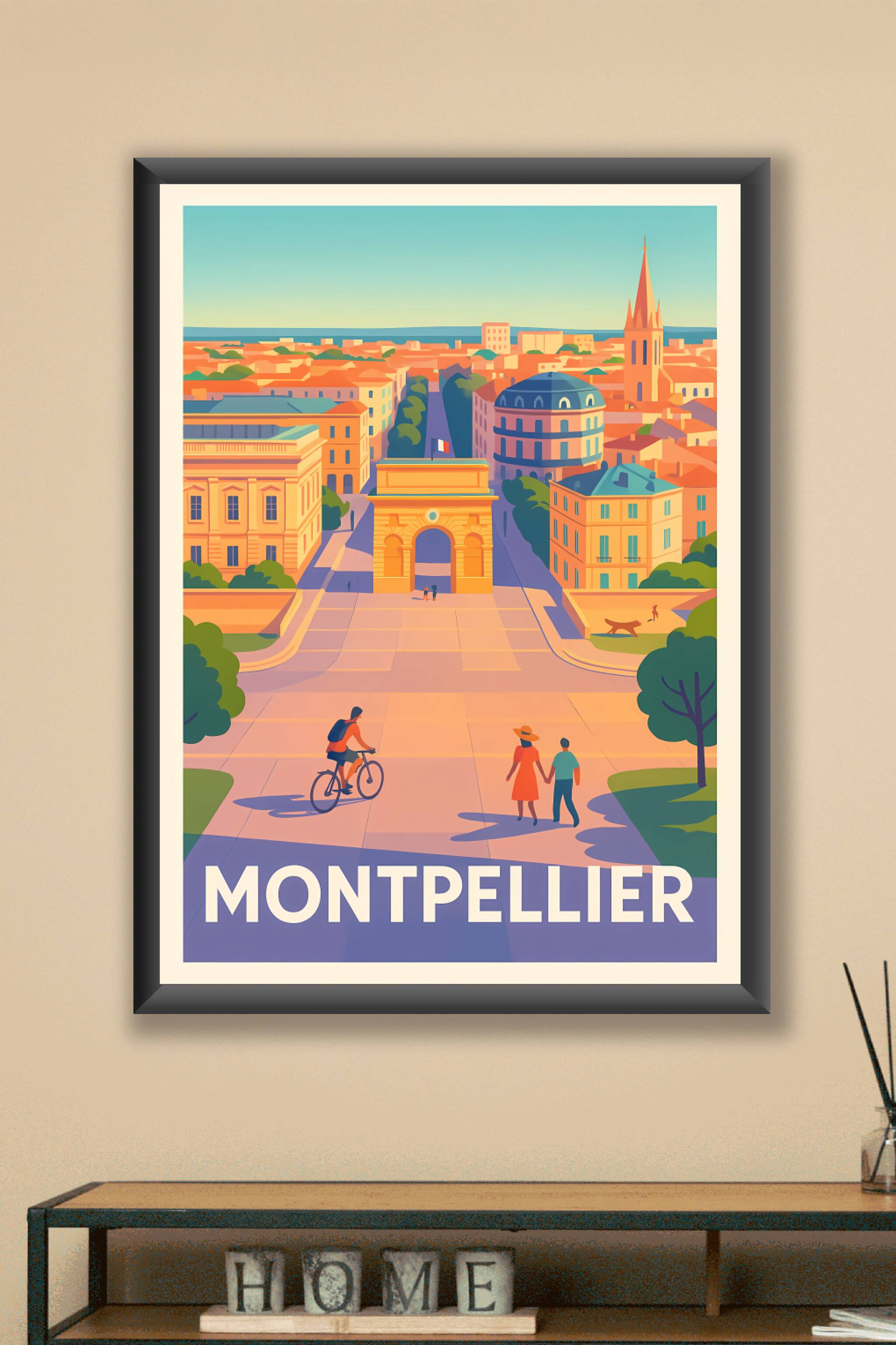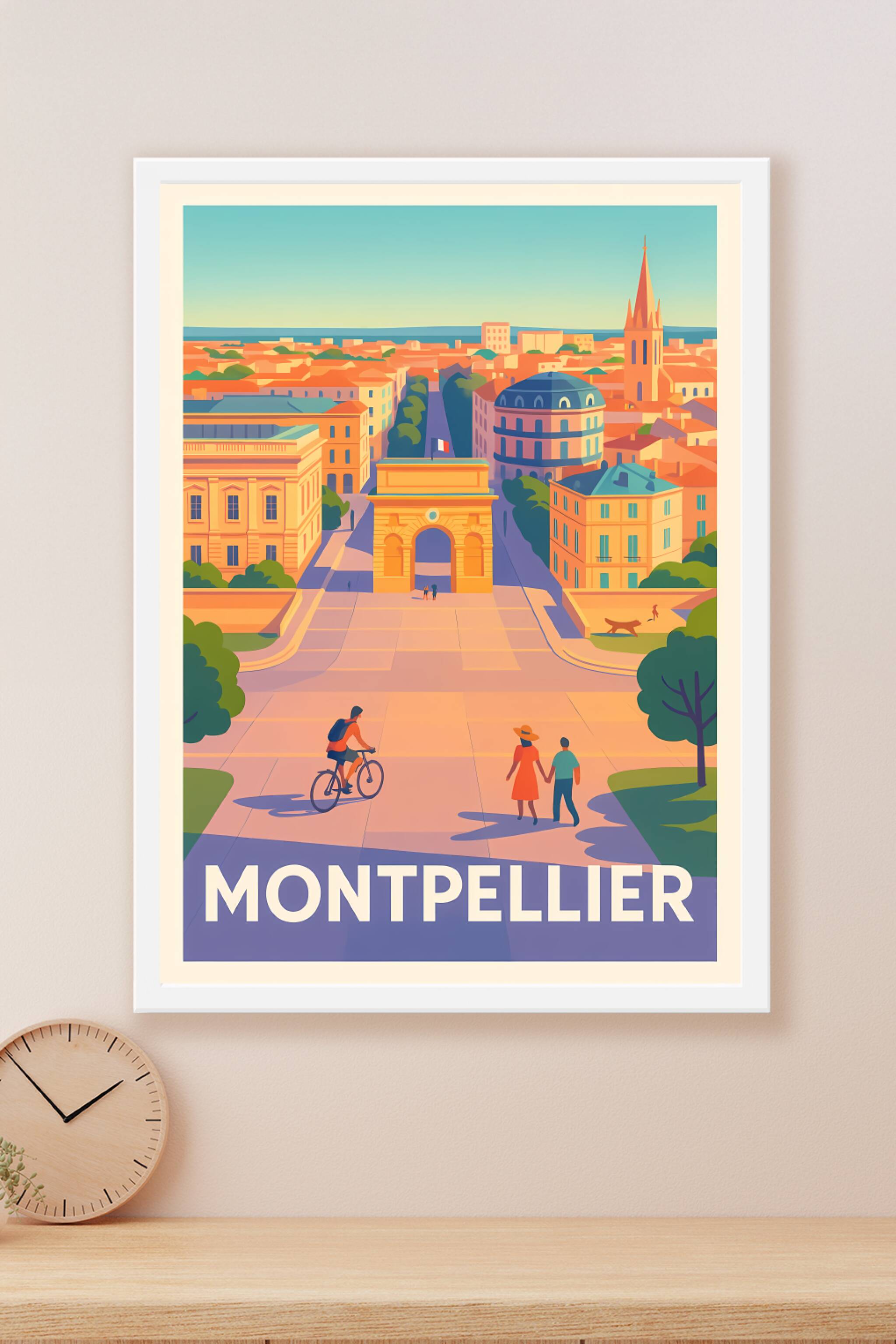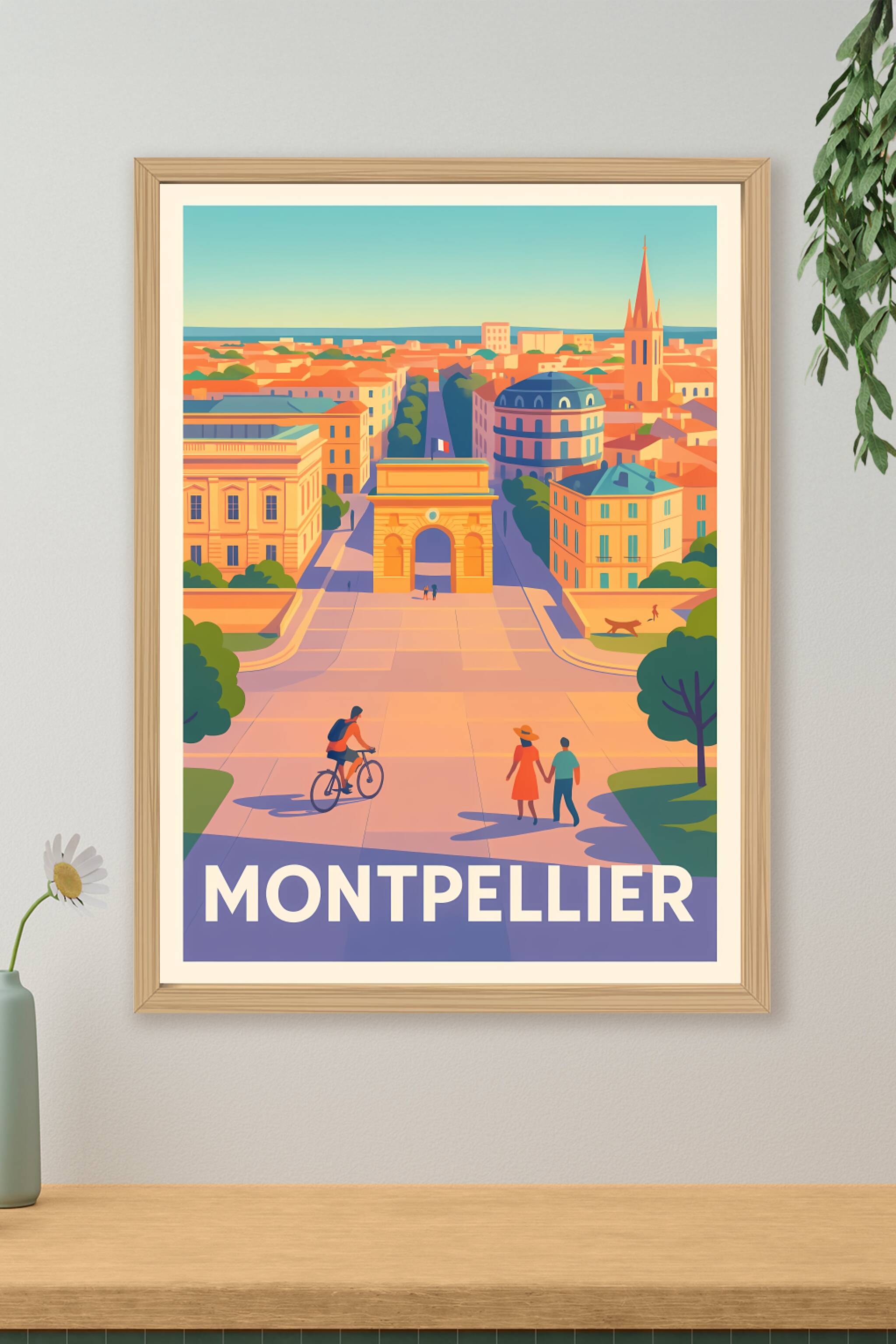 Découvrez le charme typique du sud de la France avec cette affiche illustrée de Montpellier, mettant en scène l'Arc de Triomphe et les toits dorés ...