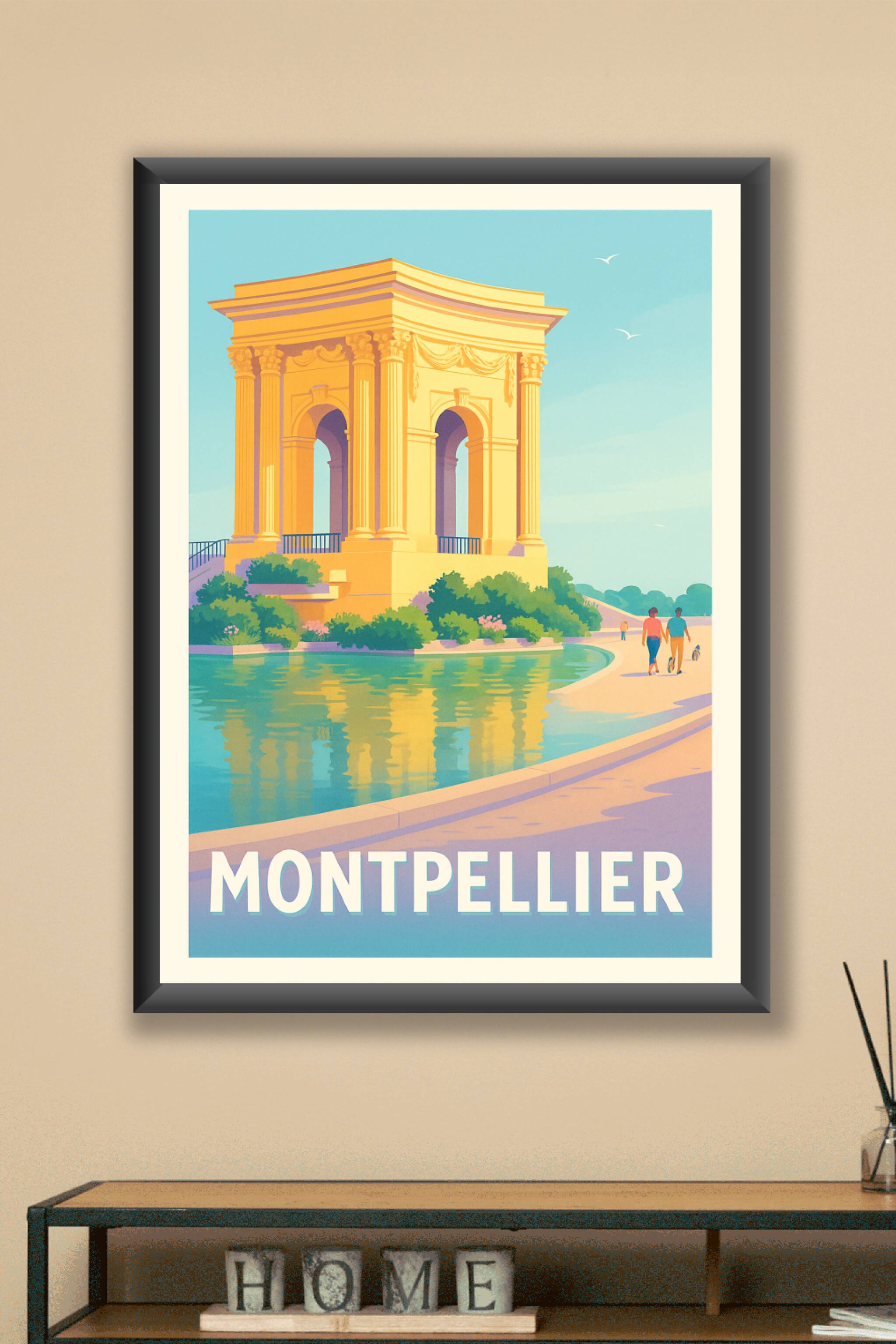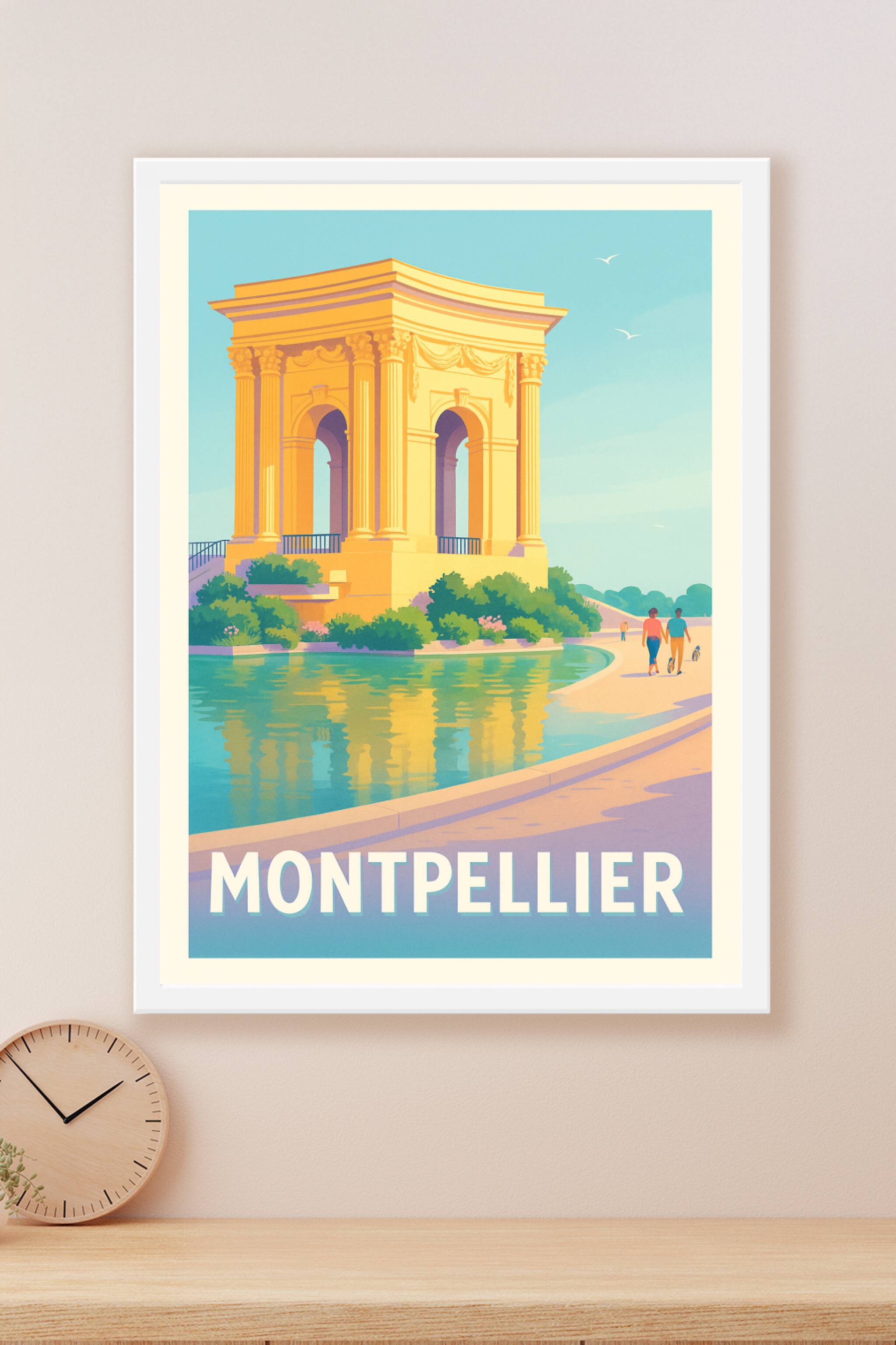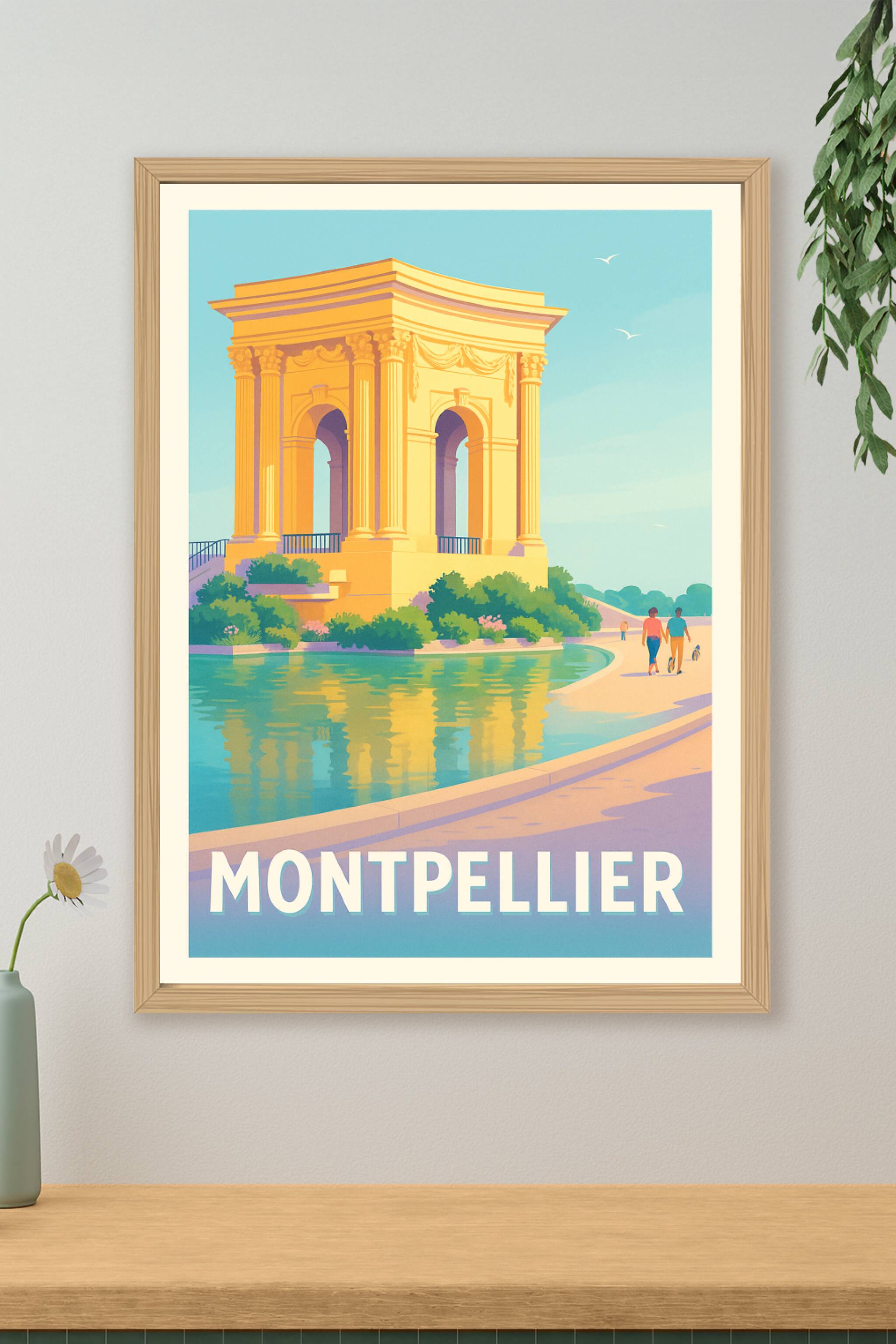 Laissez-vous séduire par cette affiche illustrée de Montpellier, mettant en lumière l’élégant Château d’eau du Peyrou, baigné de soleil et bordé pa...