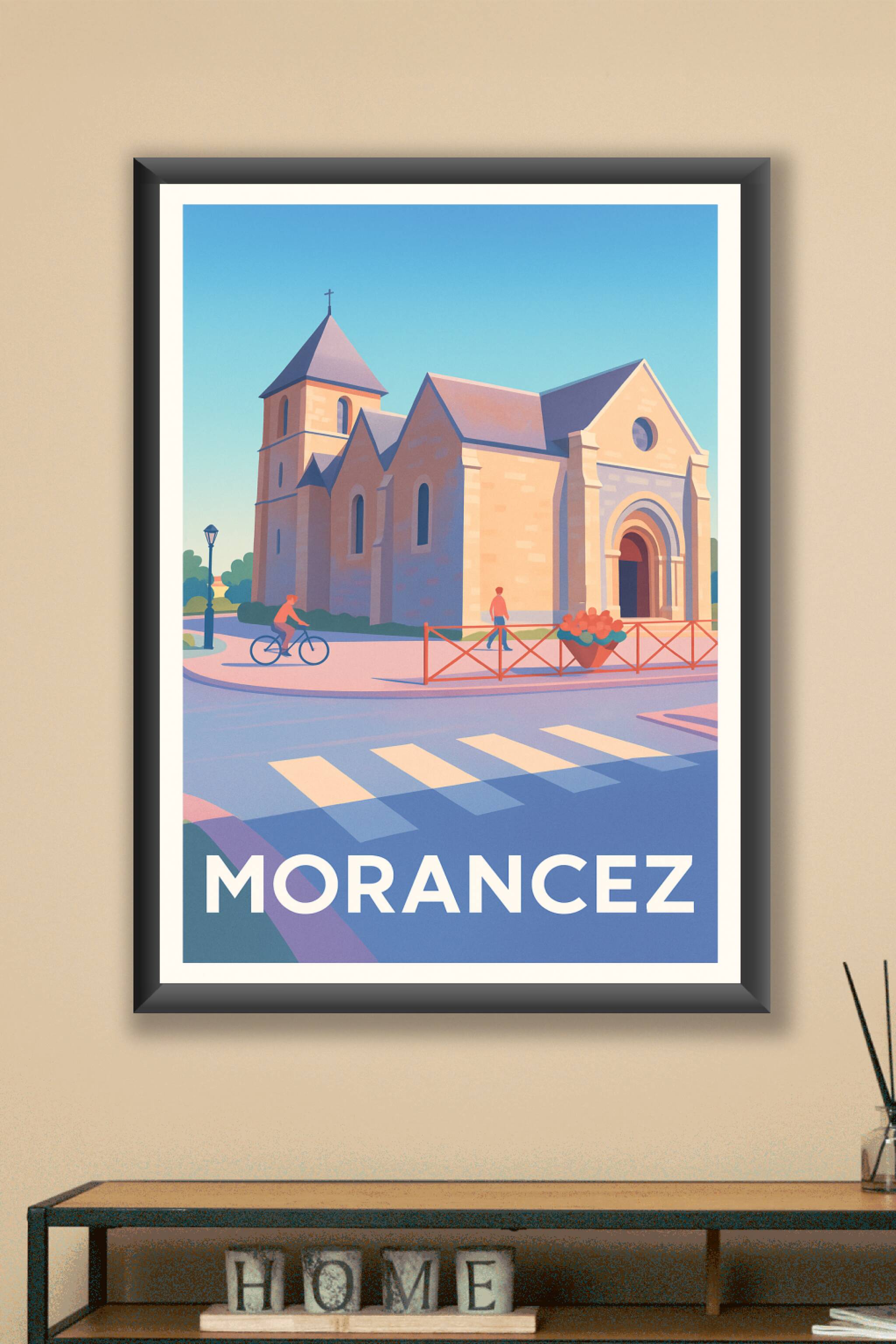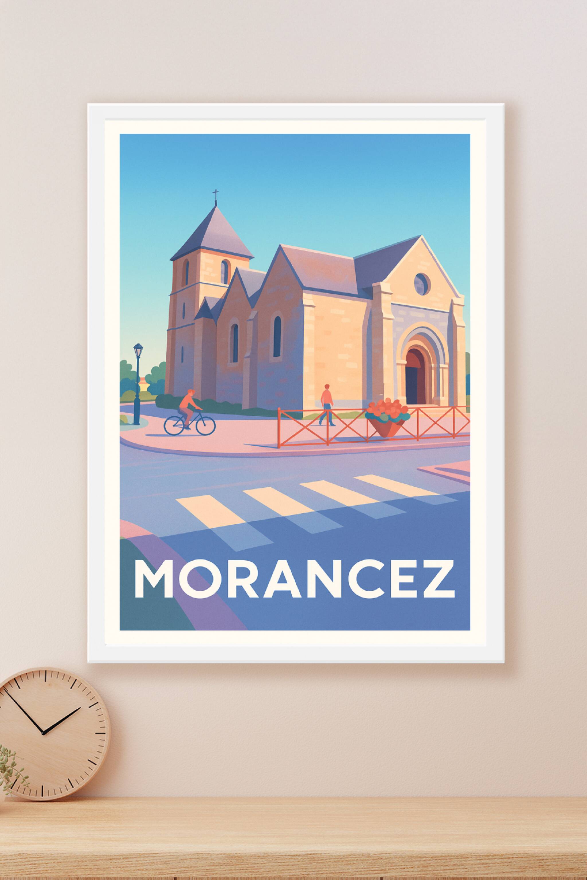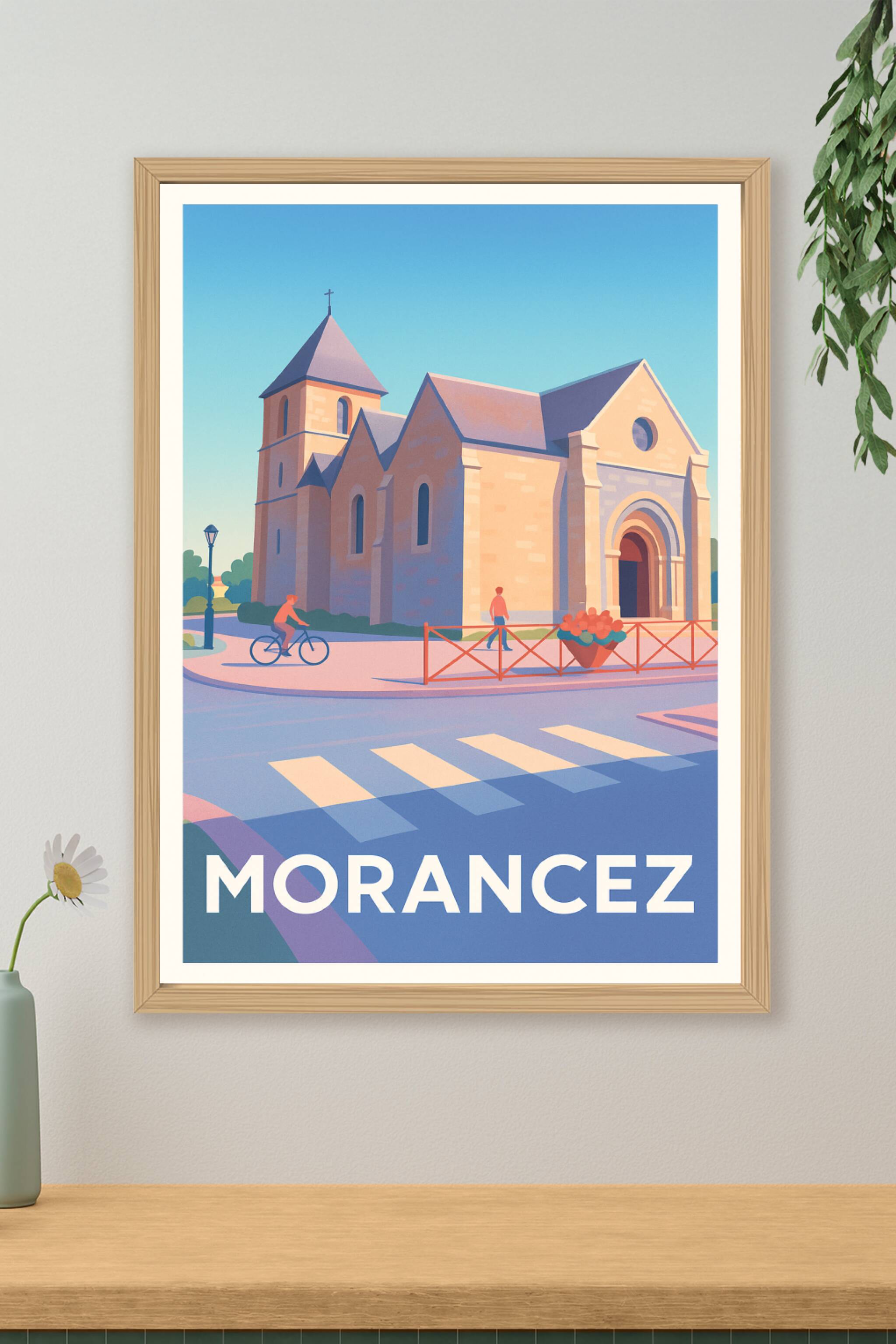 Découvrez le charme paisible de Morancez à travers cette affiche illustrée qui met en valeur l'architecture typique et l'atmosphère sereine de ce v...