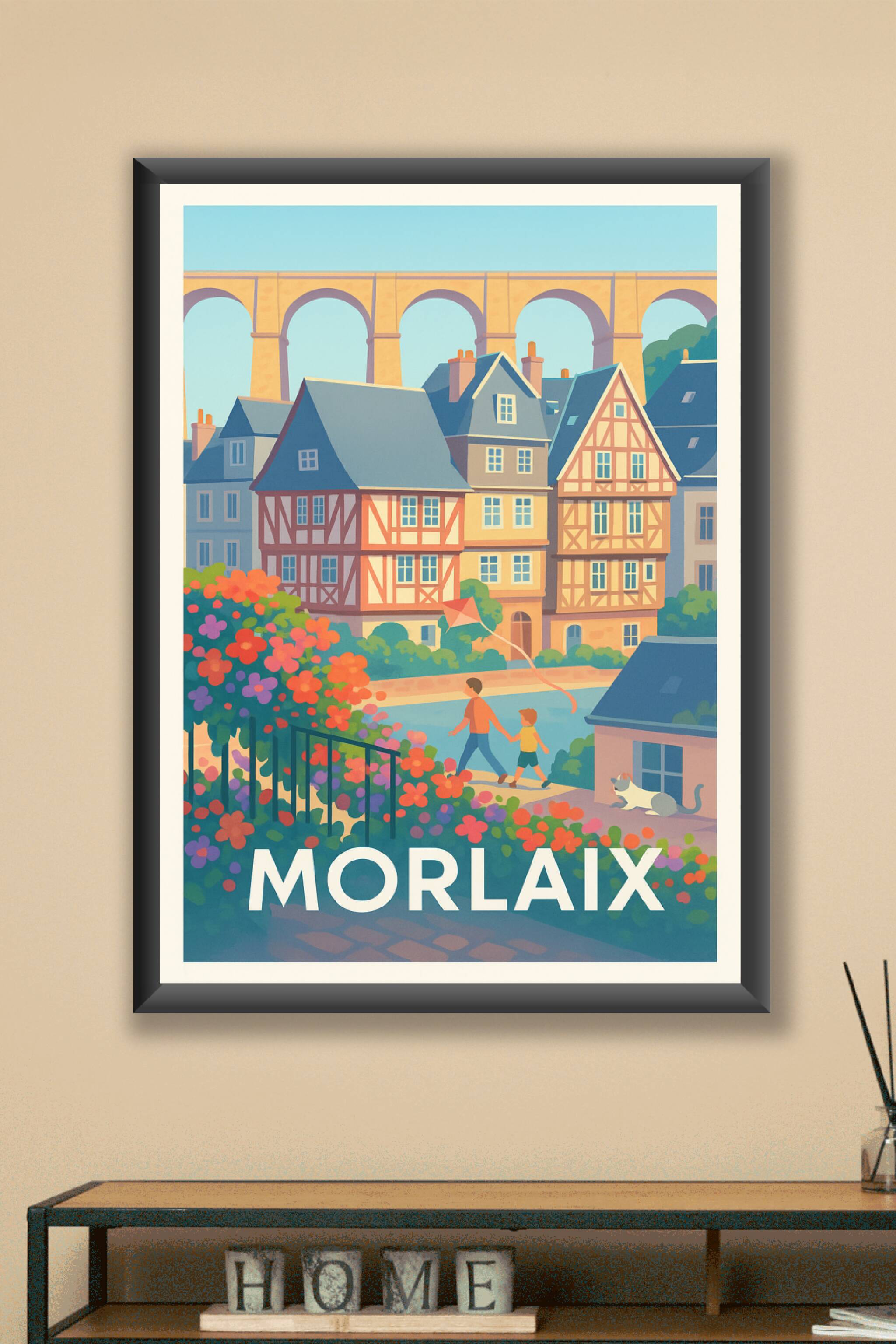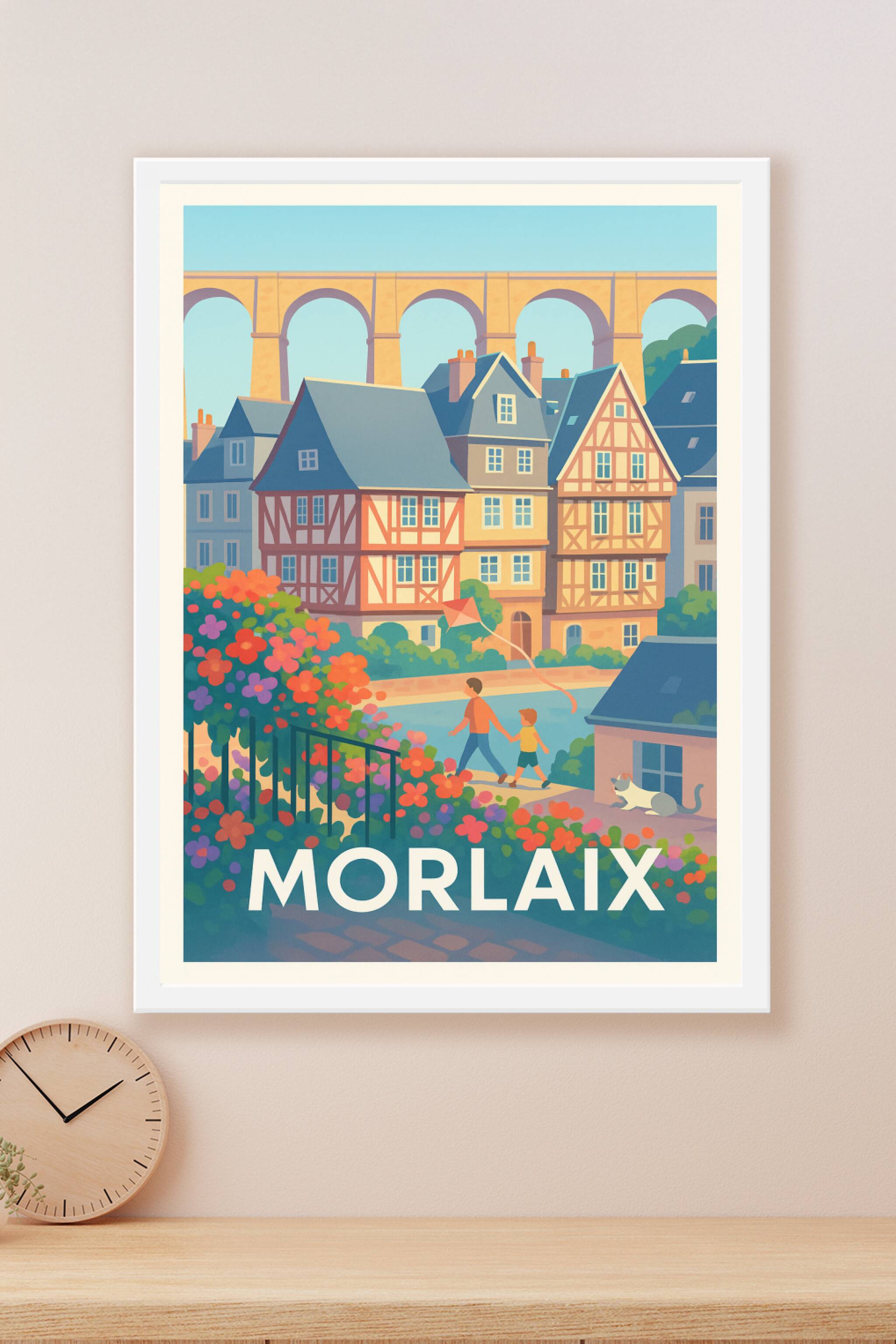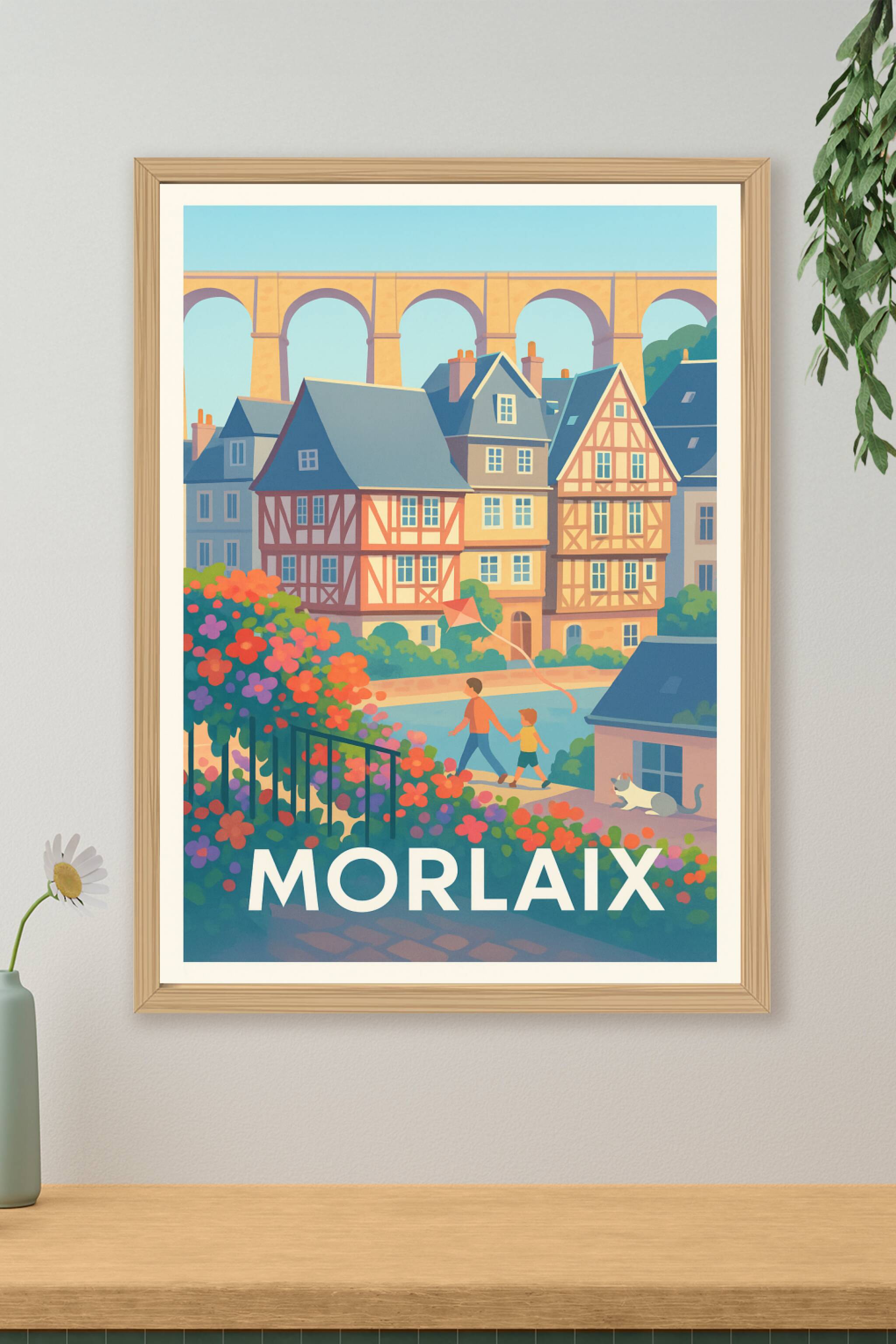 Découvrez le charme intemporel de Morlaix à travers cette affiche colorée représentant ses maisons à colombages emblématiques et son célèbre viaduc...