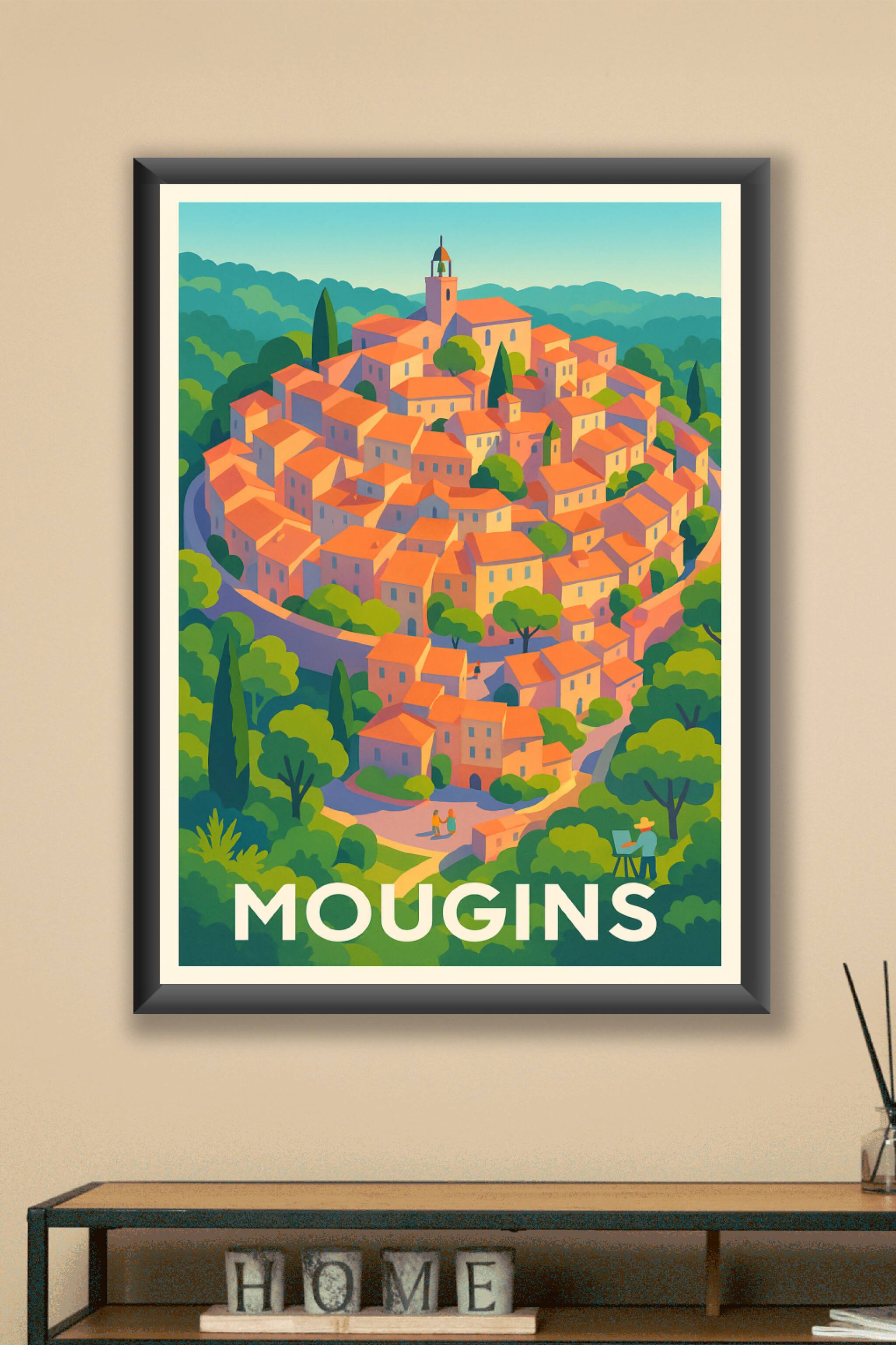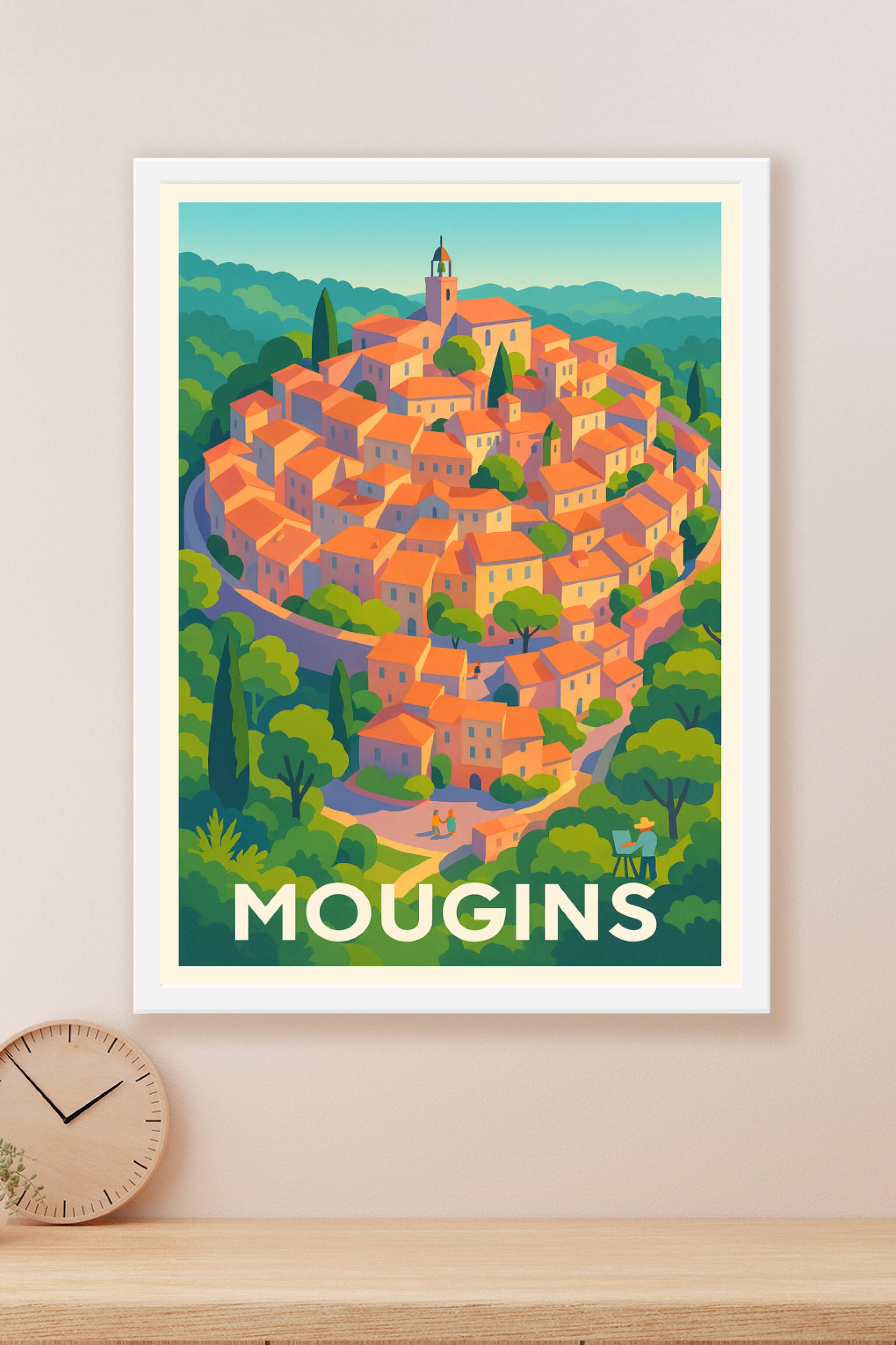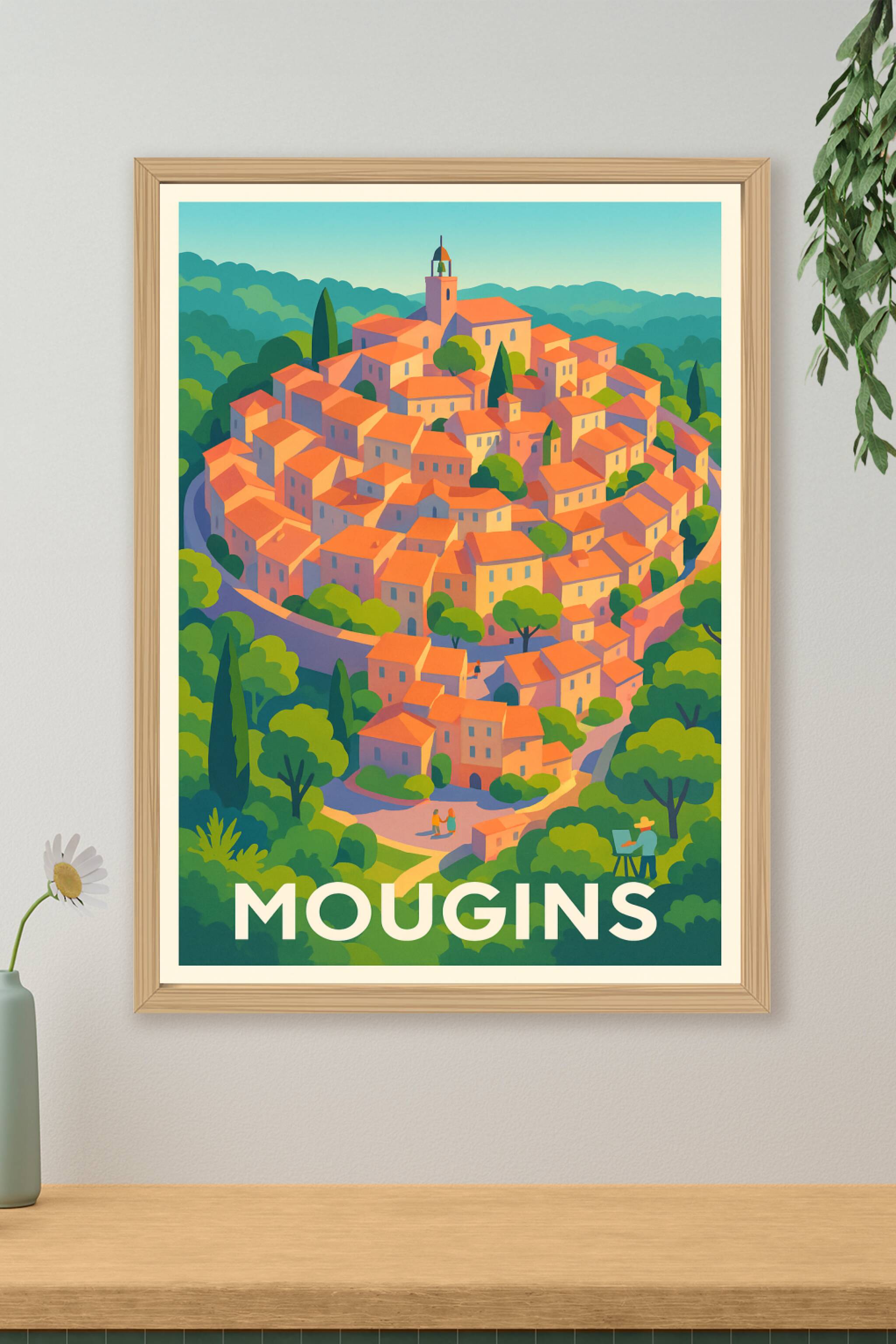 Découvrez l'authenticité du village de Mougins à travers cette affiche illustrée au style vibrant et chaleureux. Ce poster magnifie les ruelles typ...