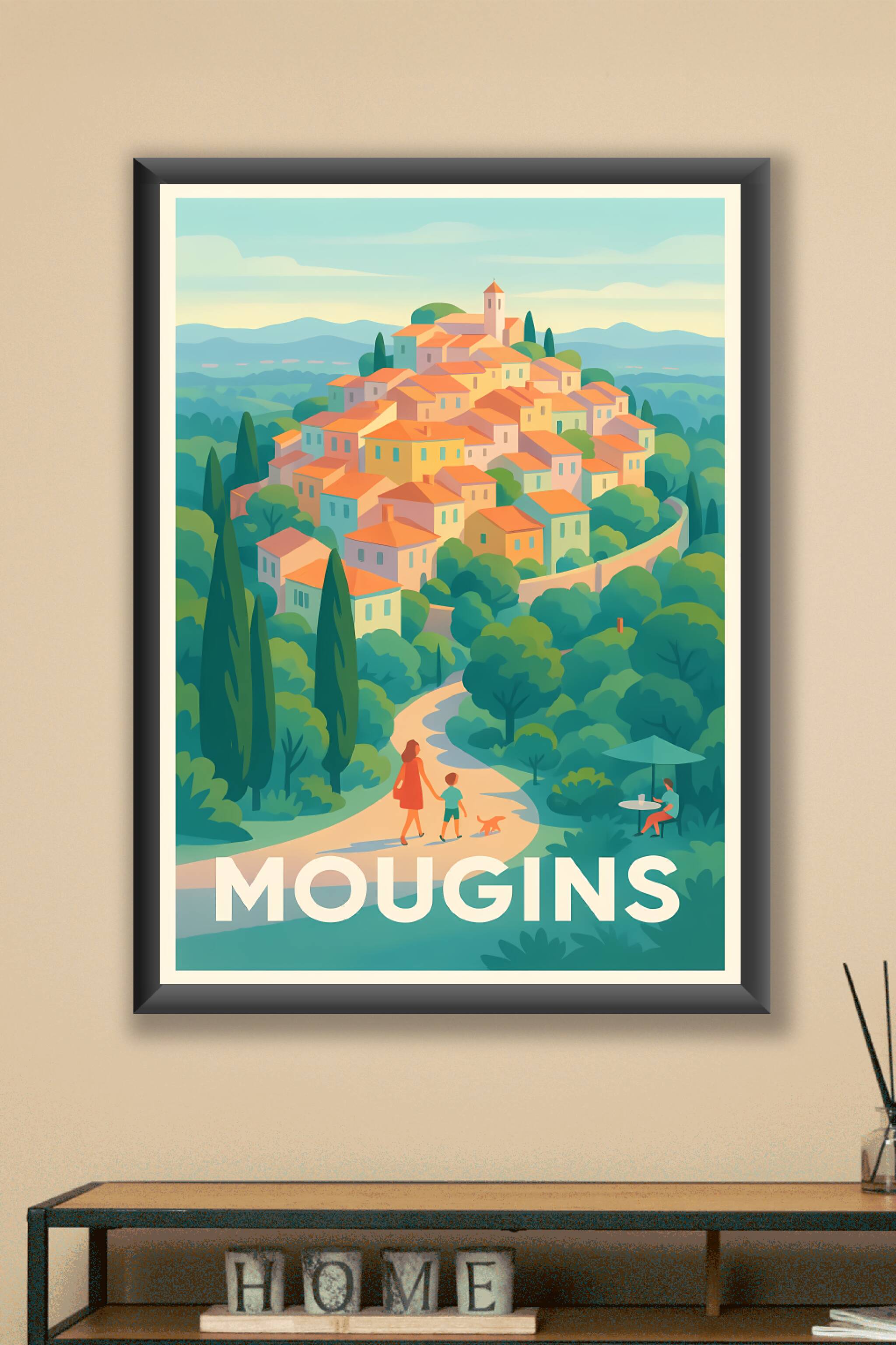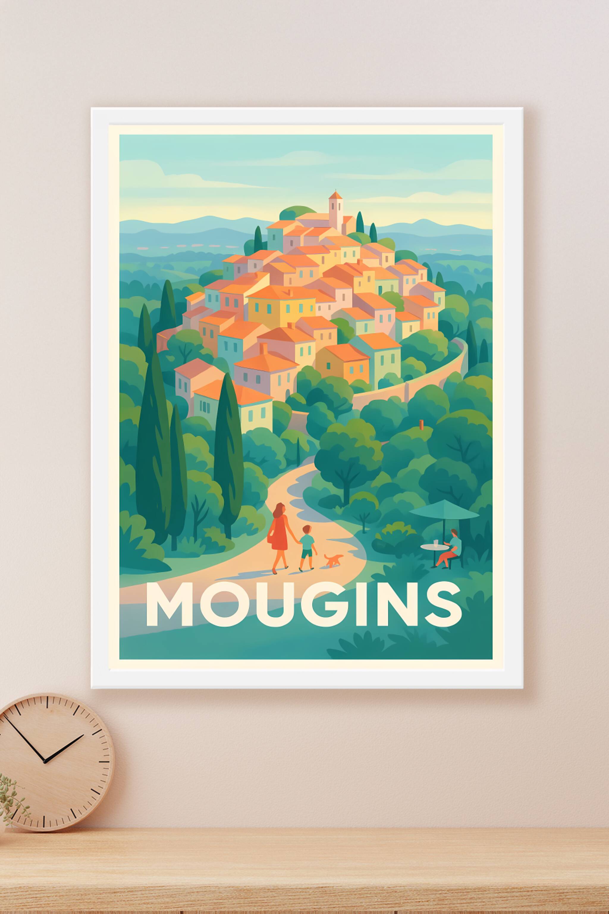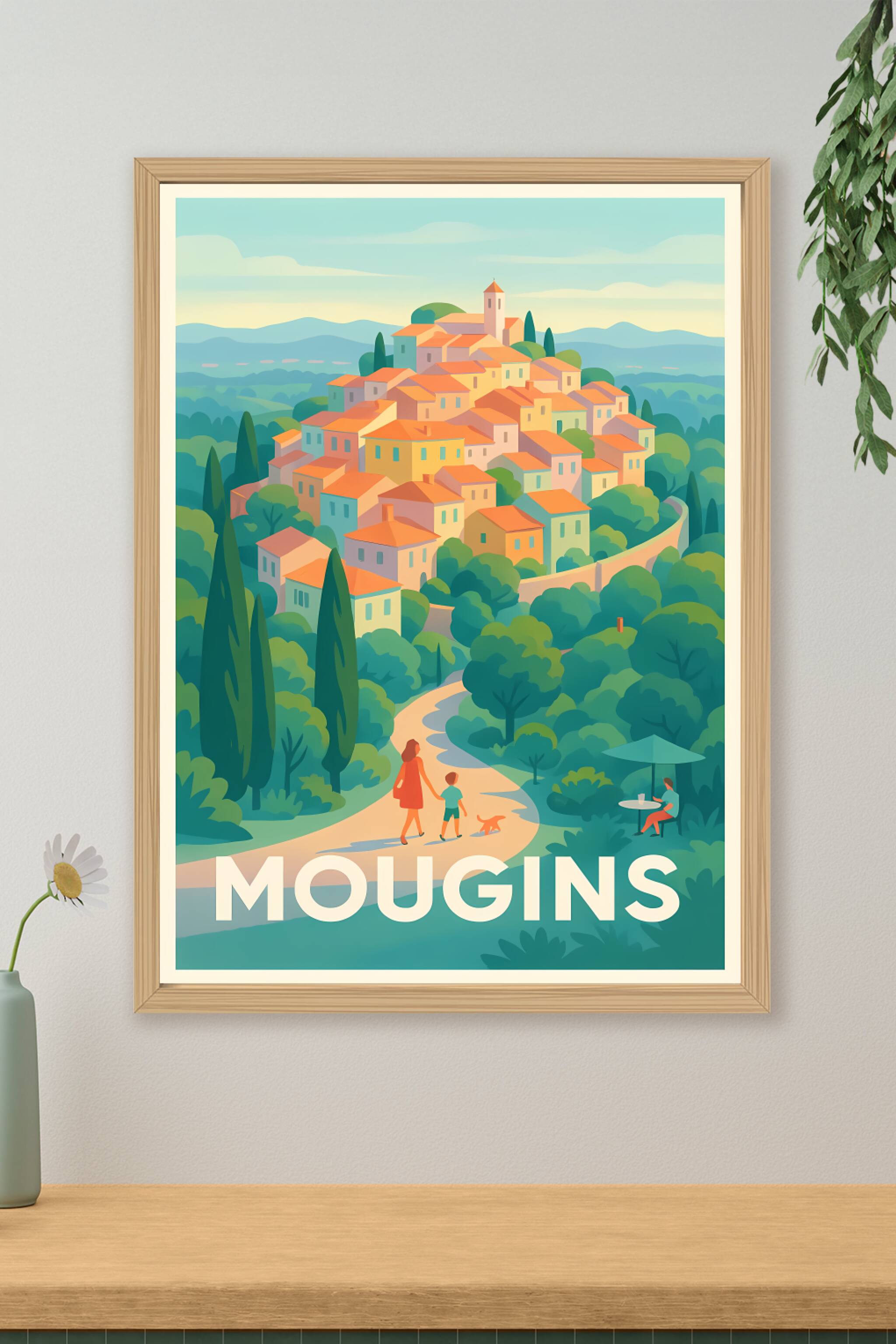 Découvrez le charme intemporel de Mougins avec cette affiche illustrée, qui met en scène un village pittoresque perché au milieu des collines verdo...