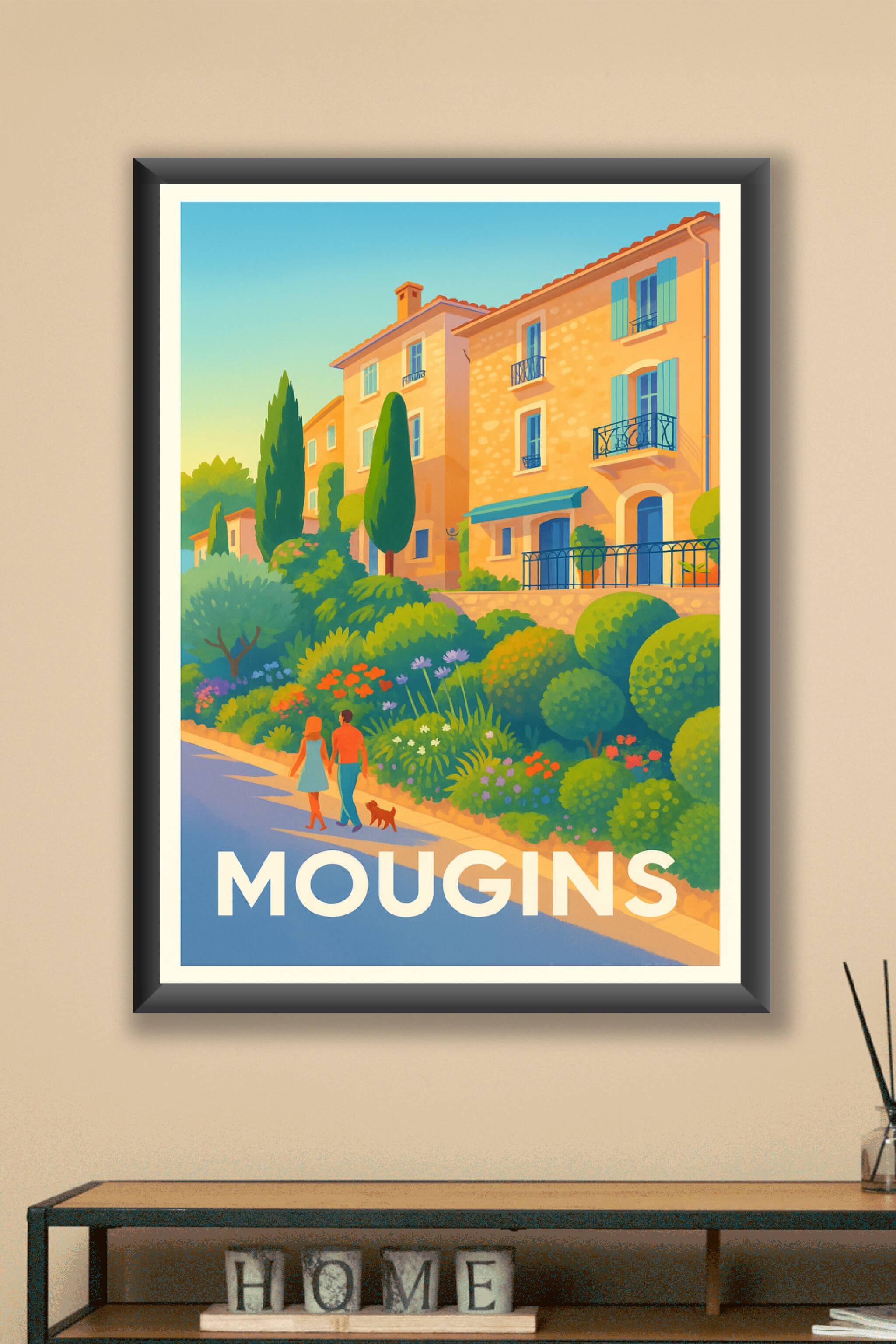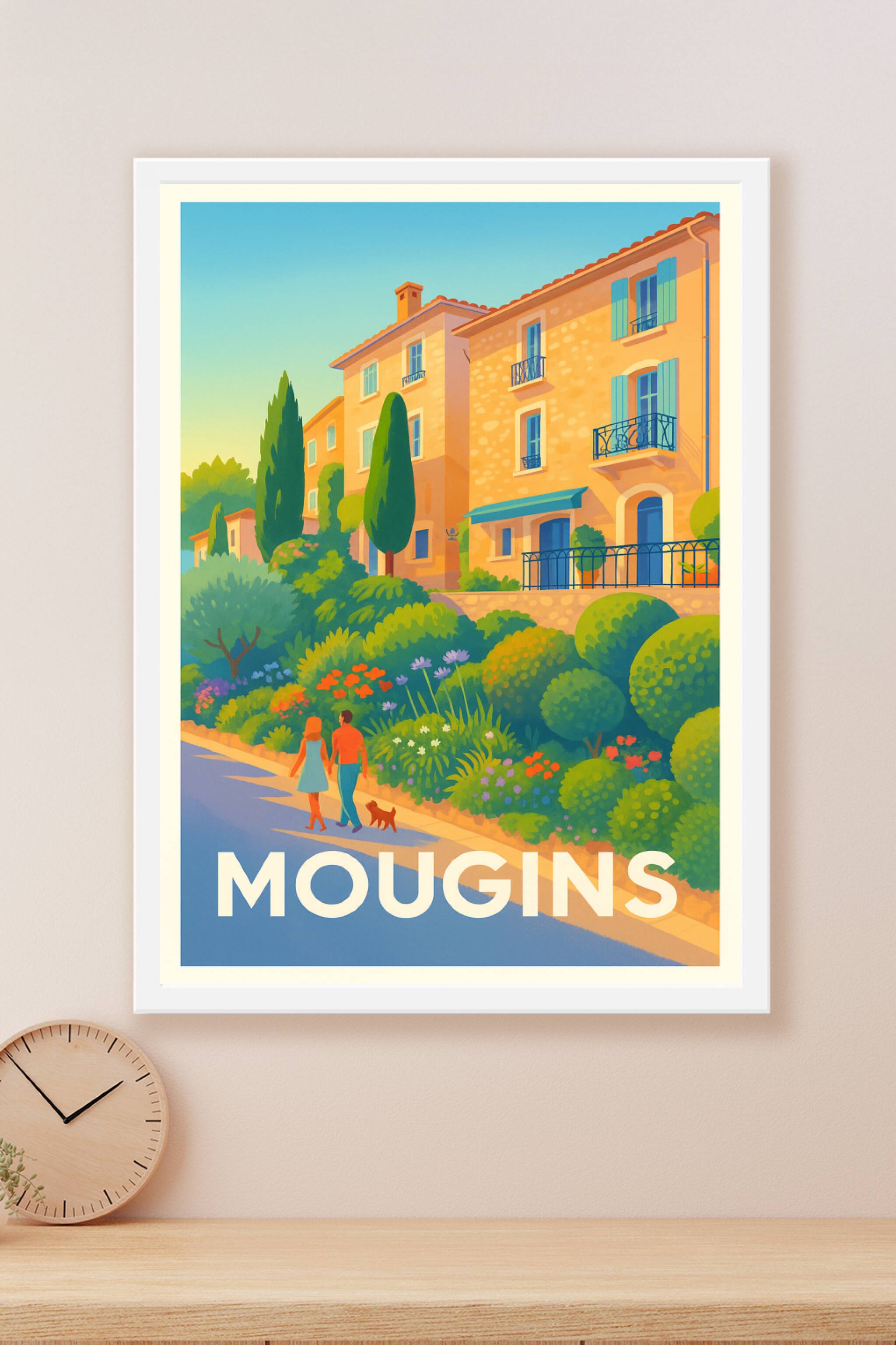 Découvrez l'élégance et la douceur de vivre de Mougins avec cette affiche lumineuse illustrant une promenade paisible entre maisons provençales et ...