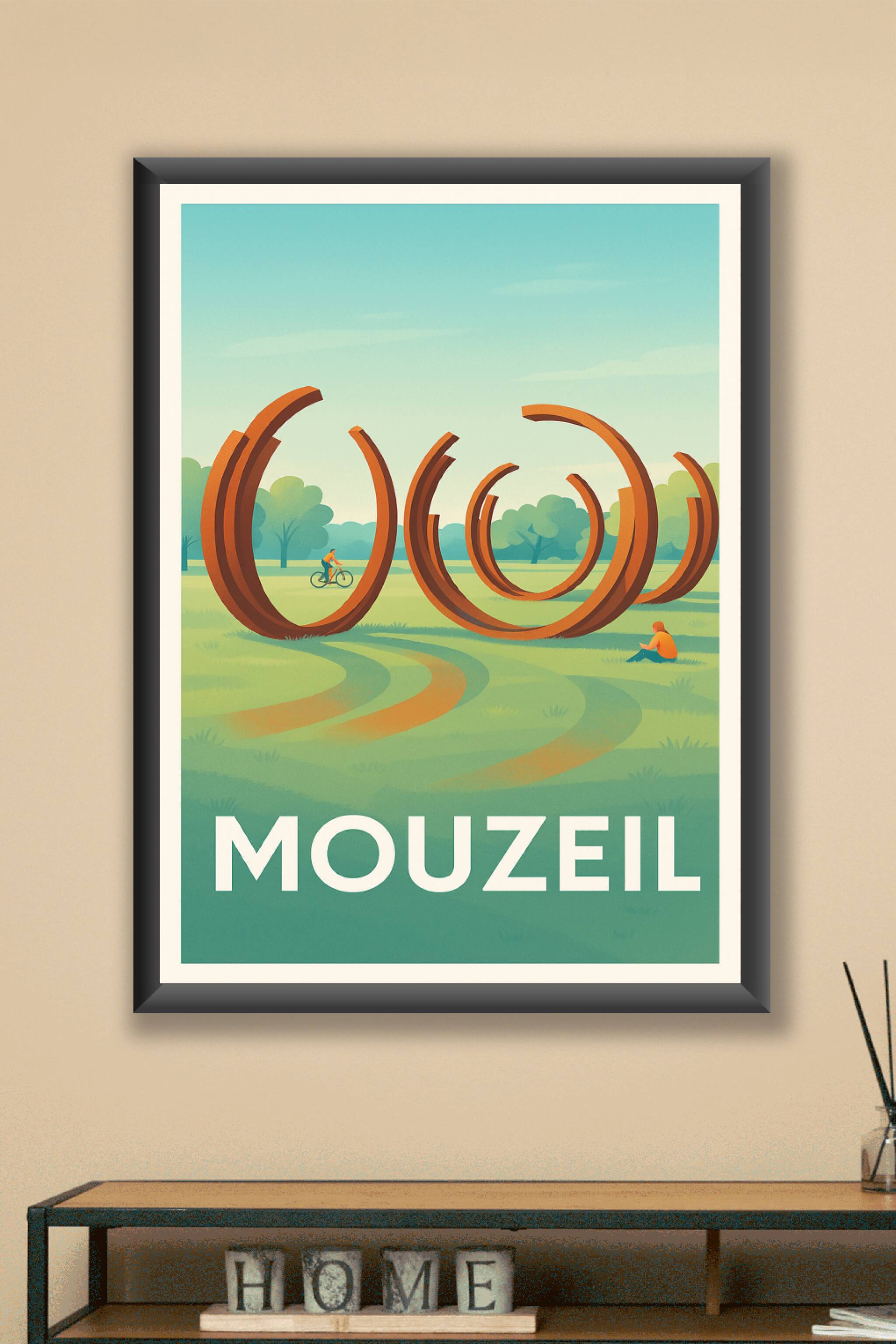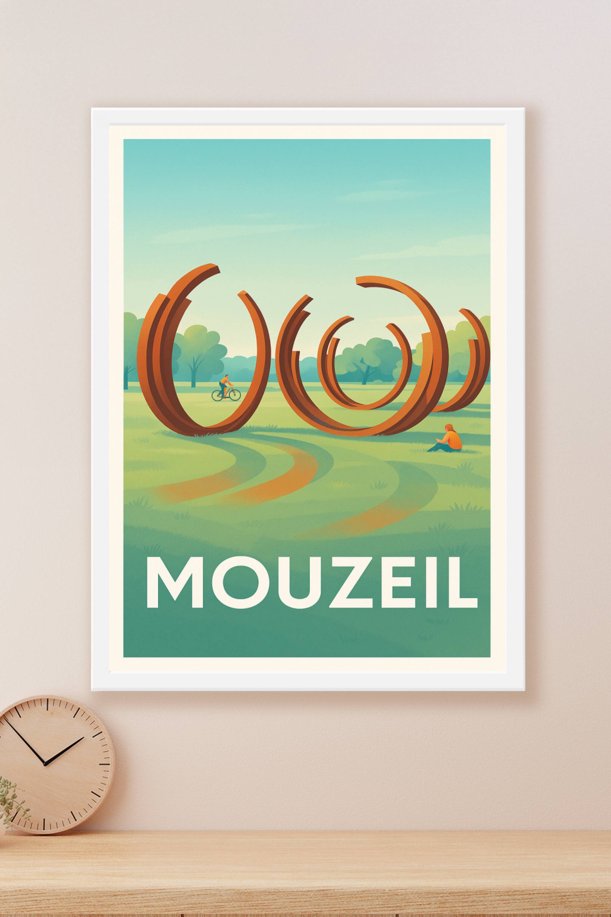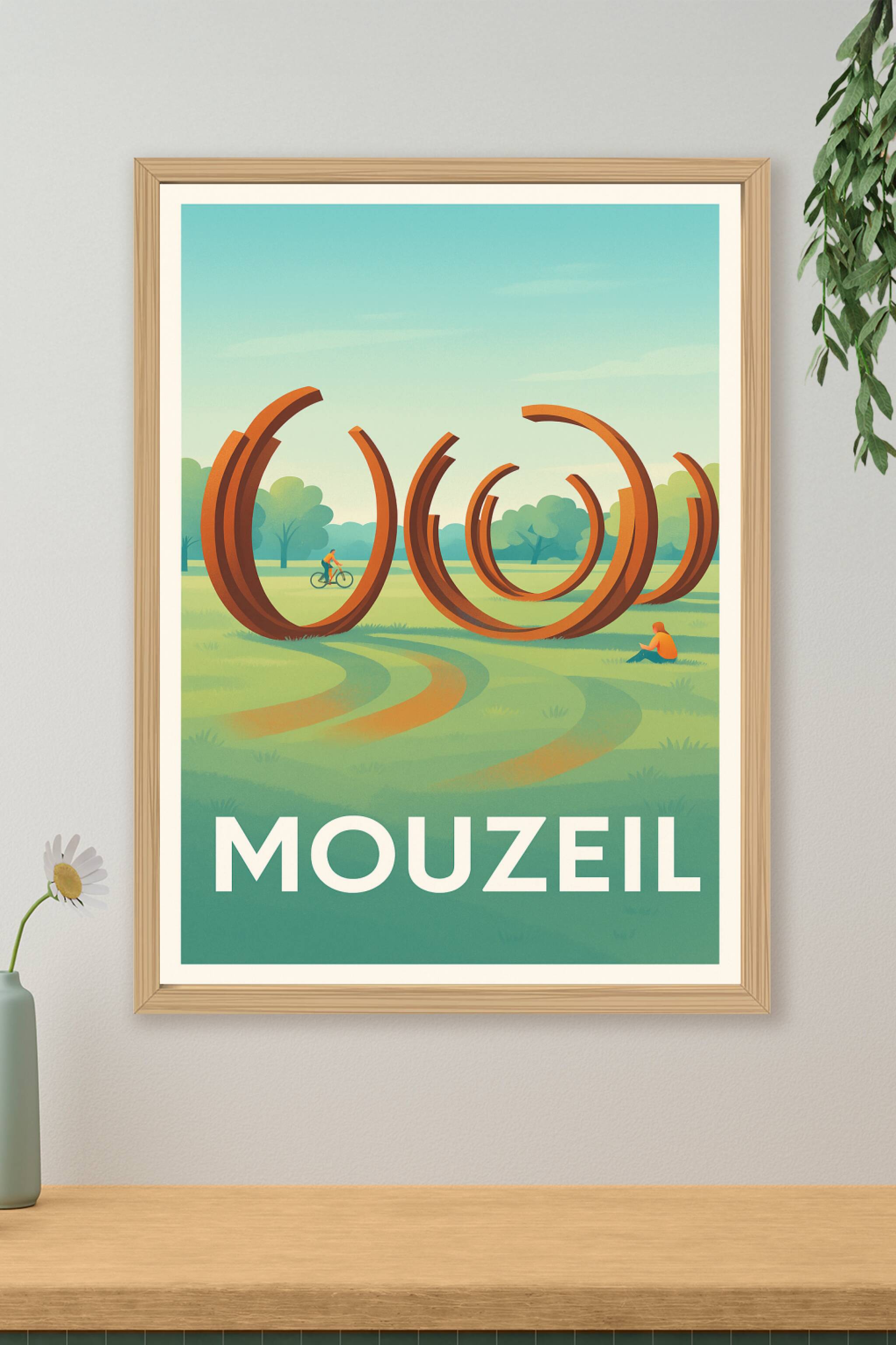 Découvrez la sérénité de Mouzeil avec cette affiche artistique qui met en lumière les sculptures circulaires au cœur d'un paysage verdoyant. Ce pos...