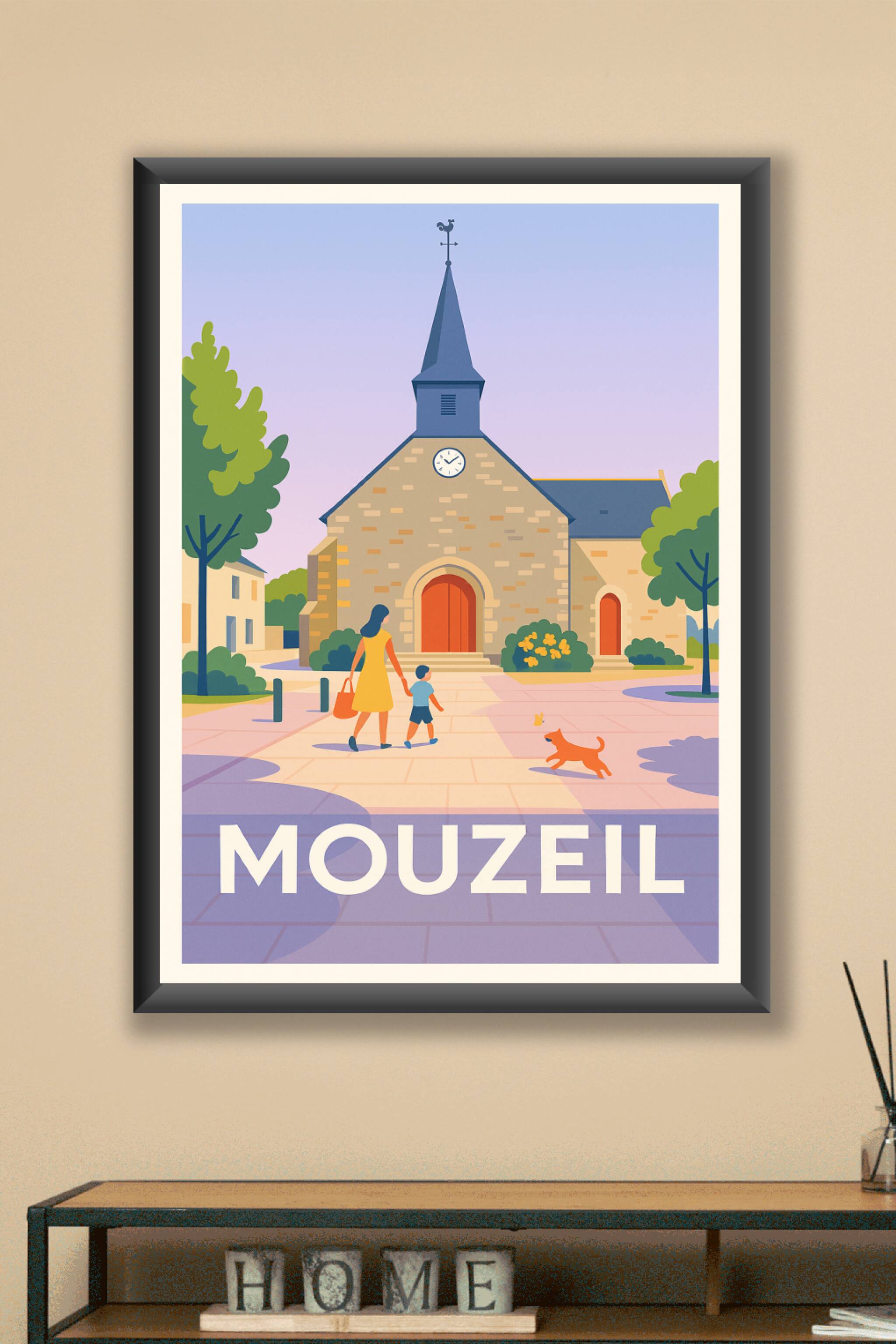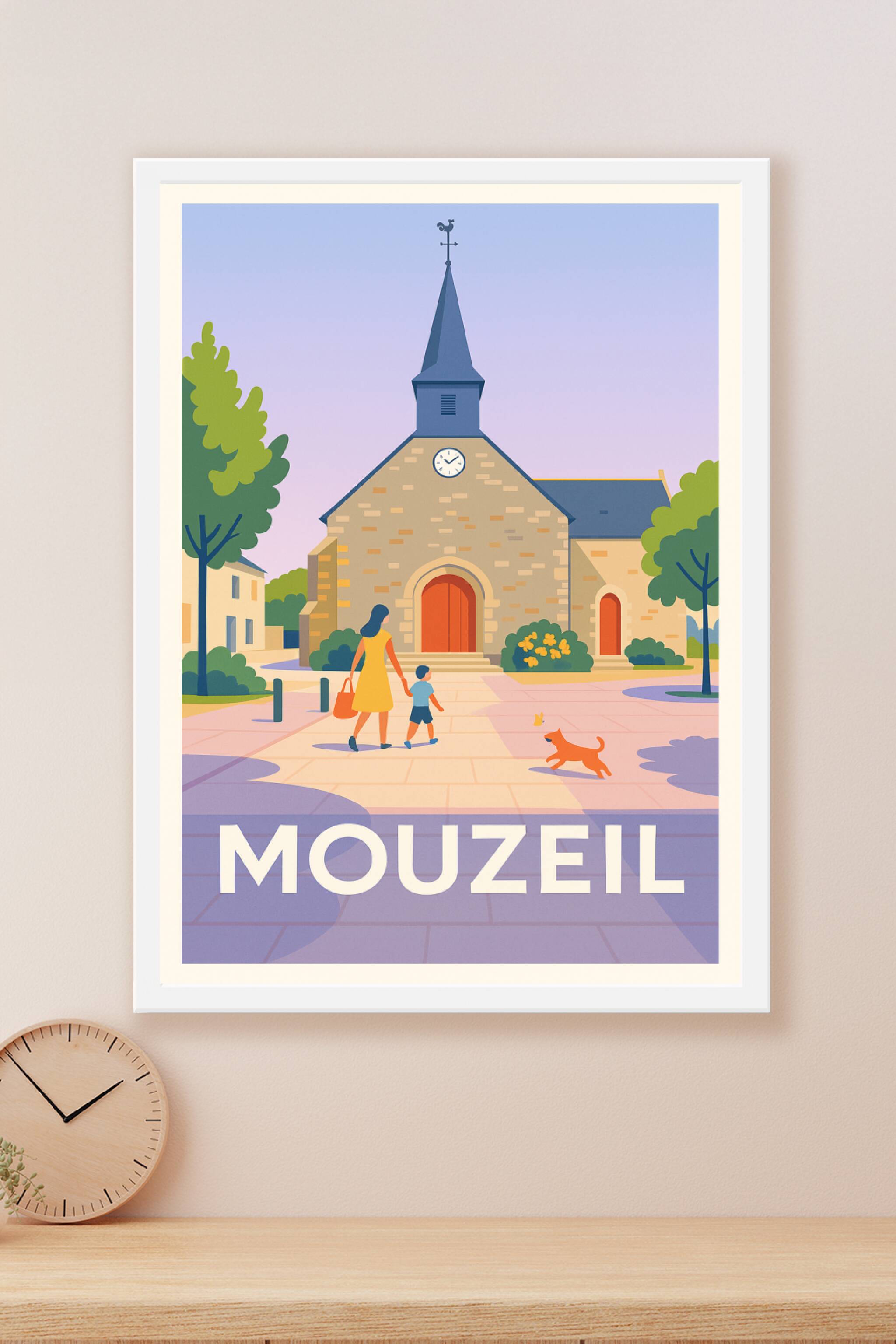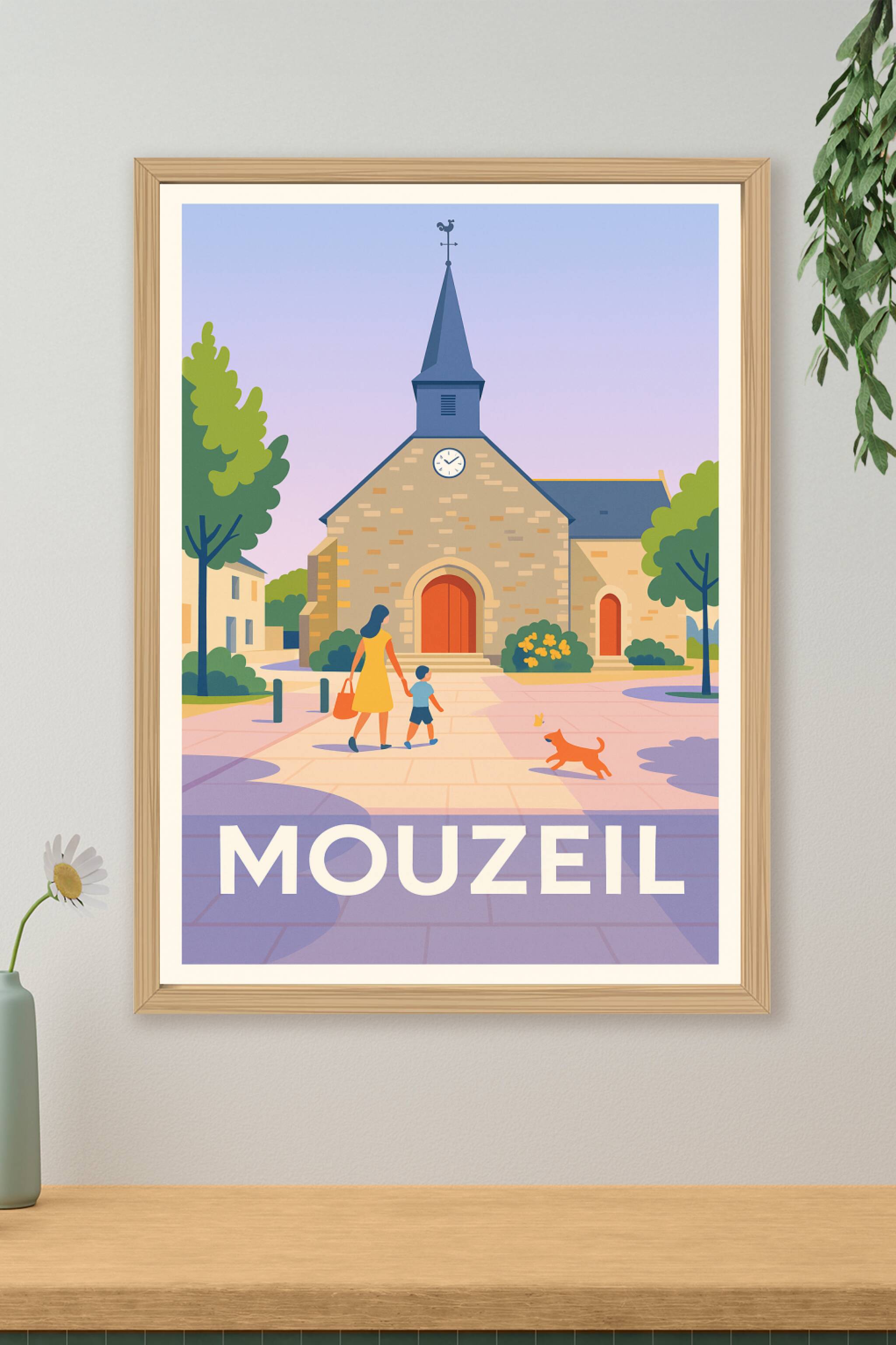 Découvrez l'atmosphère paisible et conviviale de Mouzeil à travers cette affiche illustrée dans un style épuré et chaleureux. On y voit une église ...