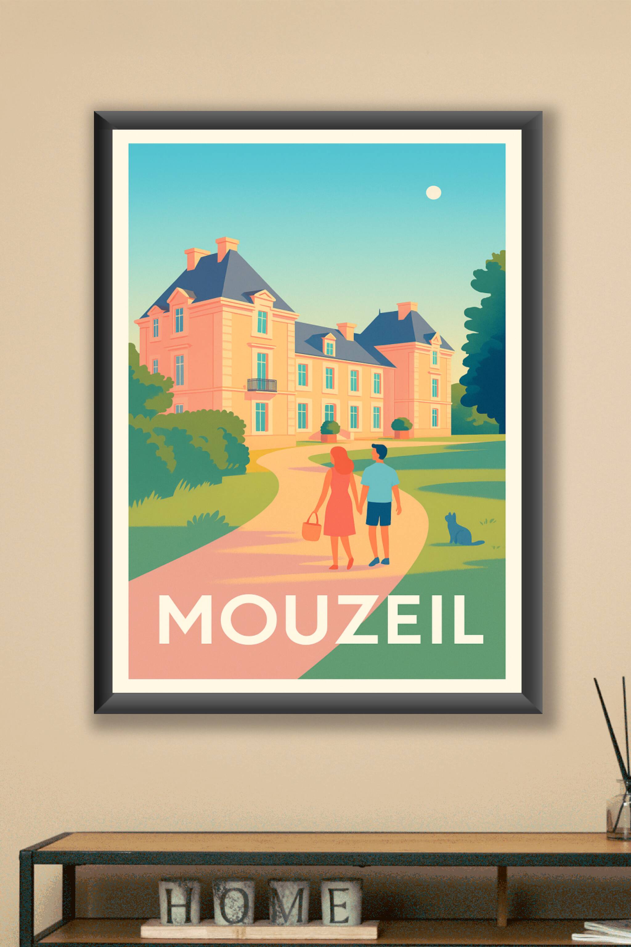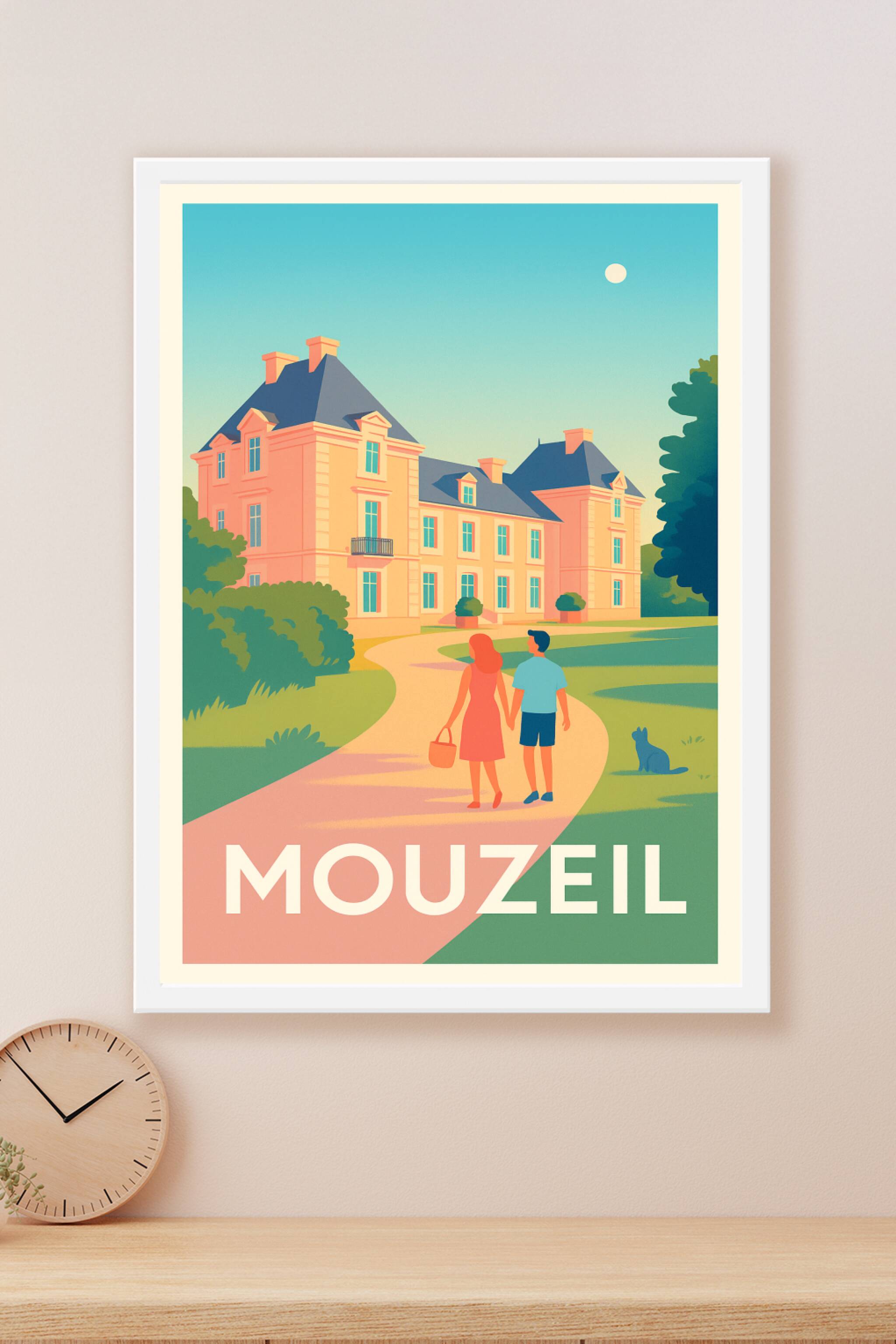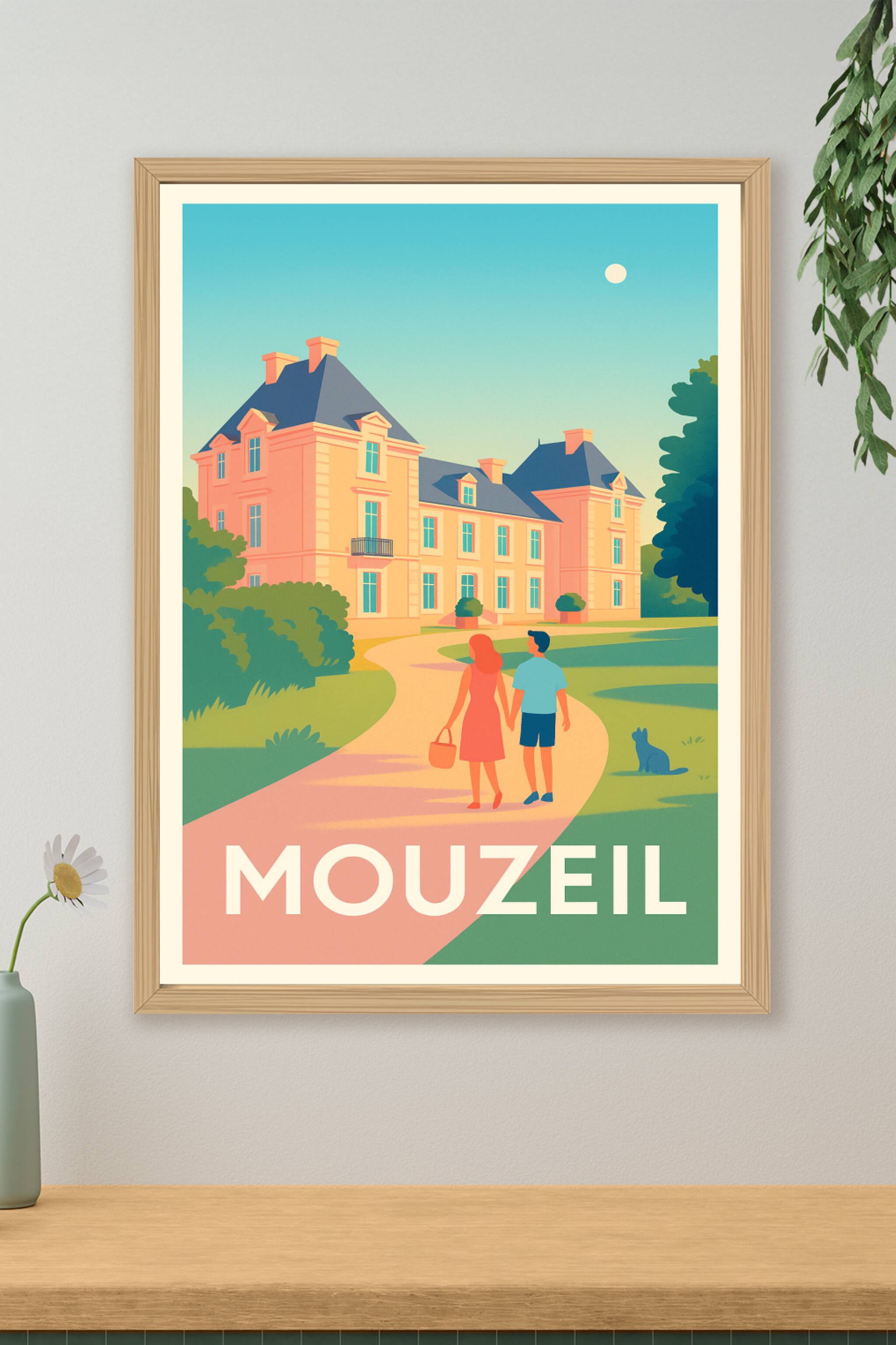 Découvrez Mouzeil à travers cette affiche captivante illustrant une balade paisible au cœur d'un château élégant, baigné par la lumière douce d'un ...