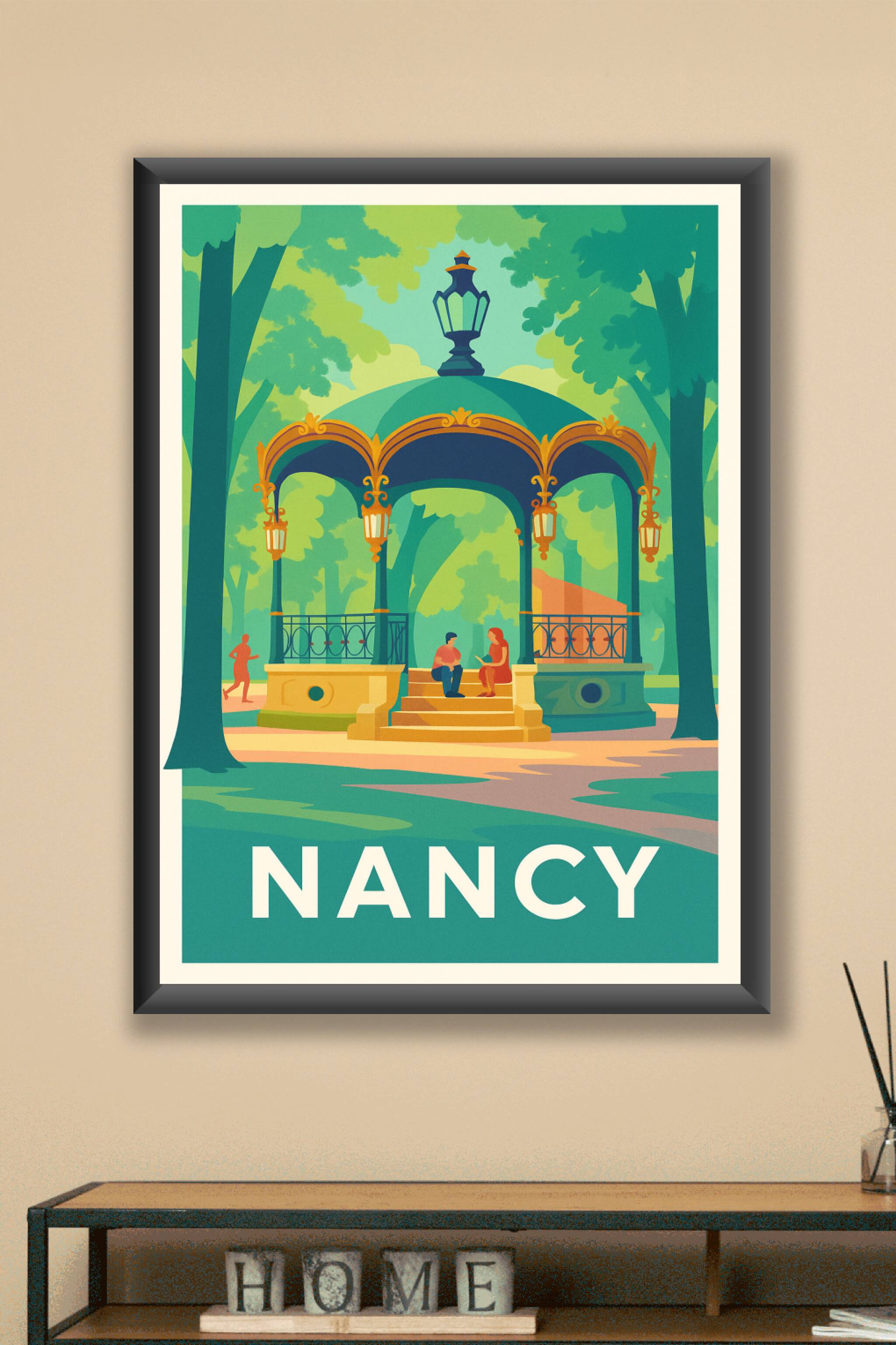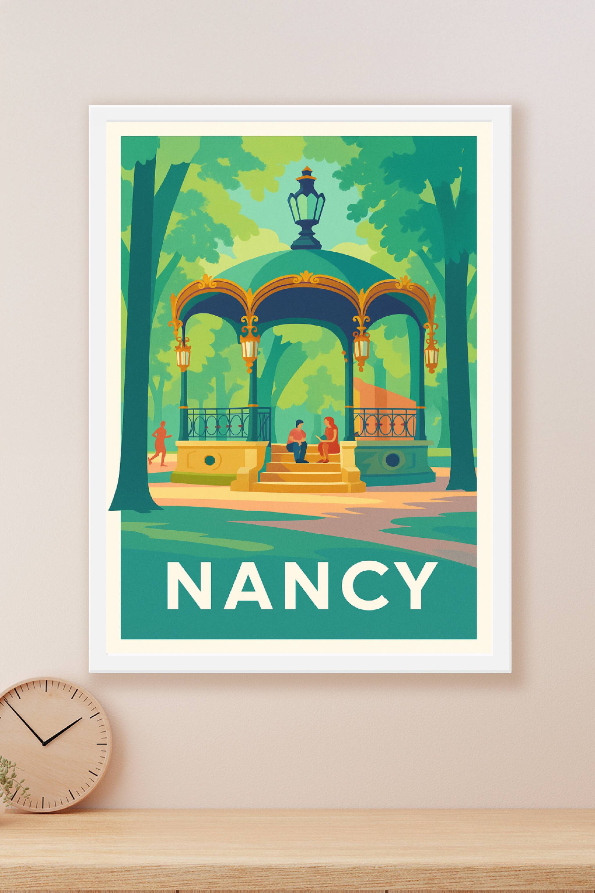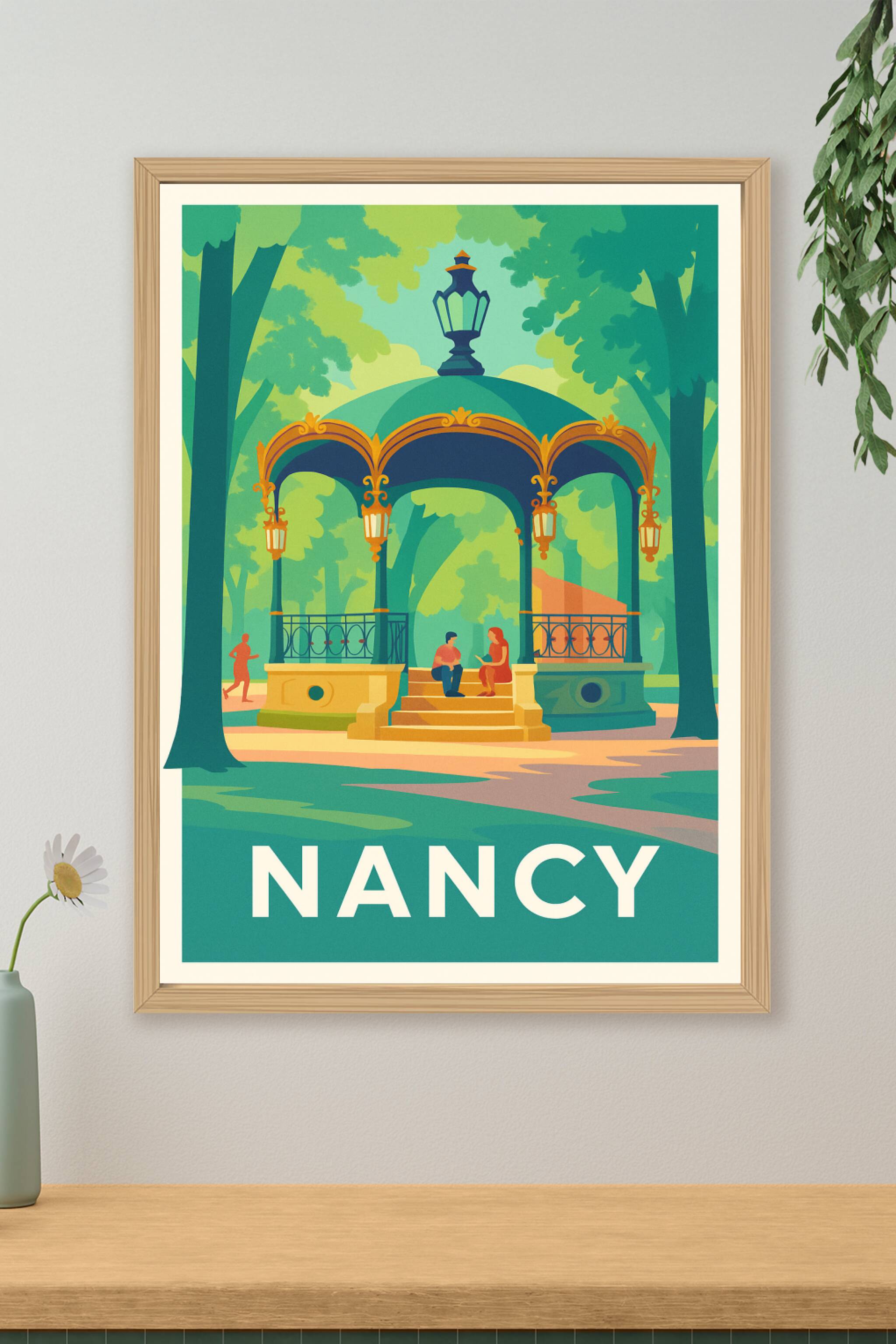 Découvrez la douceur et le charme verdoyant de Nancy avec cette affiche au style graphique et coloré représentant un kiosque emblématique au cœur d...