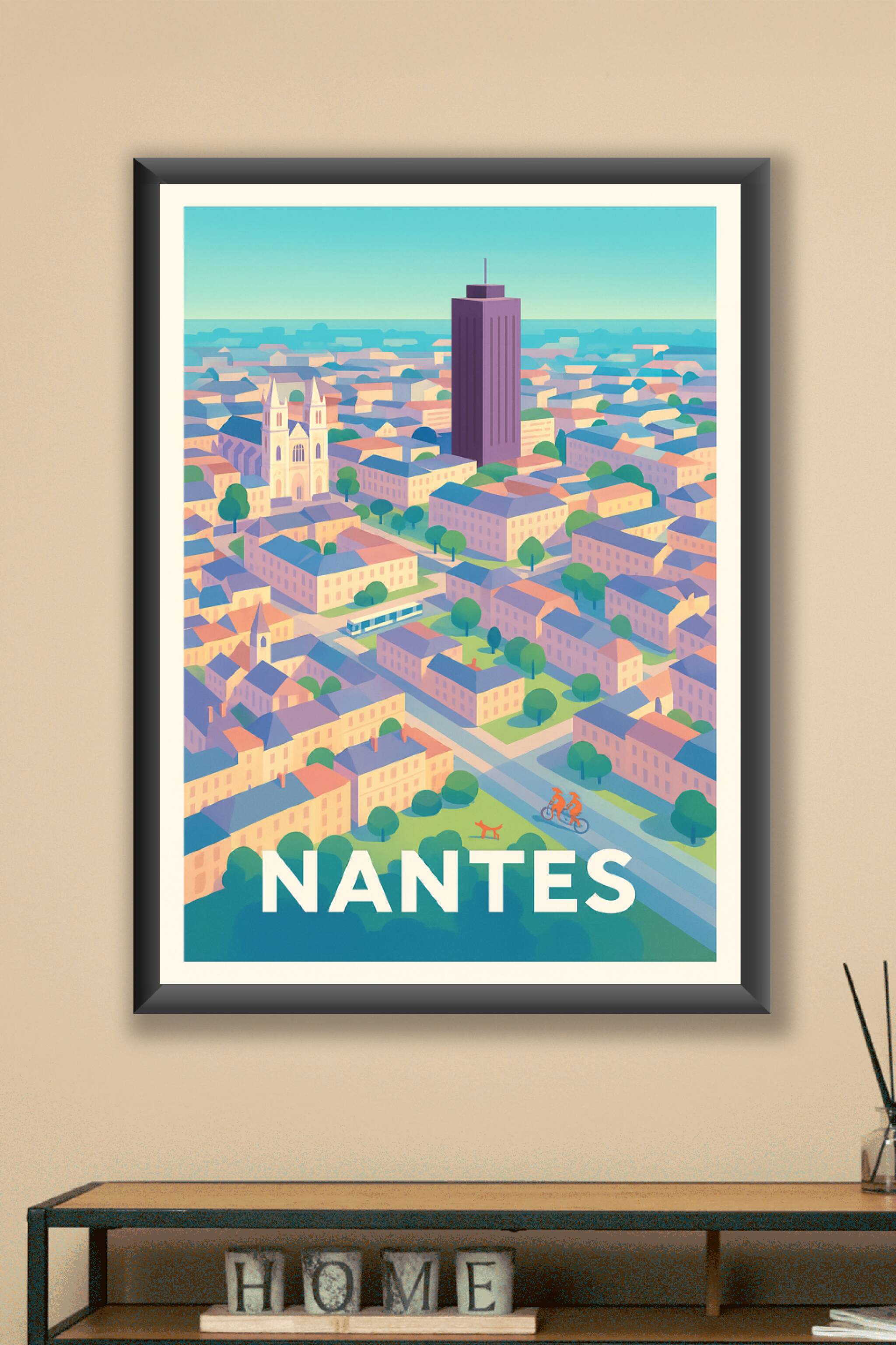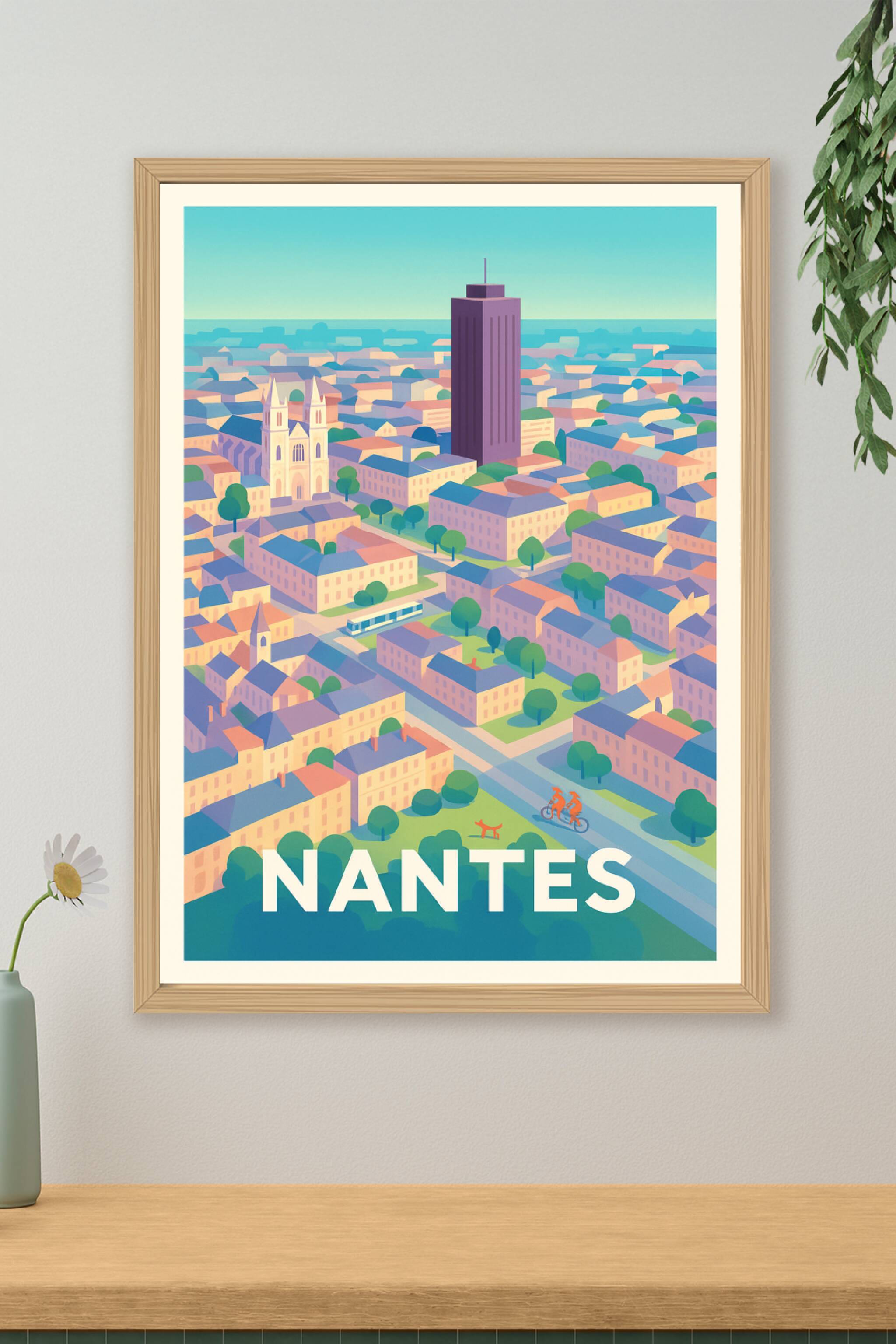 Admirez la ville de Nantes à travers cette affiche au style graphique coloré et doux, mettant en lumière les emblèmes de la métropole comme la Tour...